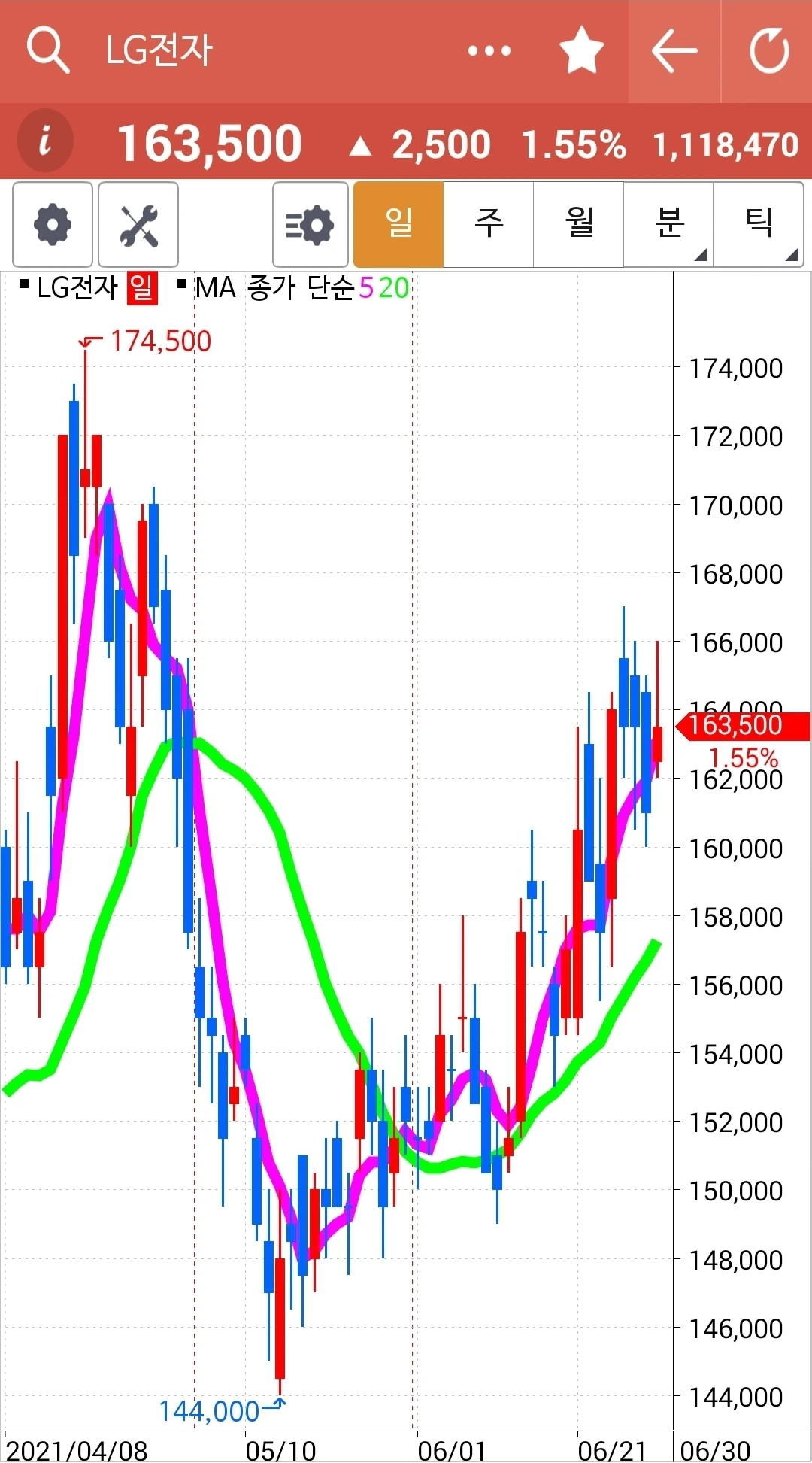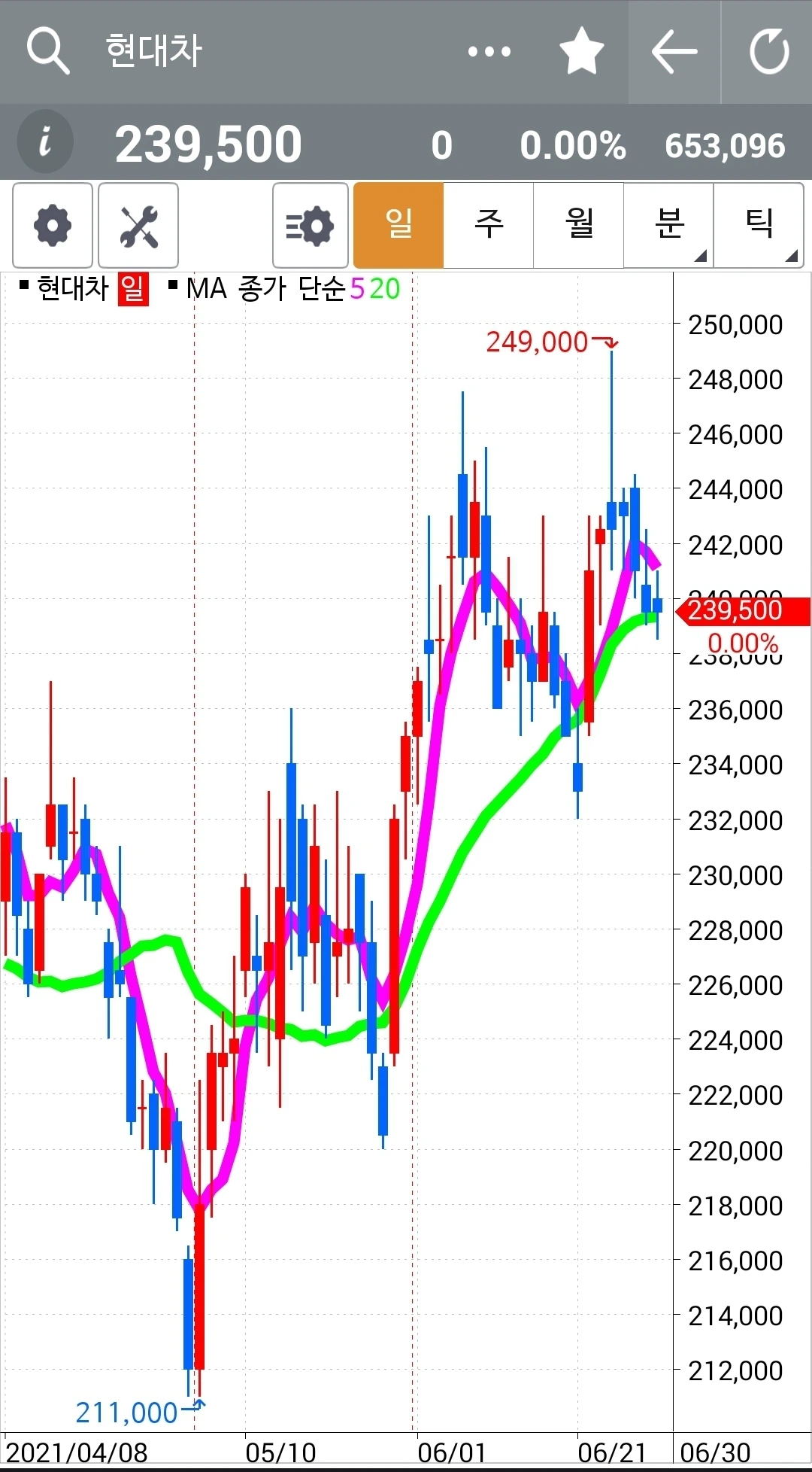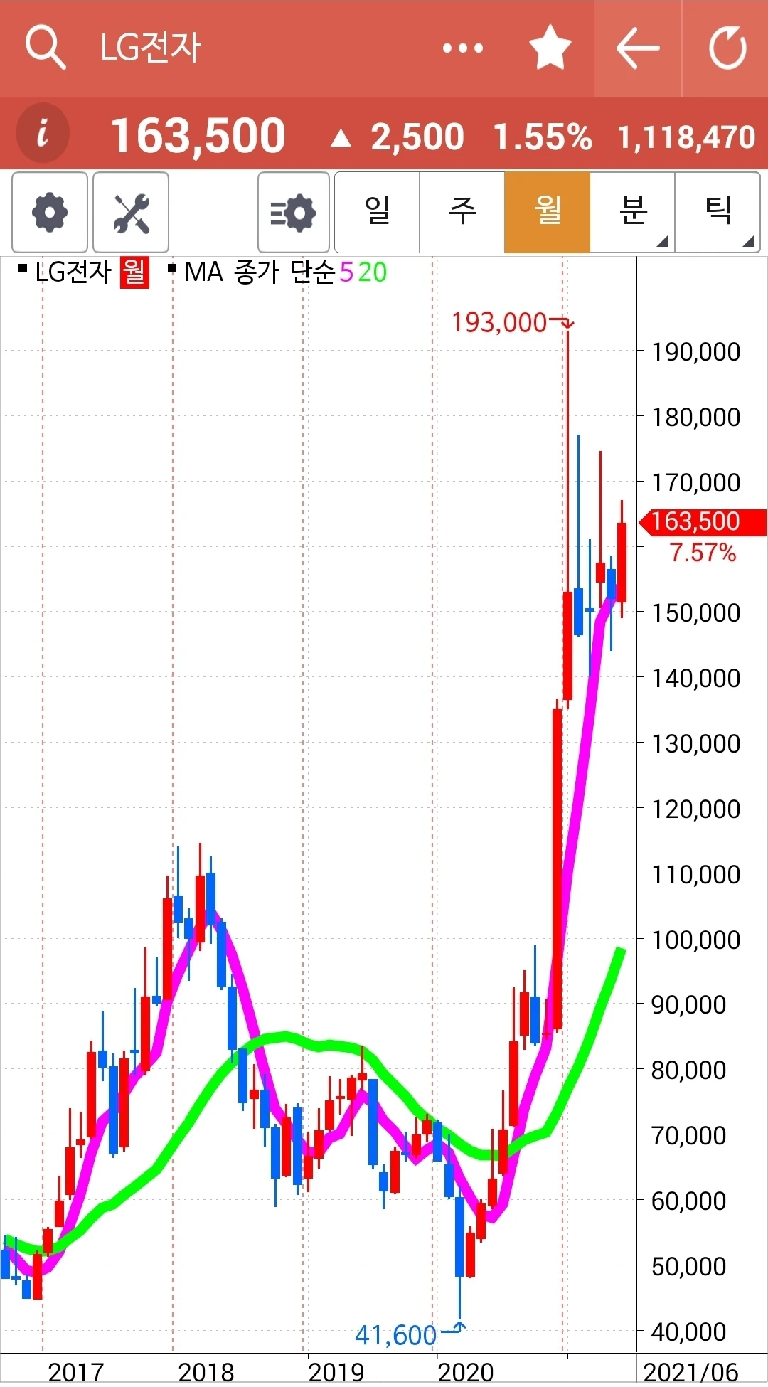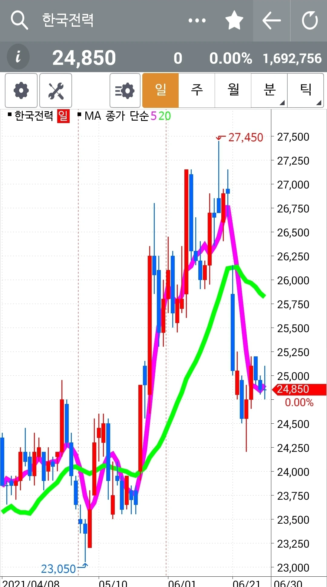 오르려면 좀 빵! 커다란 양봉을 만들거나 밀리지 말거나 하지. 그래도 전일 고점을 뚫었기에 조금 안심이다. 그러나 많이 밀린 것을 보면 조금 걱정도 된다. 어쨌든 일봉 주봉 월봉 모두 5선이 20선 위에 있으니 너무 걱정 말자. 파이팅.