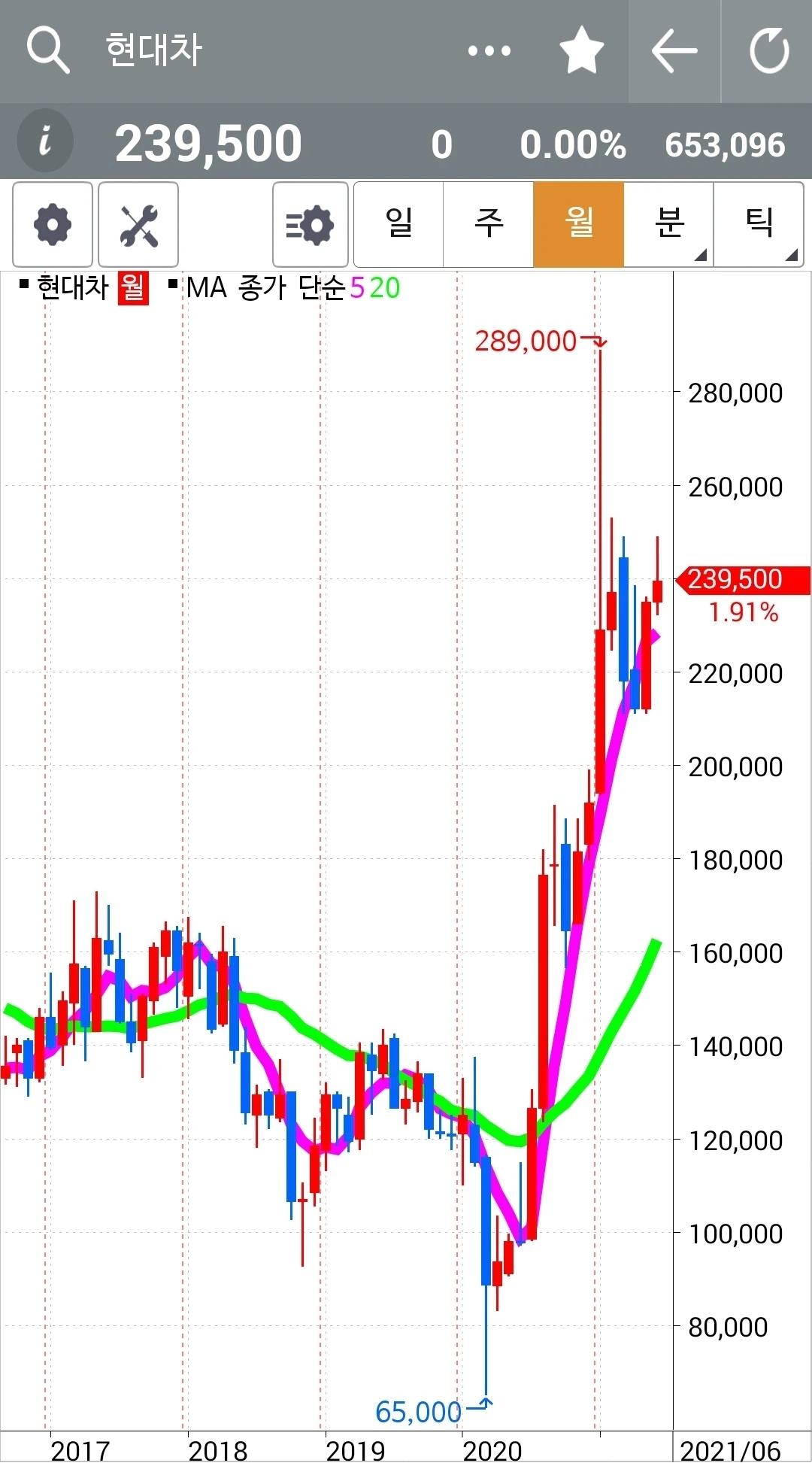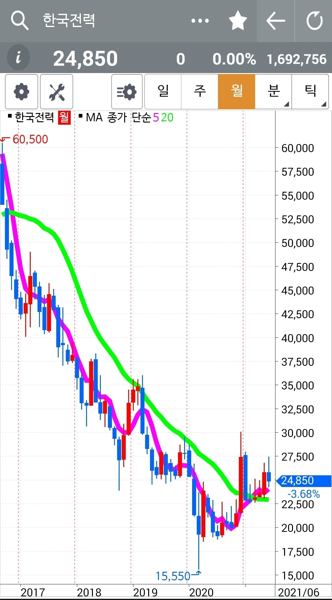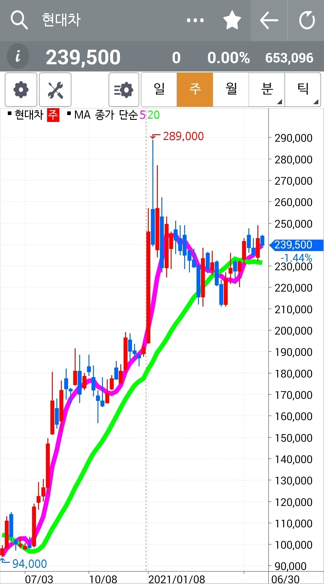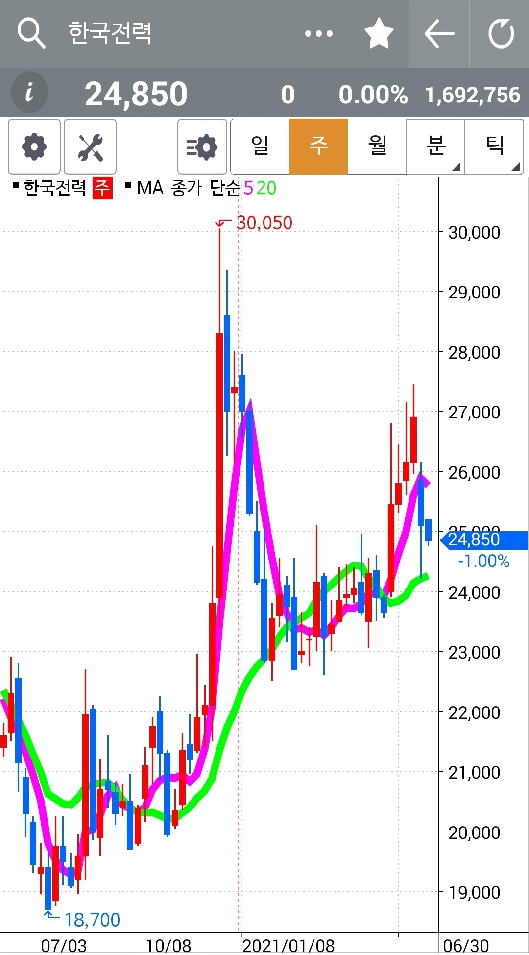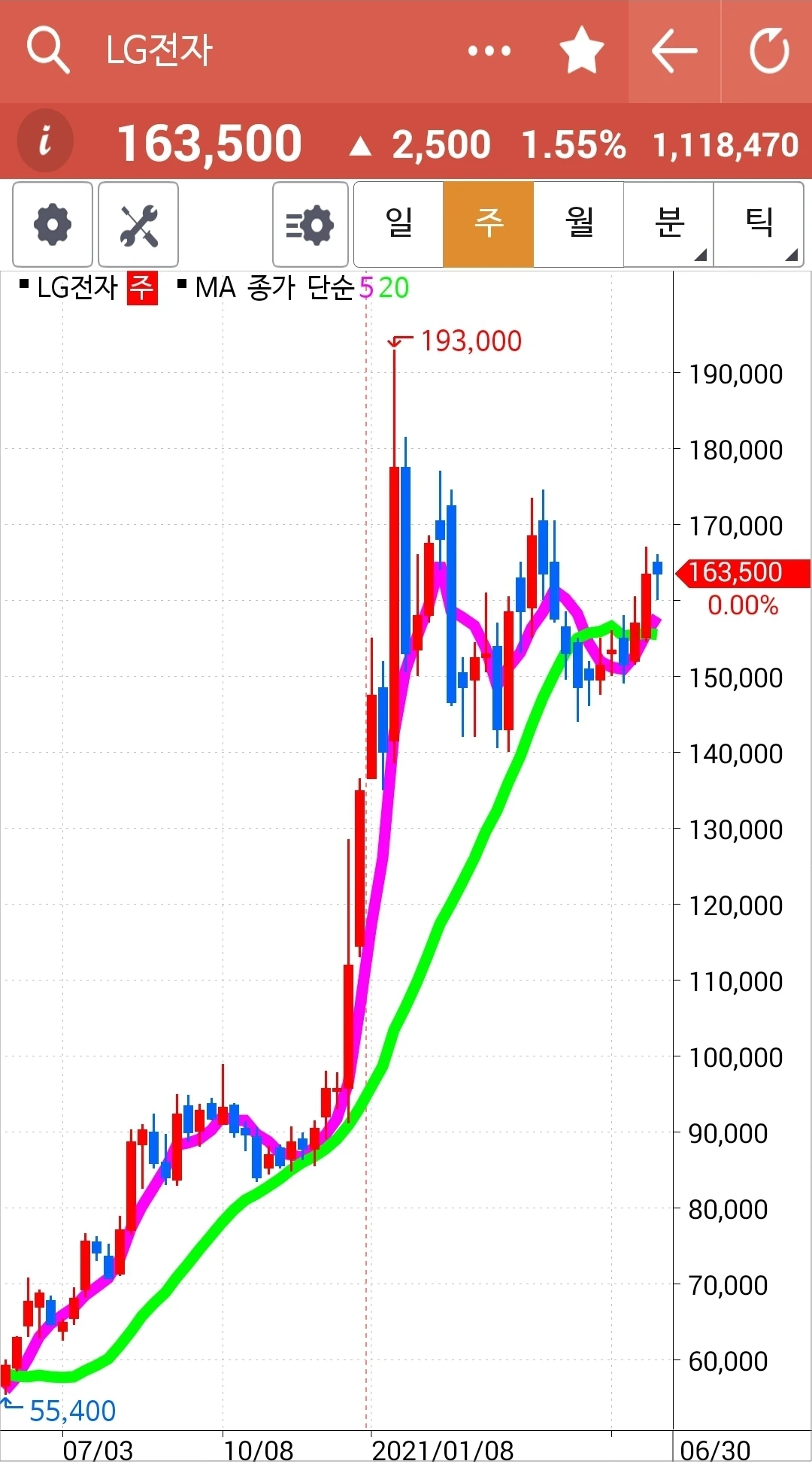 오르려면 좀 빵! 커다란 양봉을 만들거나 밀리지 말거나 하지. 그래도 전일 고점을 뚫었기에 조금 안심이다. 그러나 많이 밀린 것을 보면 조금 걱정도 된다. 어쨌든 일봉 주봉 월봉 모두 5선이 20선 위에 있으니 너무 걱정 말자. 파이팅.