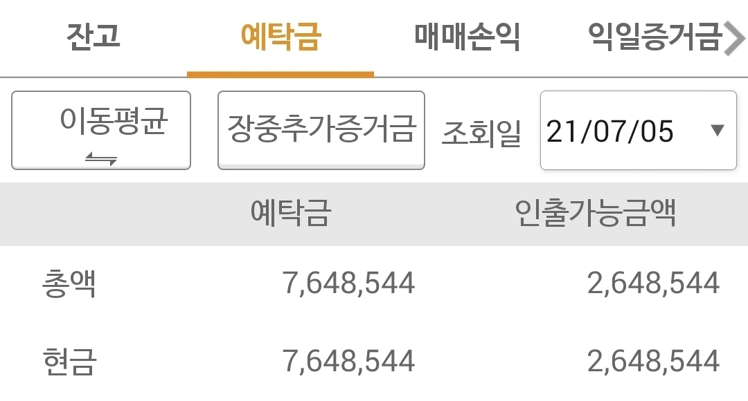 사진 3. 선물 주식 예탁금. 764만 원이라, 850만 원이 원금인데 분발하자.