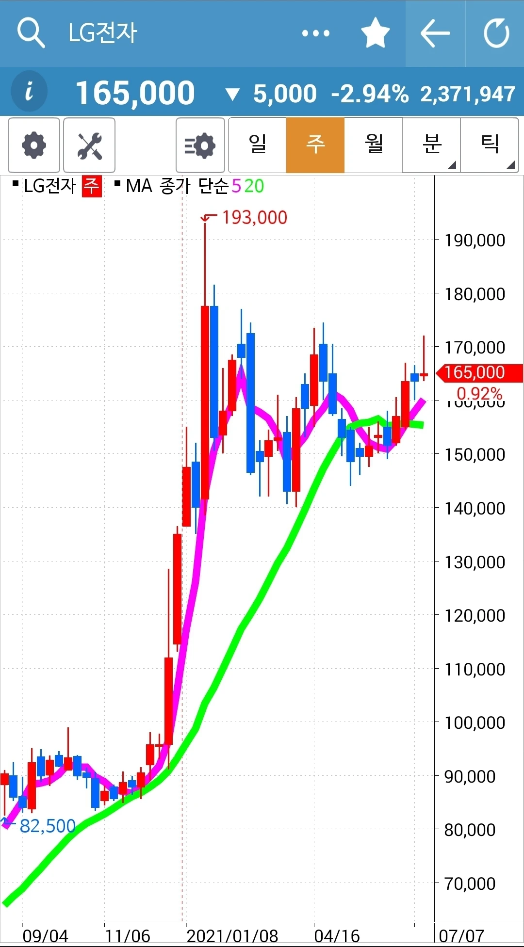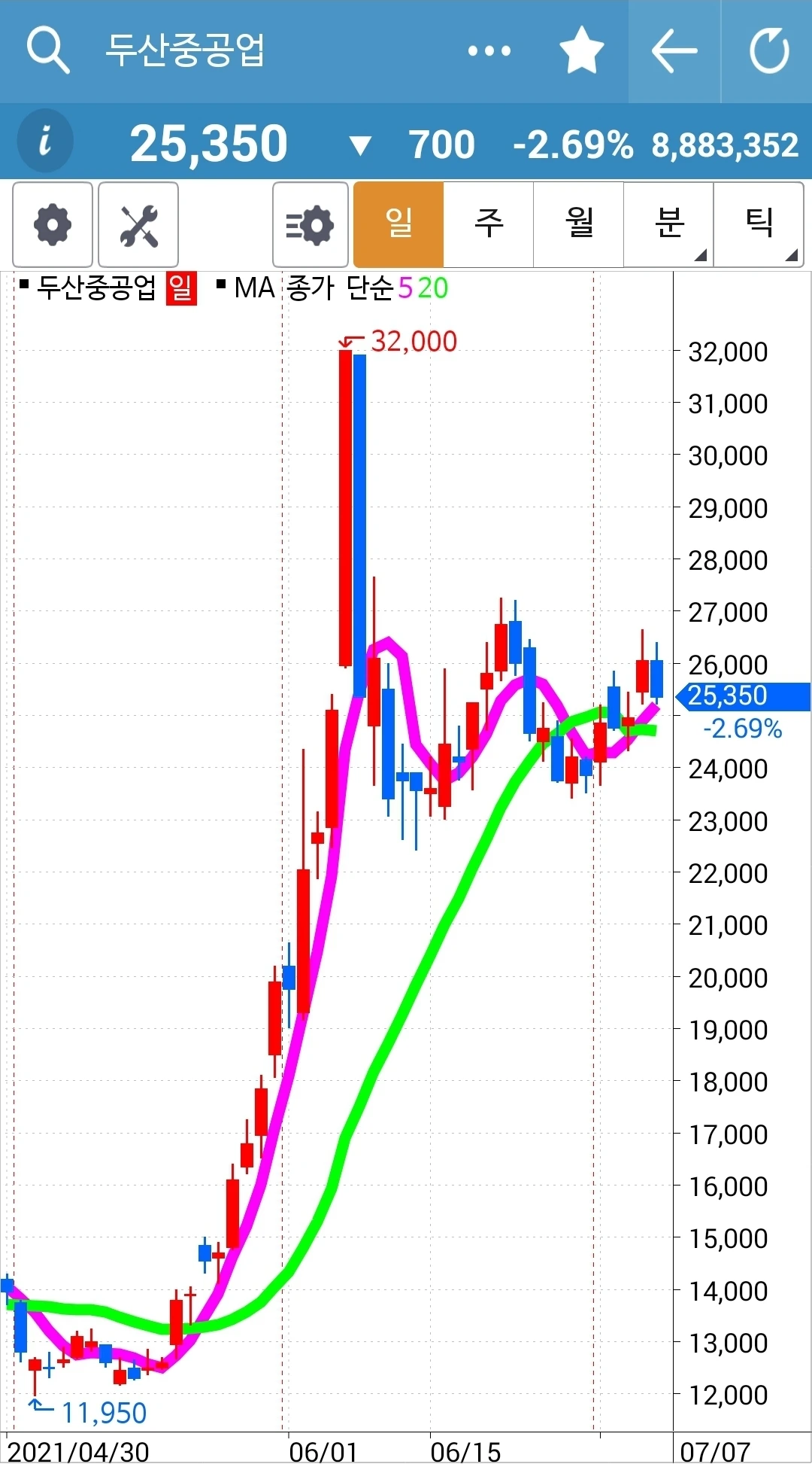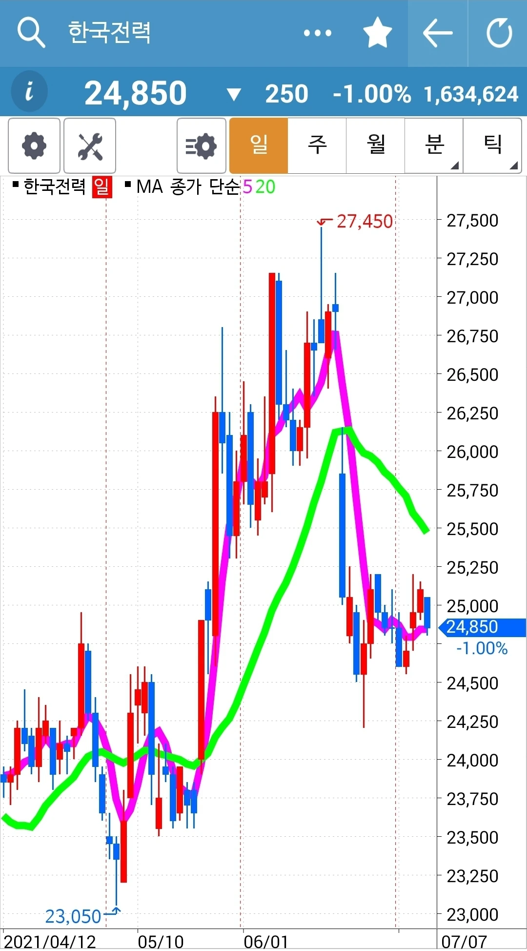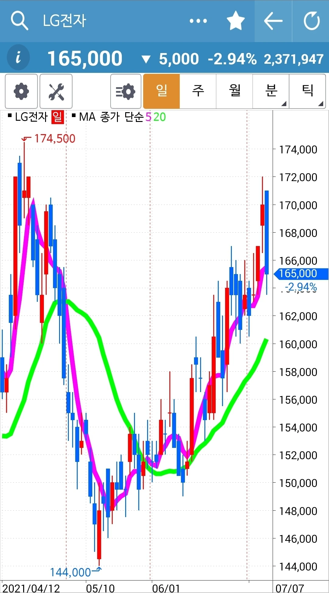 5일선이 20일선 위로 빠꼼히 고개를 내밀었다고 후다닥 들어갔건만 하이고 단 하루 만에 음봉이다. 그래도 5일선이 20일선 깬 건 아니므로 그대로 보유! 힘내라 힘!!!