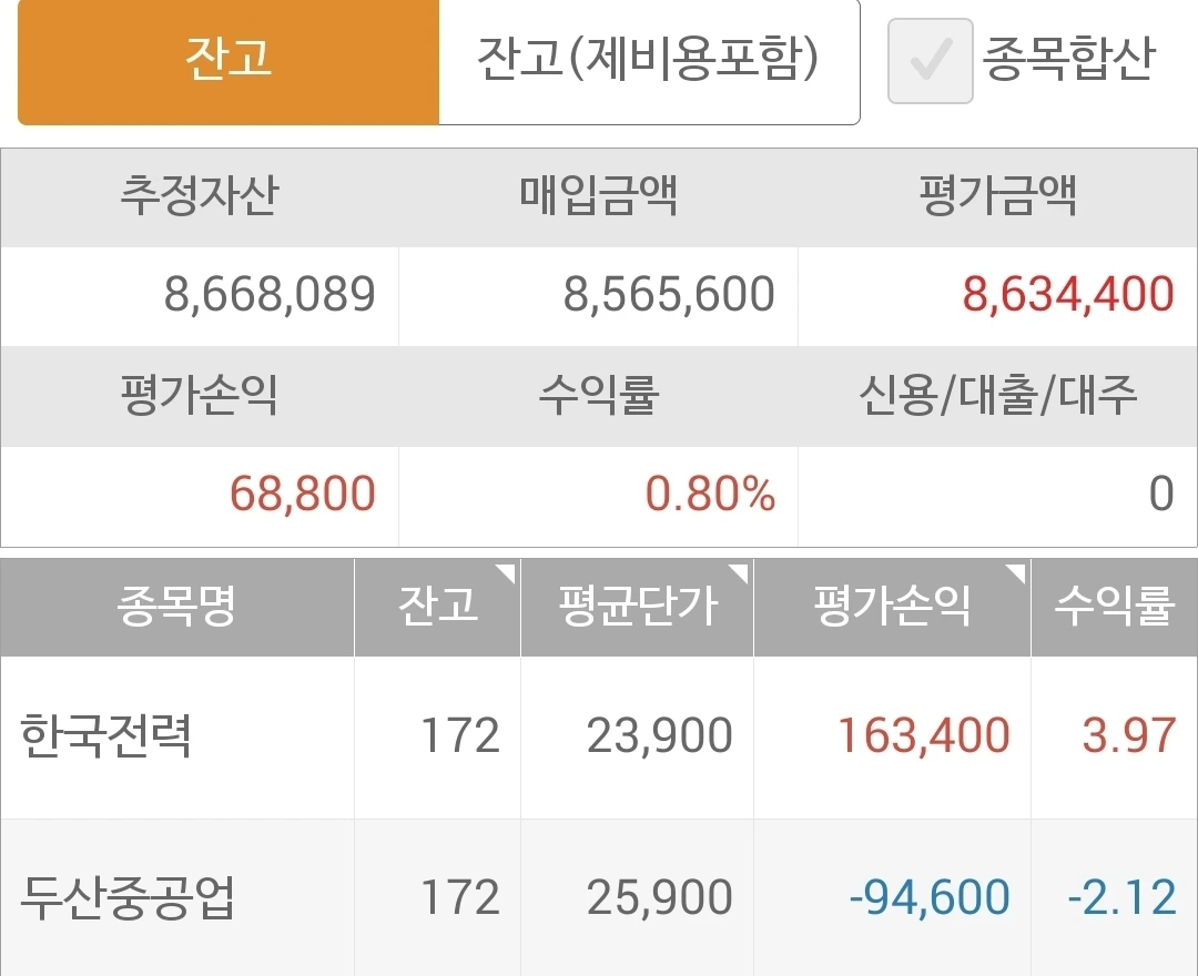 사진 2. 선물주식. 두산중공업을 들어간 게 잘못된 선택일까. 손실로 바뀌었다. 재빨리 이익 났을 때 챙기고 나왔어야 할까. 이익 챙기기를 좀 더 나는 연구해야 한다.