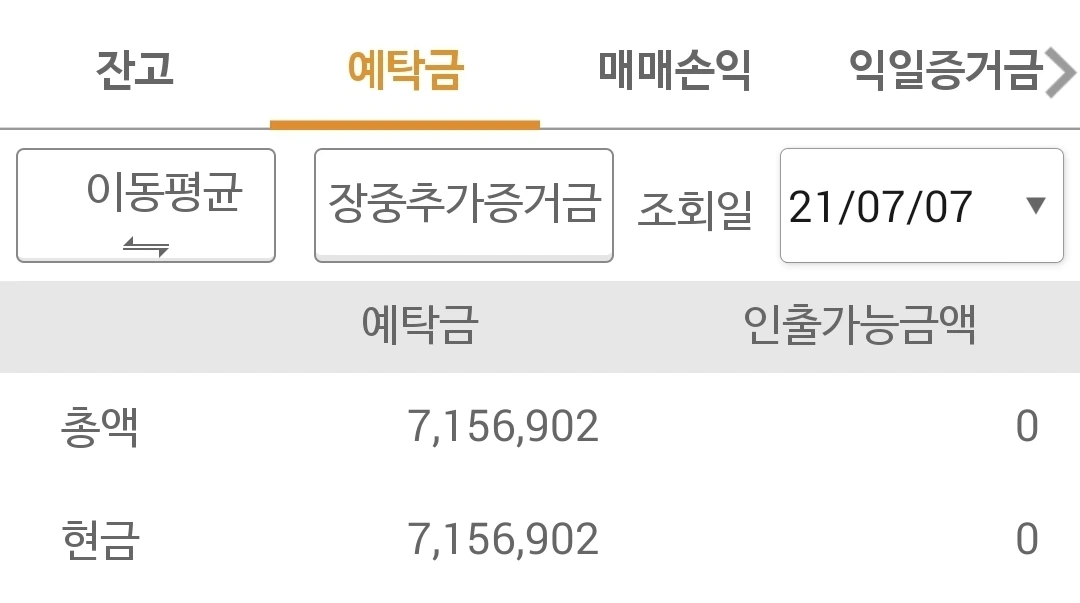 사진 3. 선물주식예탁금. 800만 원대 진입이 가까운 듯했는데 다시 700만 원 대조차 지키기 어려워졌다. 파이팅! 그래도 기죽지 말고 나의 원칙대로. 바로 요거. '난 아무것도 몰라요~ 5일선이 20일선 아래로 가면 매도할 뿐야요~'