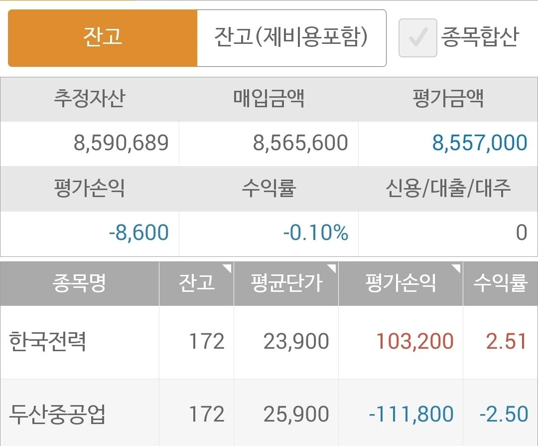 사진 1. 현물 주식. 859만 원. 점점 줄어들고 있다. 힘내자. 파이팅!
