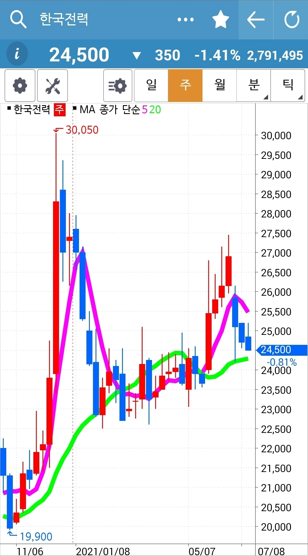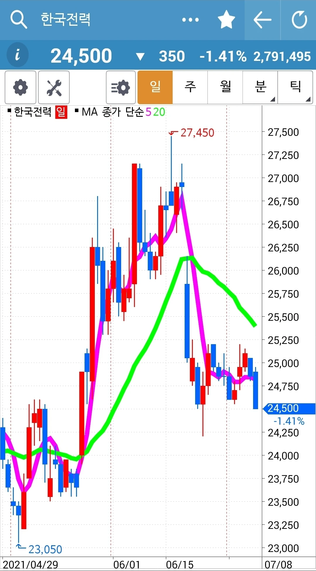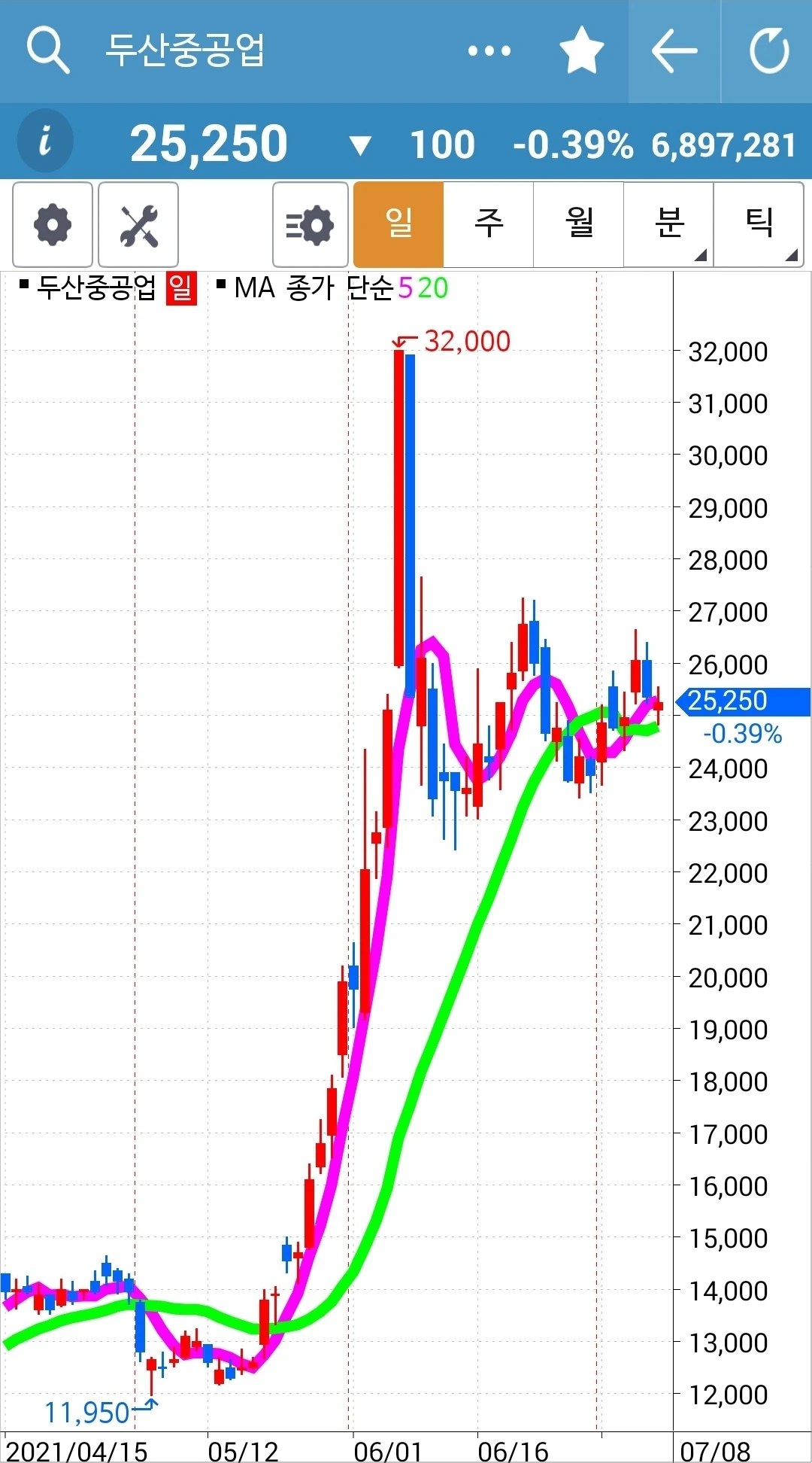 충동적으로 들어간 이 종목. 선물은 그대로 정리되는 통에 많은 손실을 보았다. 그러나 현물 주식은 기다려줄 수 있다. 일봉에서 아직 5일선이 20일선 위에 있기에 가지고 있을 이유가 충분하다. 파이팅!!!