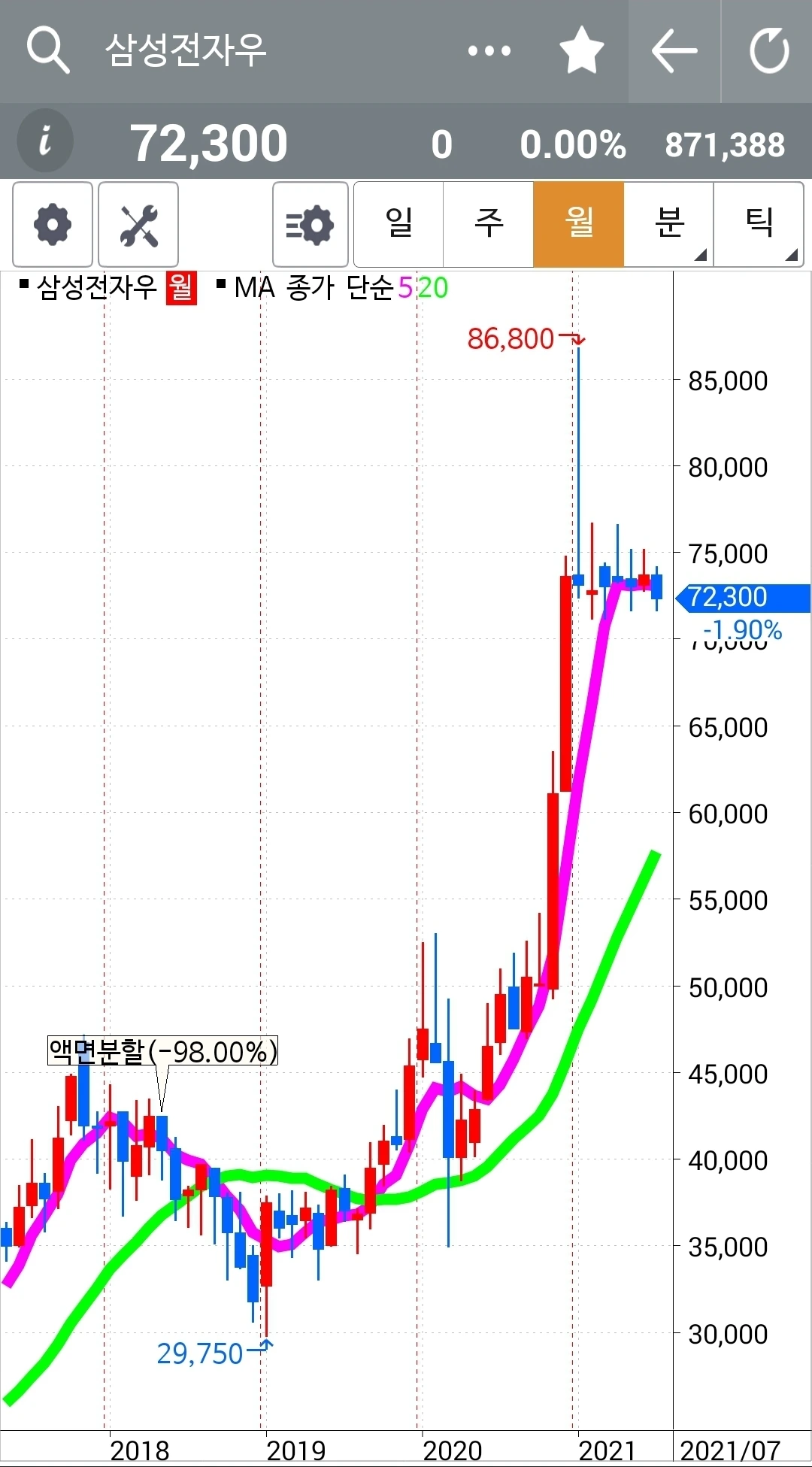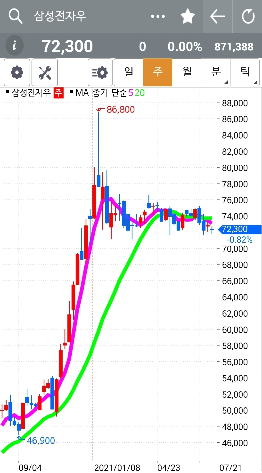 나는 참 팔랑 팔랑귀다. 아니 난 참 상대방에게 설득을 잘 당한다. 아니 난 참 상대방 말을 잘 듣는다. 그렇다. 나는 꽤 젊은 후배와 함께 오랜 시간 대화를 나누게 되었다. 미국에서 공부하고 쌩쌩한 그 젊은이는 회사를 박차고 나와 주식을 전업으로 하고 있다. 전력을 다해 그걸로 돈을 벌고 있다. 직장인과 마찬가지로 그걸로 생활비를 번다는 것이다. 대단한 용기로 생각되었기에 귀 기울여 들었다. 여러 분야로 나눠서 하지만 그중 하나가 저축처럼 투자하는 거란다. 그게 나의 마음을 확 끌었다. 본인은 손절매에 약한 것 같아 손절매하지 않는 방법을 택했다는 이야기다. 앗, 나는 손절매를 하지 못해 그 손절매하는 훈련 중인데. 아, 발상의 전환. 나는 보면 참으로 손절매가 힘들다. 그래서 난 기계다 운운하며 난 아무것도 몰라요 운운하며 지극히 단순하게 룰을 정해놓고 그 룰따라 손절매를 칼같이 하는 훈련 중이다. 그런데 그 후배의 말도 지극히 일리가 있지 아니한가. 손절매를 못한다면 저축 수단으로 배당금 받아가며 장기투자를 한다면? 그럼 굳이 손절매를 하지 않아도 되지 않을까? 그렇다면 매매 자체가 없게 되는 걸까? 길게 봐야 하니까? 여하튼 한국전력을 월봉기준으로 일봉이 무너져도 가지고 있었듯이 한번 그가 하는 많은 방법 중의 하나를 해보련다. 삼성전자 우선주를 골랐다. 마음이 급하다. 두산중공업의 5일선이 20일선 아래로 곤두박질치고 있다. 미련 없다. 칼같이 매도. 그리고 그 후배와 이야기하던 삼성전자 우선주를 샀다. 그런데 곤두박질치던 두산중공업은 다시 쭈욱 올라와 5일선이 20일선 위로 올라왔다. 분명히 뚫고 내려간 걸 보고 매도했는데 단일가에는 올라와 5일선 위에 있게 된 것이다. 그래도 나의 손가락은 이미 나갔다. 난 분명히 아래로 뚫었을 때 매매했다. 그리고 그 현금을 몽땅 삼성전자 우선주를 샀다. 이거야말로 아직 5일선이 20일선 아래 있는데도 말이다. 손절매를 안 하고 저축의 대용으로 하려면 5일선이 20일선 위로 가기를 기다리면 너무 가격이 높아진다. 이런 방법의 투자는 최대한 싸다고 생각될 때 들어가야 하는 것이다. 그러므로 지금 당장 들어갔고 내려가면 더 사는 방법이다. 팔랑팔랑 나의 귀는 홀라당 나의 대원칙을 내팽개치고 그의 말 따라 매매한다. 하하 어떠랴. 내킬 때 그 어떤 방법도 해보는 거지. 대신 선물주식은 나의 대원칙 '난 아무것도 몰라요~ 5일선이 20일선 아래로 내려가면 매도할 뿐야요~'를 반드시 지킬 것이다. 나의 현물 주식은 매매가 별로 없을 것이다. 새 방법으로 해보는 거다. 대신 차트를 보며 그런 방식이 통하는가 여부를 지켜보도록 한다. 파이팅!!!
