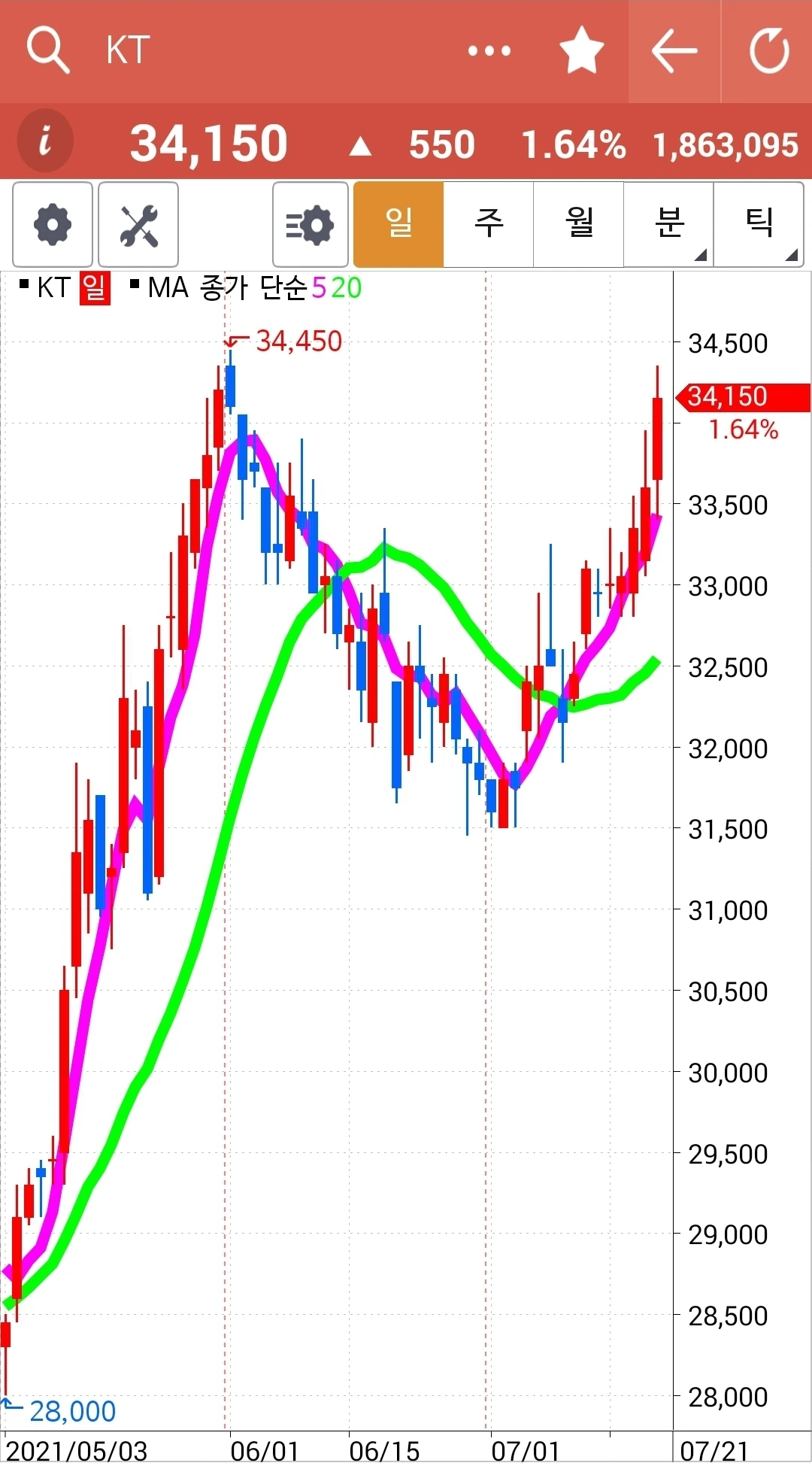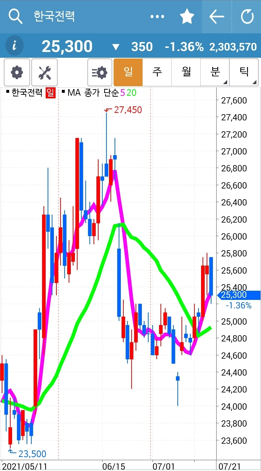 보기 좋게 올라가고 있다. 그러나 이건 선물주식이니 5일선이 20일선 아래로 내려오면 매도해야 한다. 아니, 선물주식이니 시뻘걸 때 이익을 챙겨야 하지 않을까? 앗, 모르겠다. 복잡해지면 안 된다. 이것저것 모를 때는 원칙 지키기. '난 아무것도 몰라요~ 5일선이 20일선 아래로 내려가면 매도할 뿐야요~'