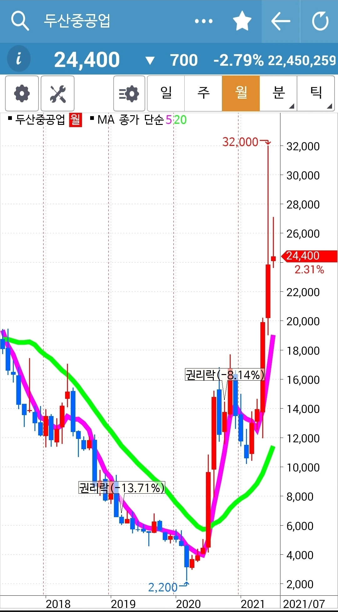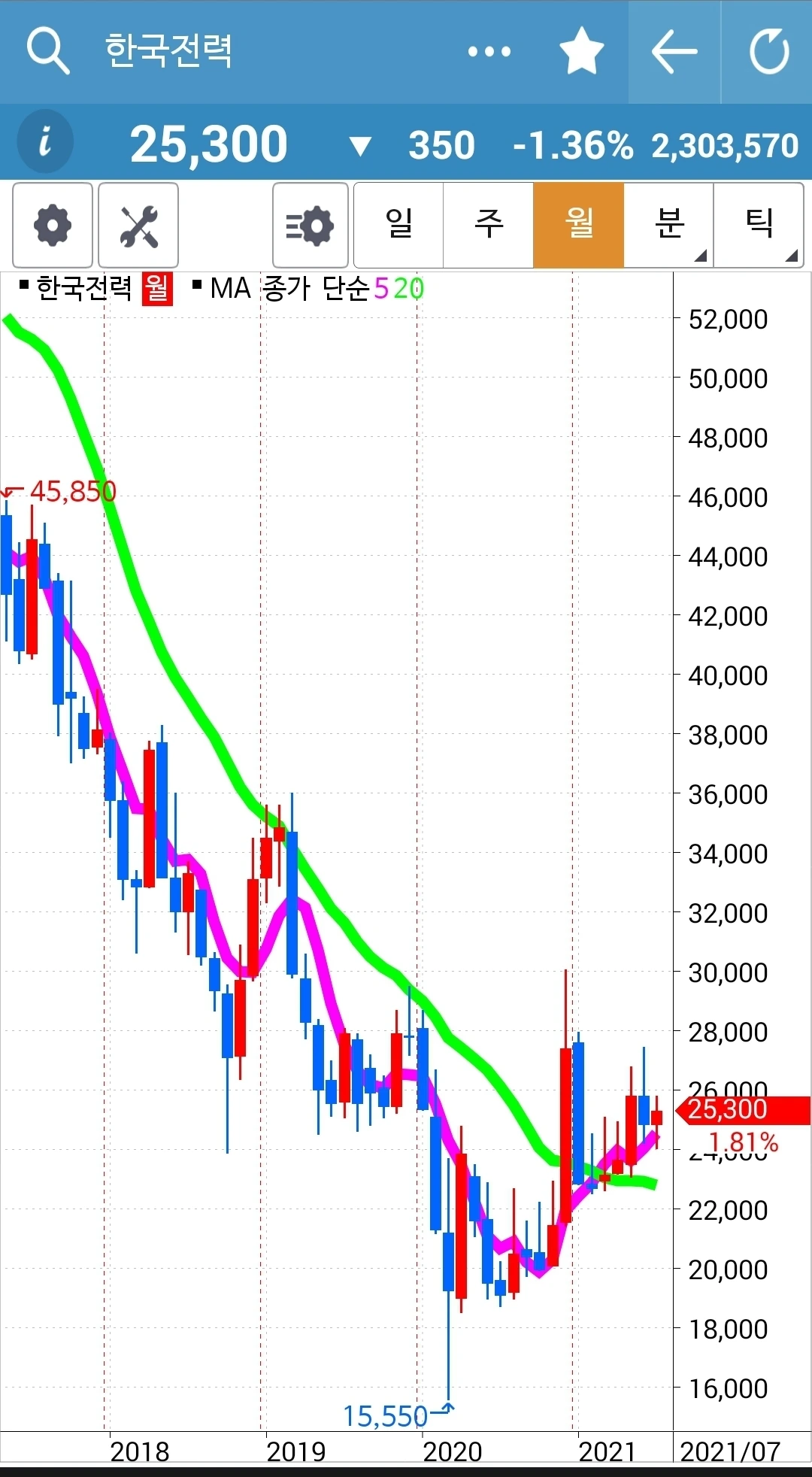 전일 고점을 뚫지 못하고 저점을 깨고 마는 음울한 음봉이 나왔다. 그래도 난 이걸 현물 주식에선 건드리지 않는다. 와이? 현물 주식에선 월봉이 무너지지 않는 한 가져가 보려는 생각이니까. 후배 말을 따라한 게 아니라 그냥 내가 월봉으로 투자에 들어간 것이다. 들어간 원칙은 지켜져야 한다. 그러므로 월봉이 무너지지 않는 한 현물에선 가지고 가리라. 파이팅!!!
