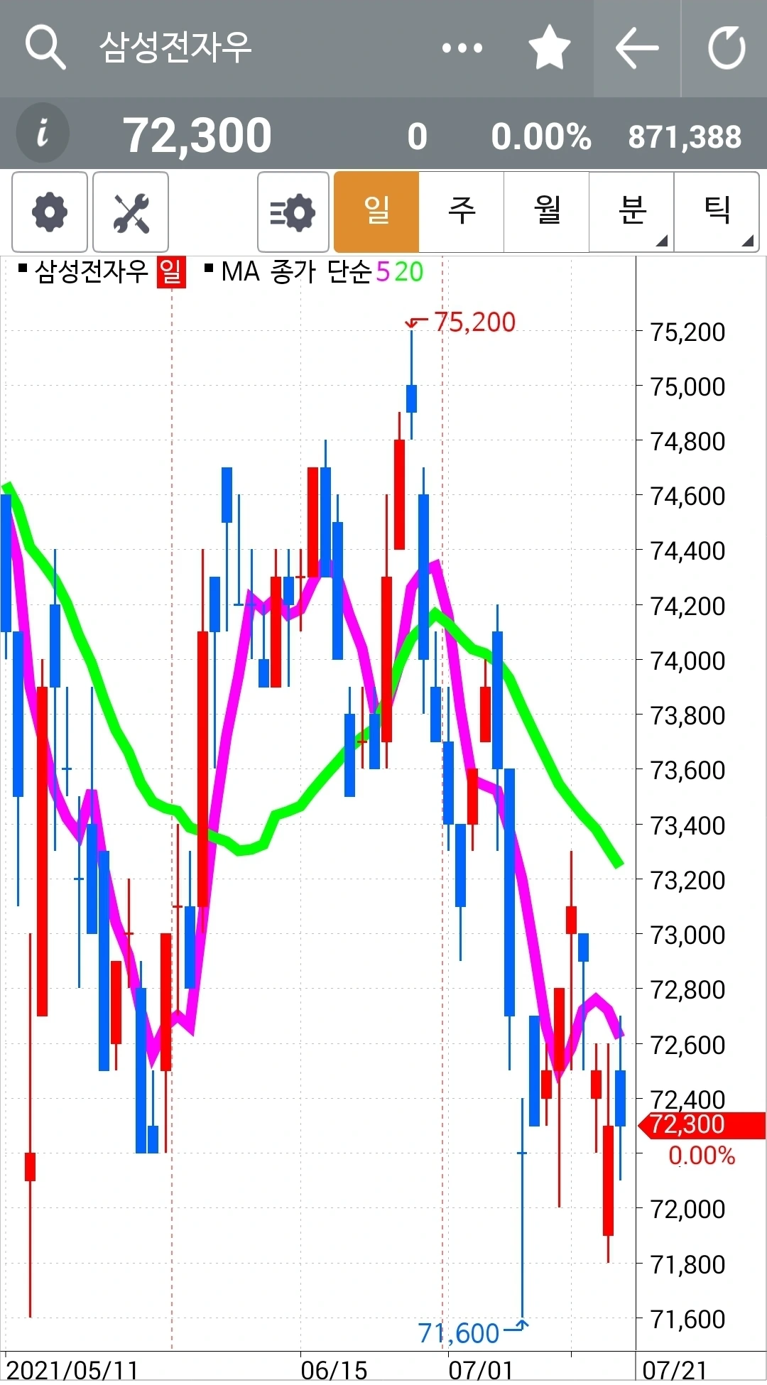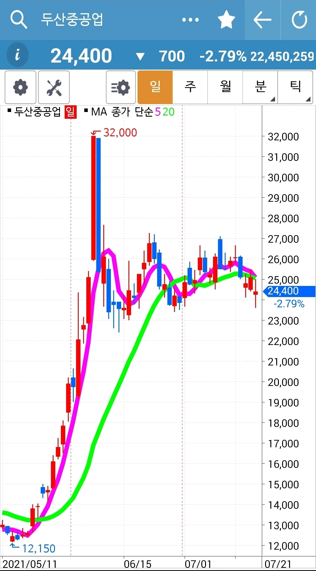 장 거의 끝날 때까지 1,200원 1,300원 마이너스였는데 순식간에 마이너스 700원으로 올라버렸다. 그러면서 무너졌던 5일선이 다시 위로 올라갔다. 나의 손가락은 이미 튕겨져 나갔다. 할 수 없다. 결심했으면 실행해보는 것도 오케이! 호기심천국은 그래야만 한다. 푸하하하