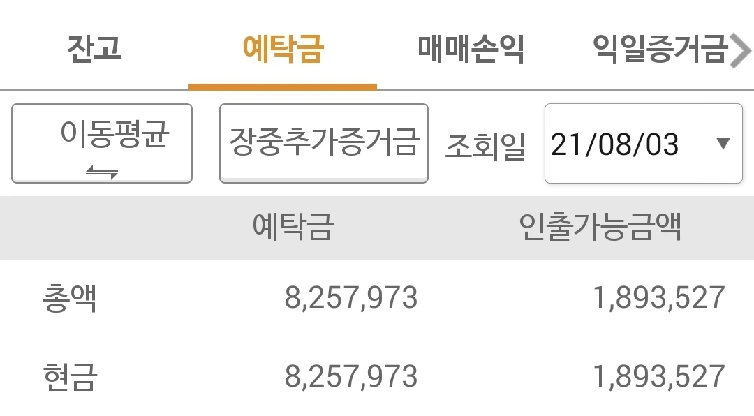 사진 3. 선물 주식 예탁금. 850만 원이 투자원금인데 살짝 손실이다. 그래도 5일선이 20일선 위에 있으므로 그냥 가만히 있는다.