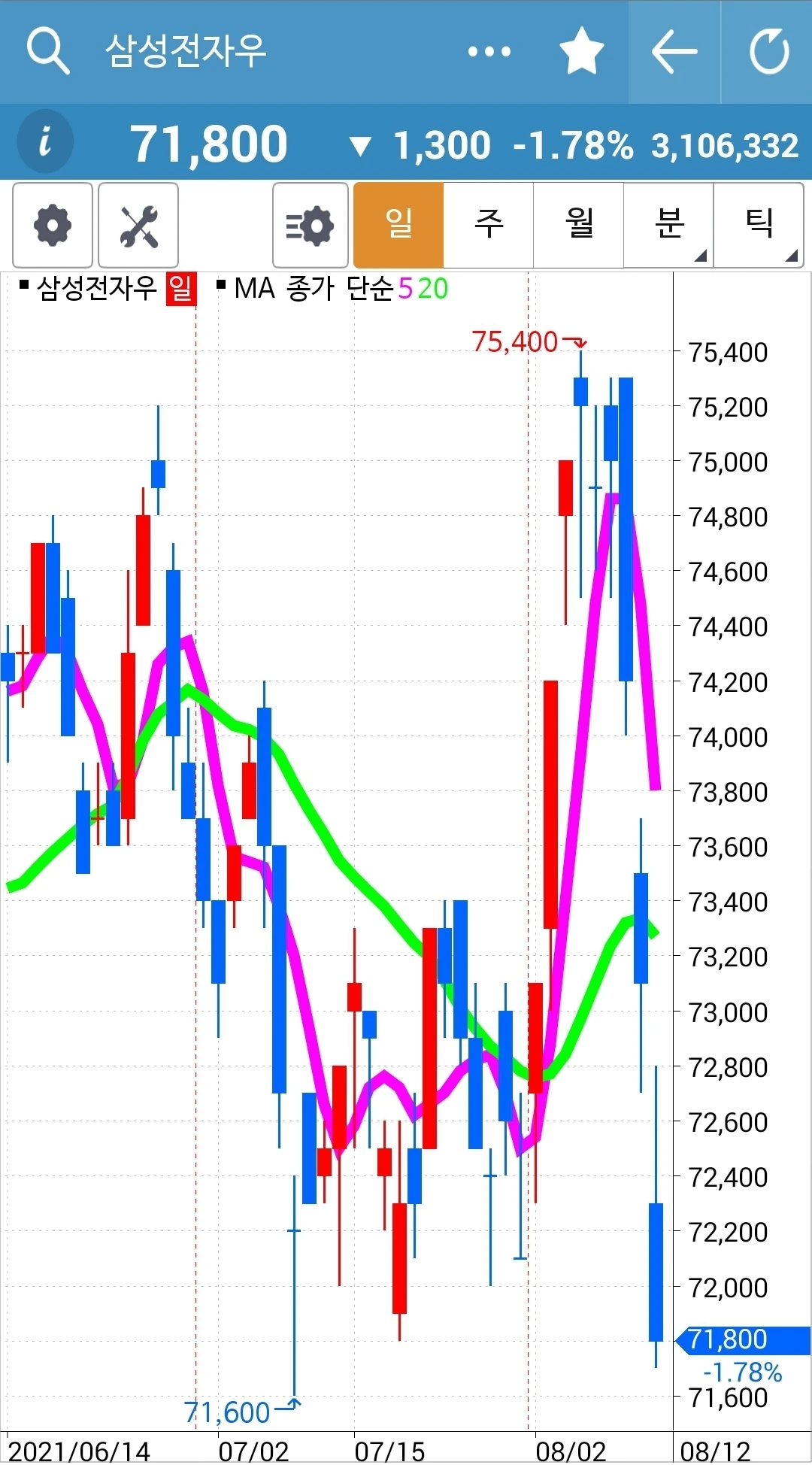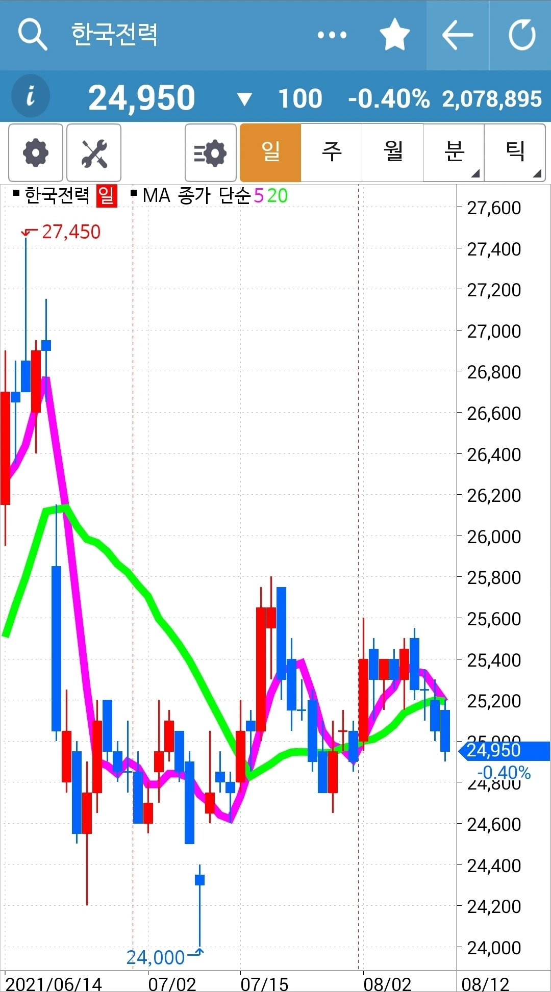 캬~ 어떻게 이렇게 심하게 떨어질까. 주봉 월봉에서 보여주던 긴 횡보는 아래로 향하려는가. 지켜볼 일이다. 이건 구경만 한다. 5일선이 20일선 아래로 내려가도.