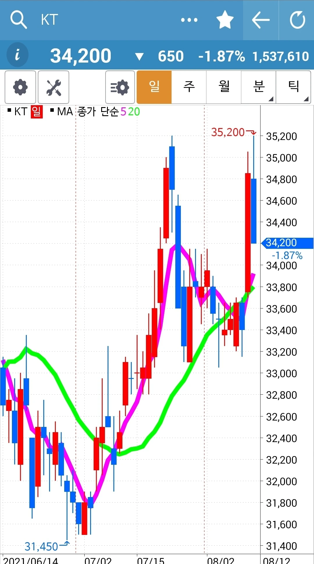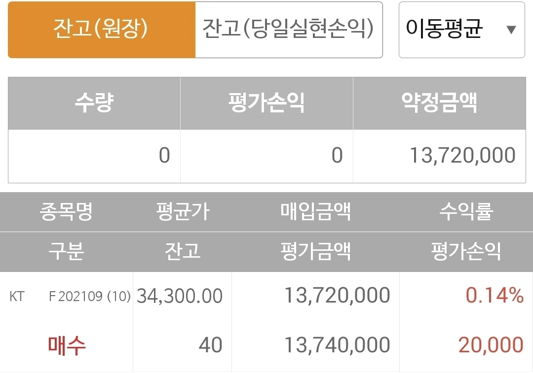 사진 2. 선물 주식. 한전은 오늘 선물주식 만기로 자동 빵 정리되었고 KT의 5일선이 20일선 위로 올라와 9월 물을 매수했다.