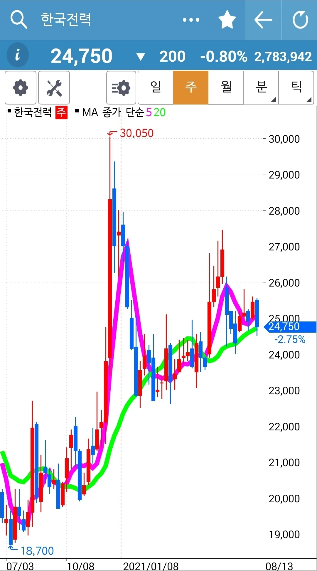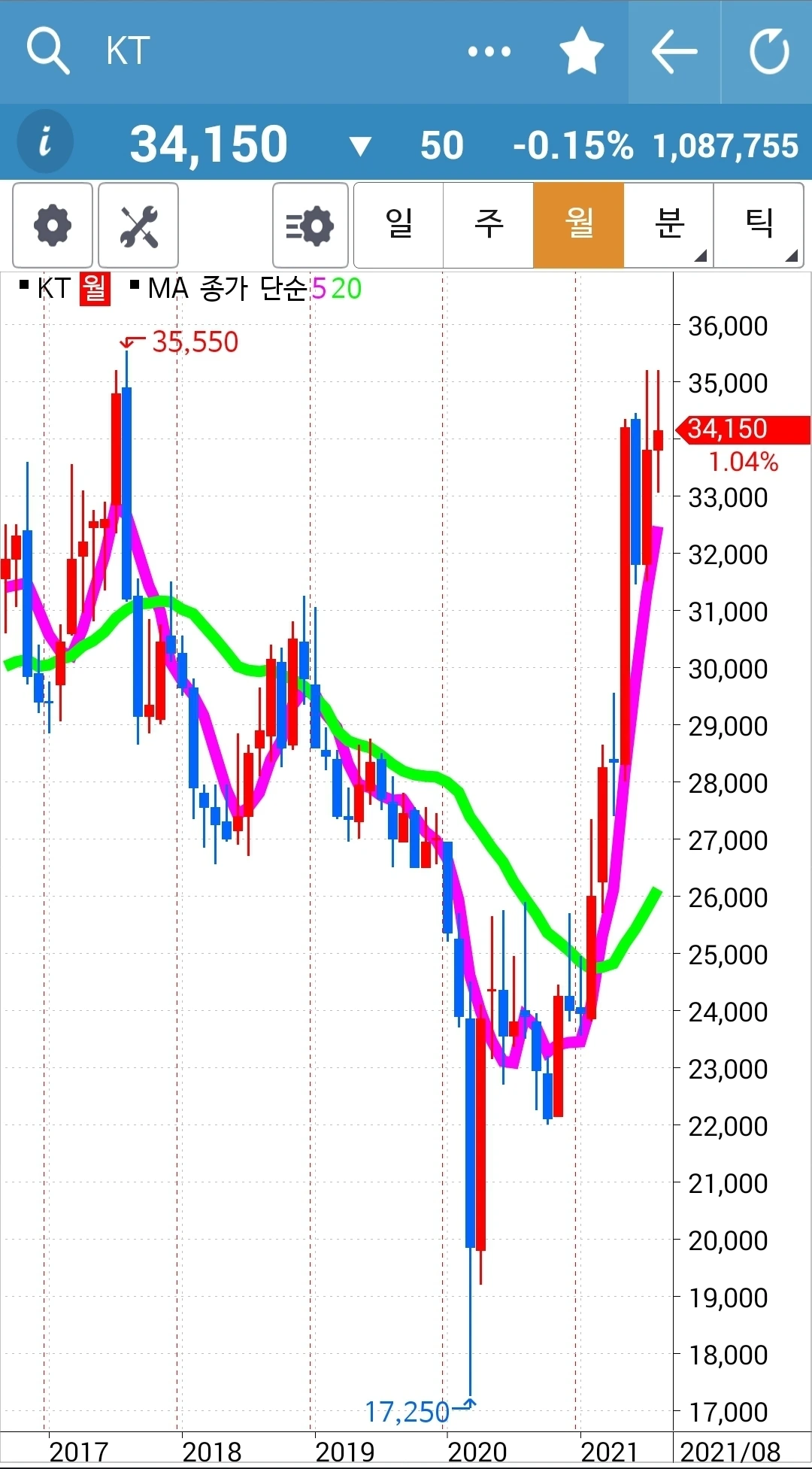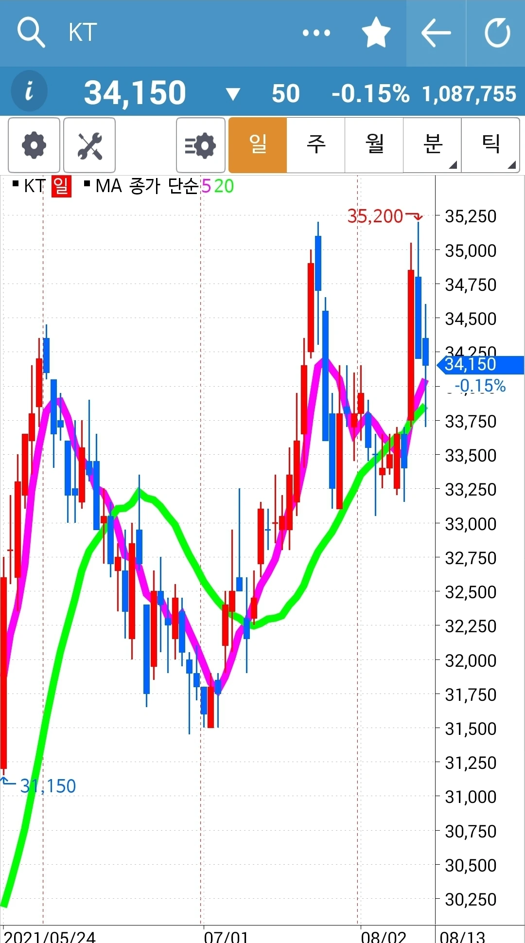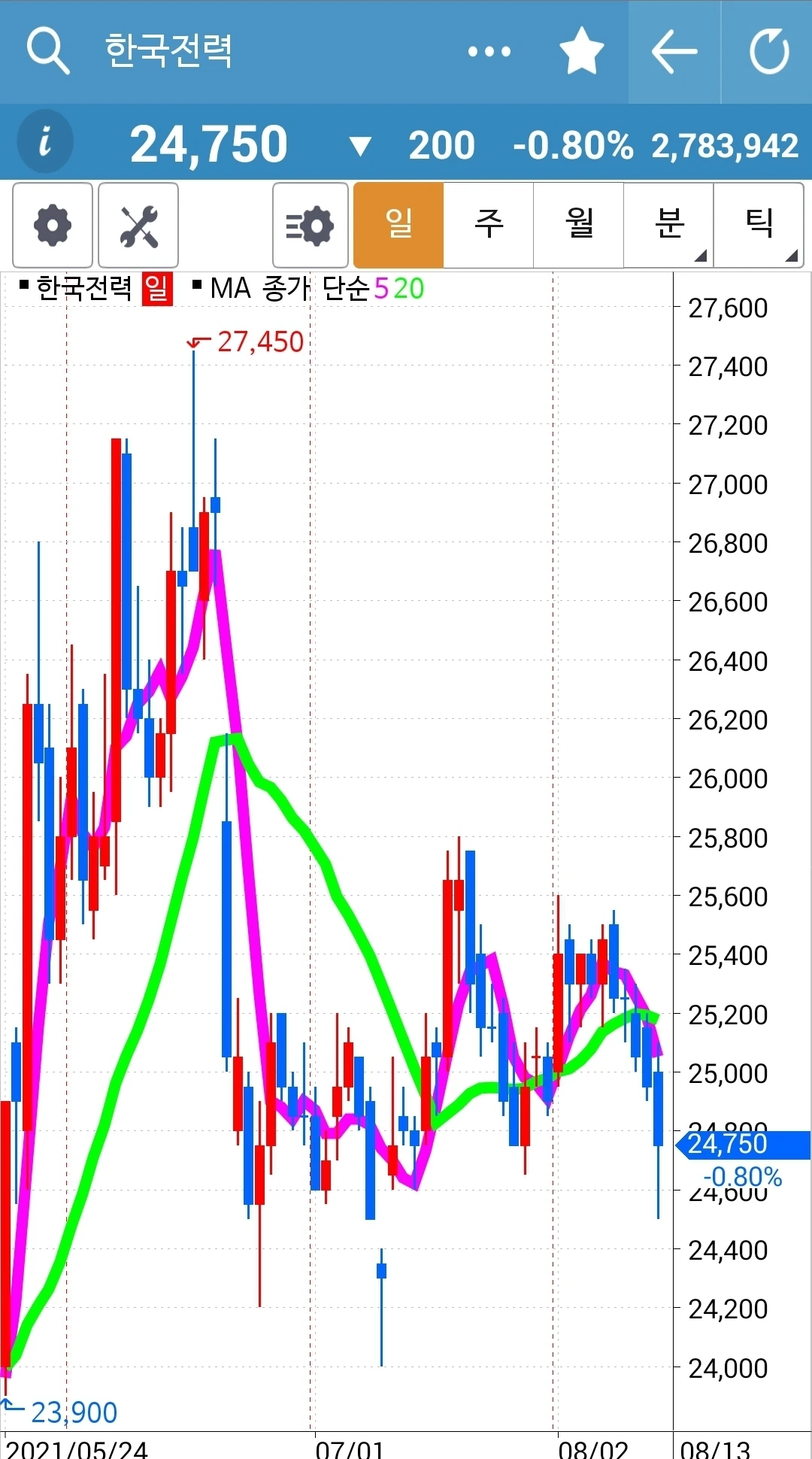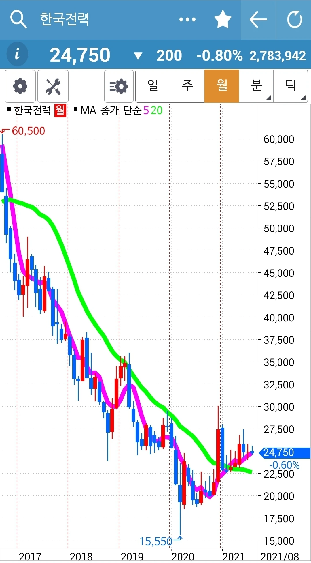 이것 역시 나의 원칙대로라면 나와야 한다. 와이? 5일선이 20일선을 뚫고 내려왔으니까. 그러나 장기전으로 결정한 현물 주식. 그냥 차트 구경만 한다.