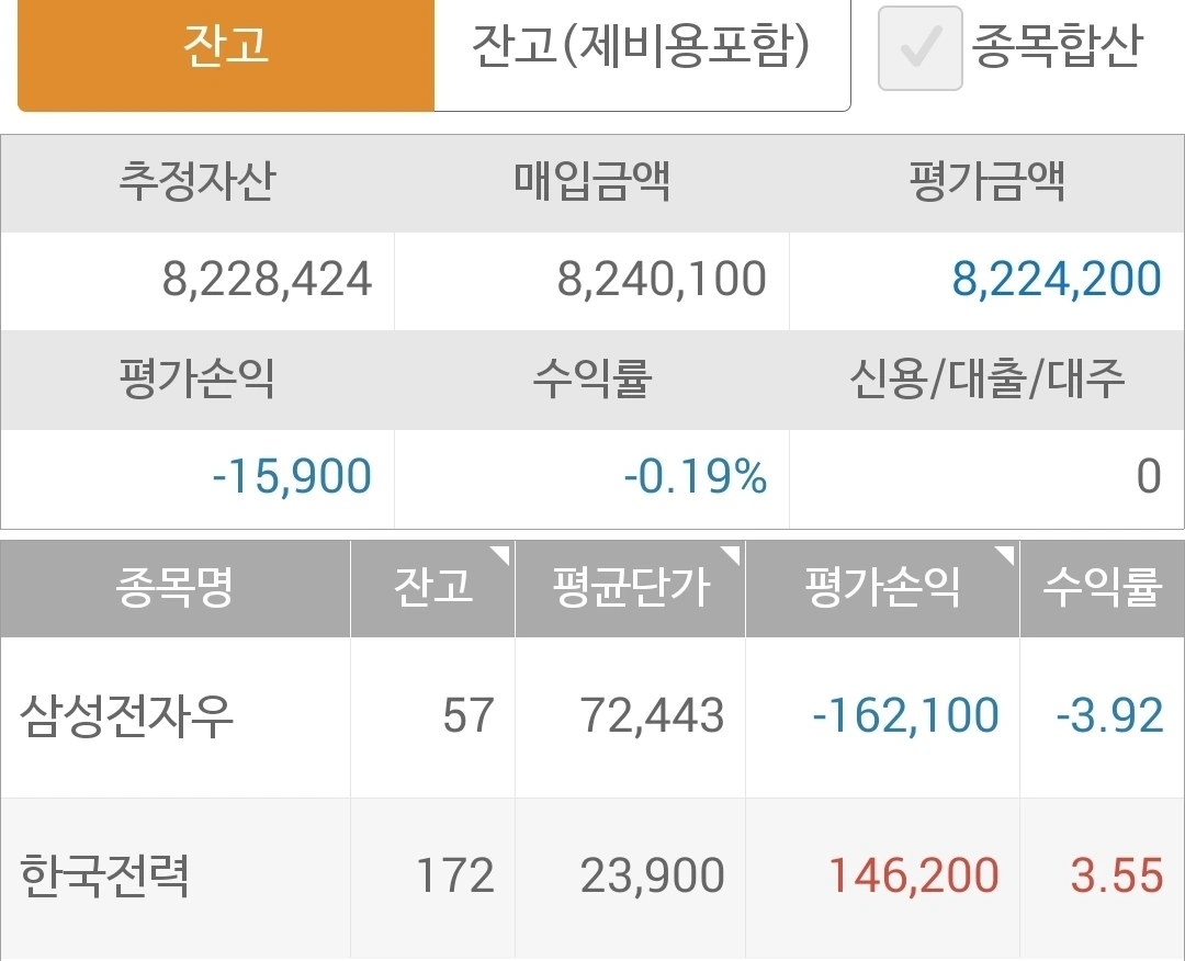 사진 1. 현물 주식. 장기전이므로 일희일비 없다. 그런데 손실이 크다. 822만 원으로 쪼그라들었다.