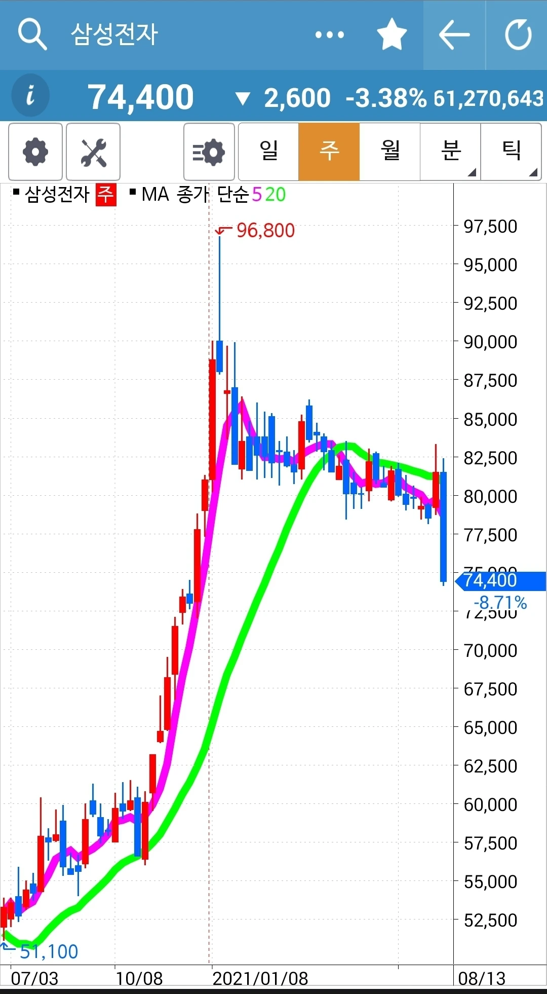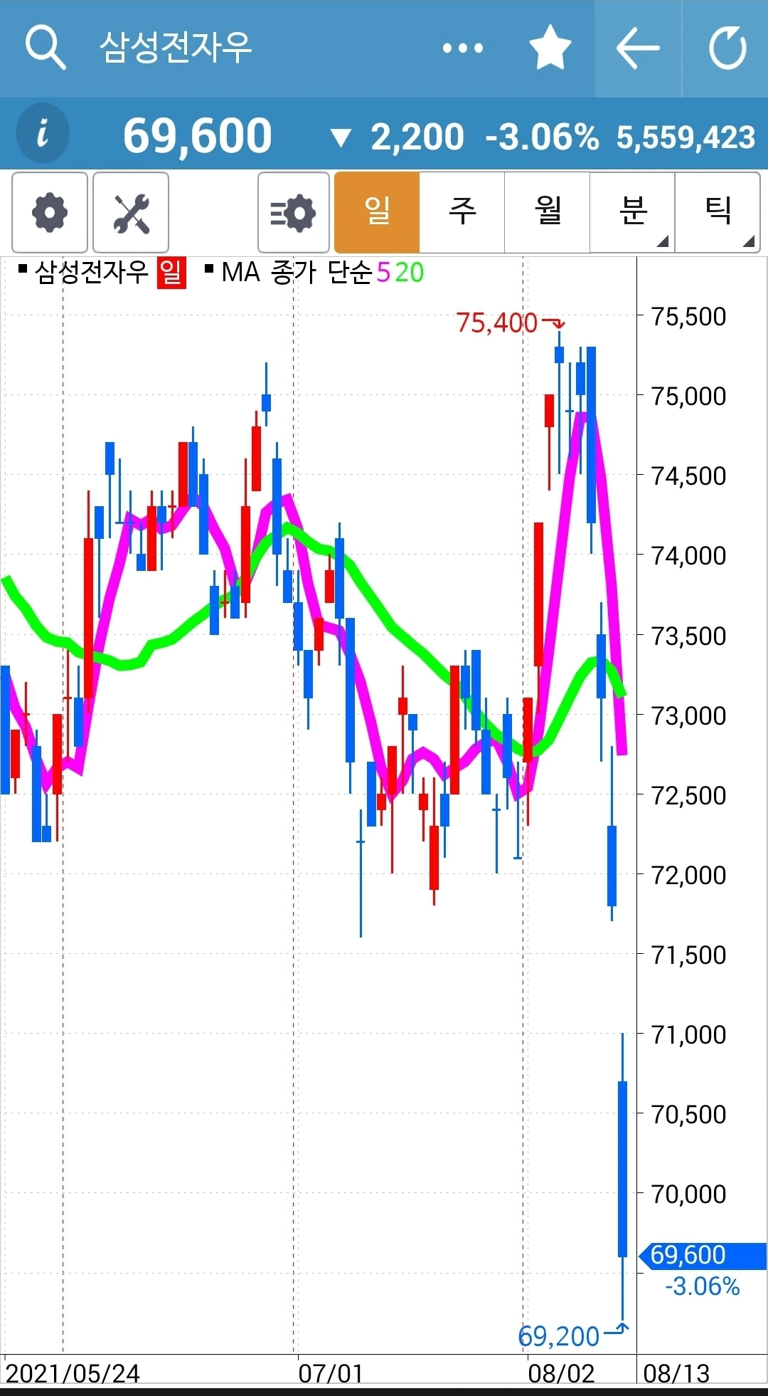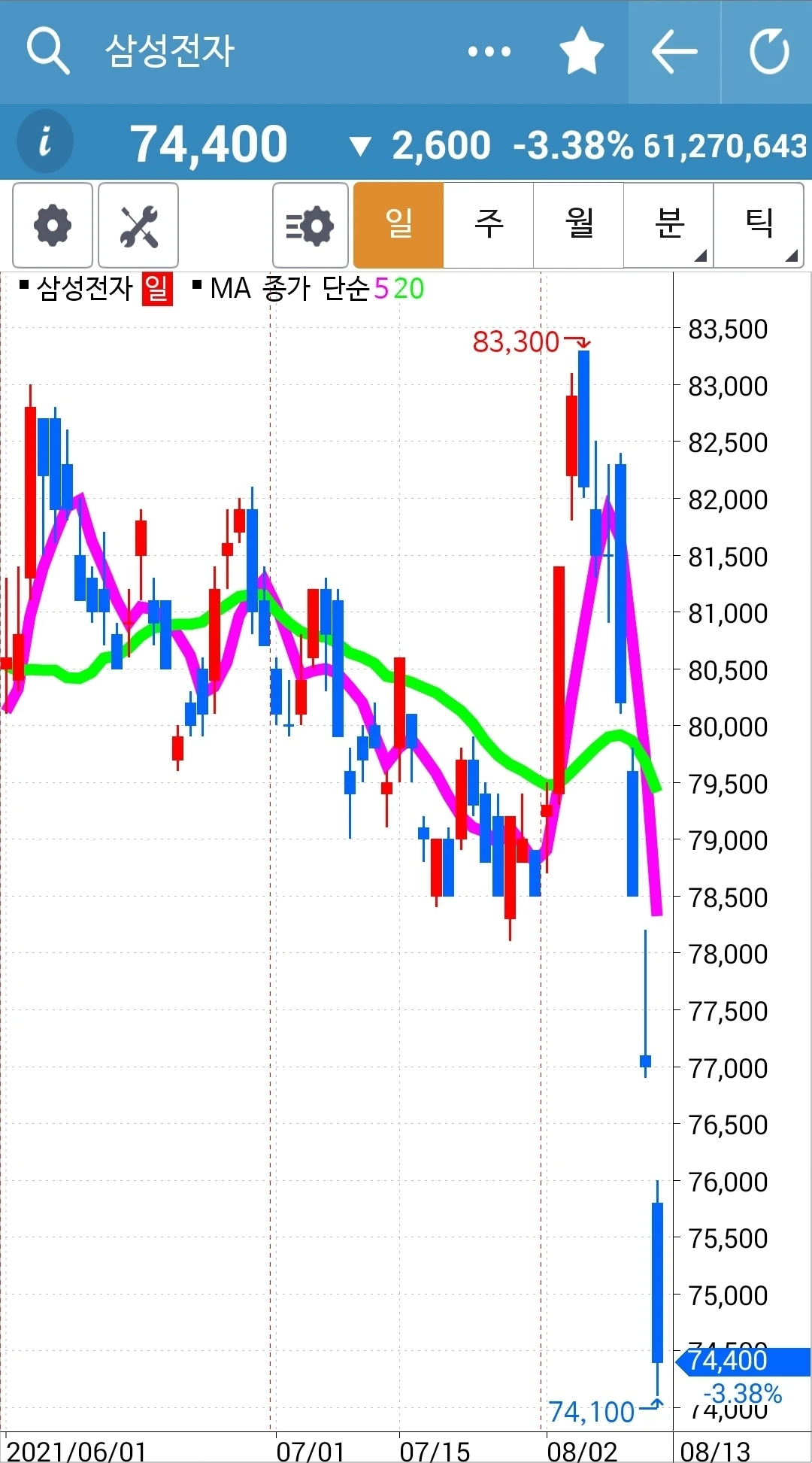 다행히 5일선이 20일선 위에 있다. 그러므로 매수 유지. '난 아무것도 몰라요 5일선이 20일선 아래로 내려가면 매도할 뿐야요~'이지만 난 오늘 대단한 파괴를 감행했다. 푸하하하 급락에 대한 맞대응. 너무 내려간 삼성전자를 샀다. 대단한 결정이다. 가끔은 그런 확 틀어진 변형이 밋밋한 나의 삶에 필요하다. 푸하하하. 파이팅!!!