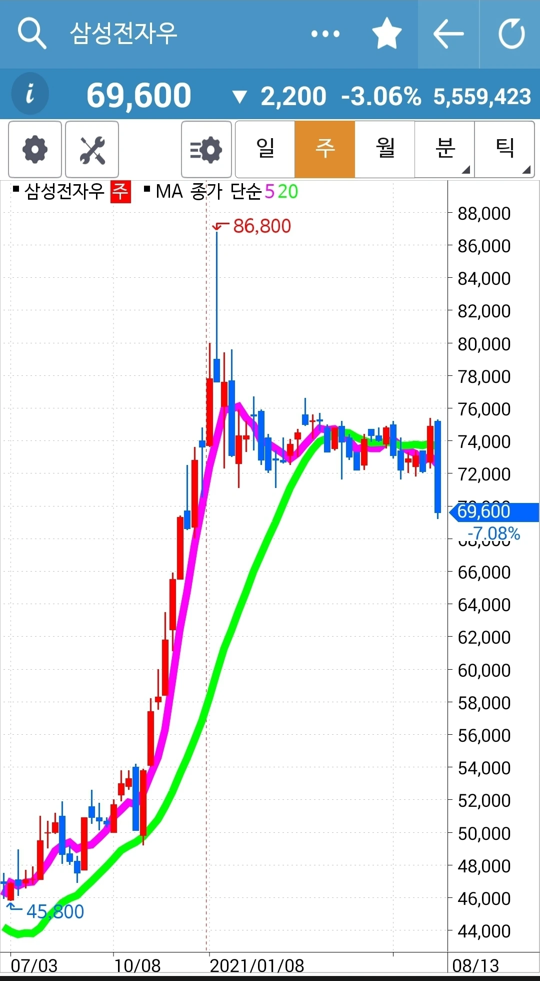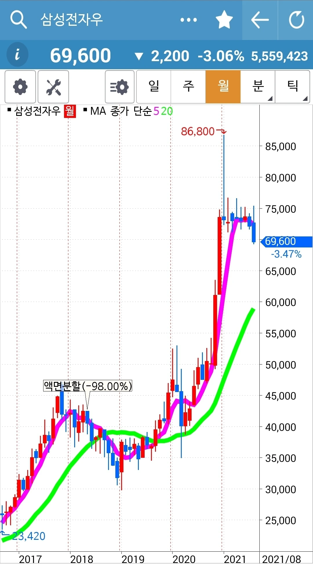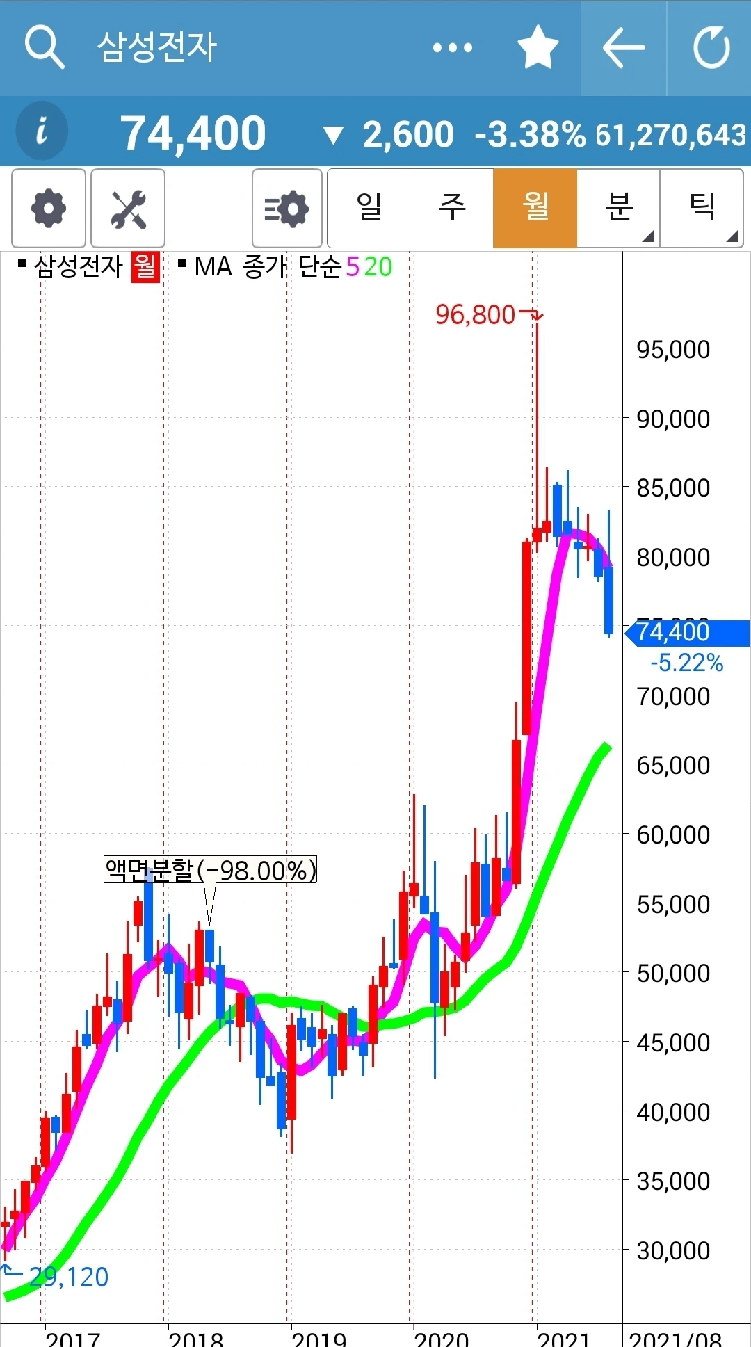 다행히 5일선이 20일선 위에 있다. 그러므로 매수 유지. '난 아무것도 몰라요 5일선이 20일선 아래로 내려가면 매도할 뿐야요~'이지만 난 오늘 대단한 파괴를 감행했다. 푸하하하 급락에 대한 맞대응. 너무 내려간 삼성전자를 샀다. 대단한 결정이다. 가끔은 그런 확 틀어진 변형이 밋밋한 나의 삶에 필요하다. 푸하하하. 파이팅!!!