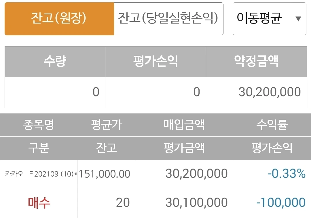 사진 2. 선물 주식. 삼성전자를 몽땅 카카오로 바꿔버렸다. 위에 말한 이유로.