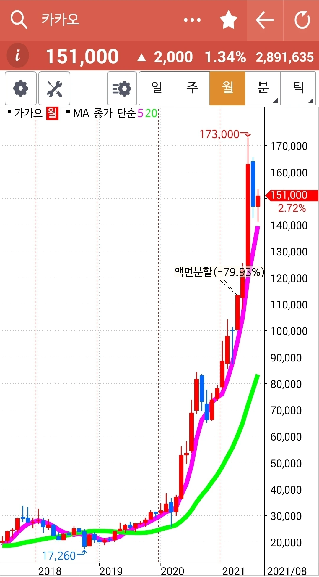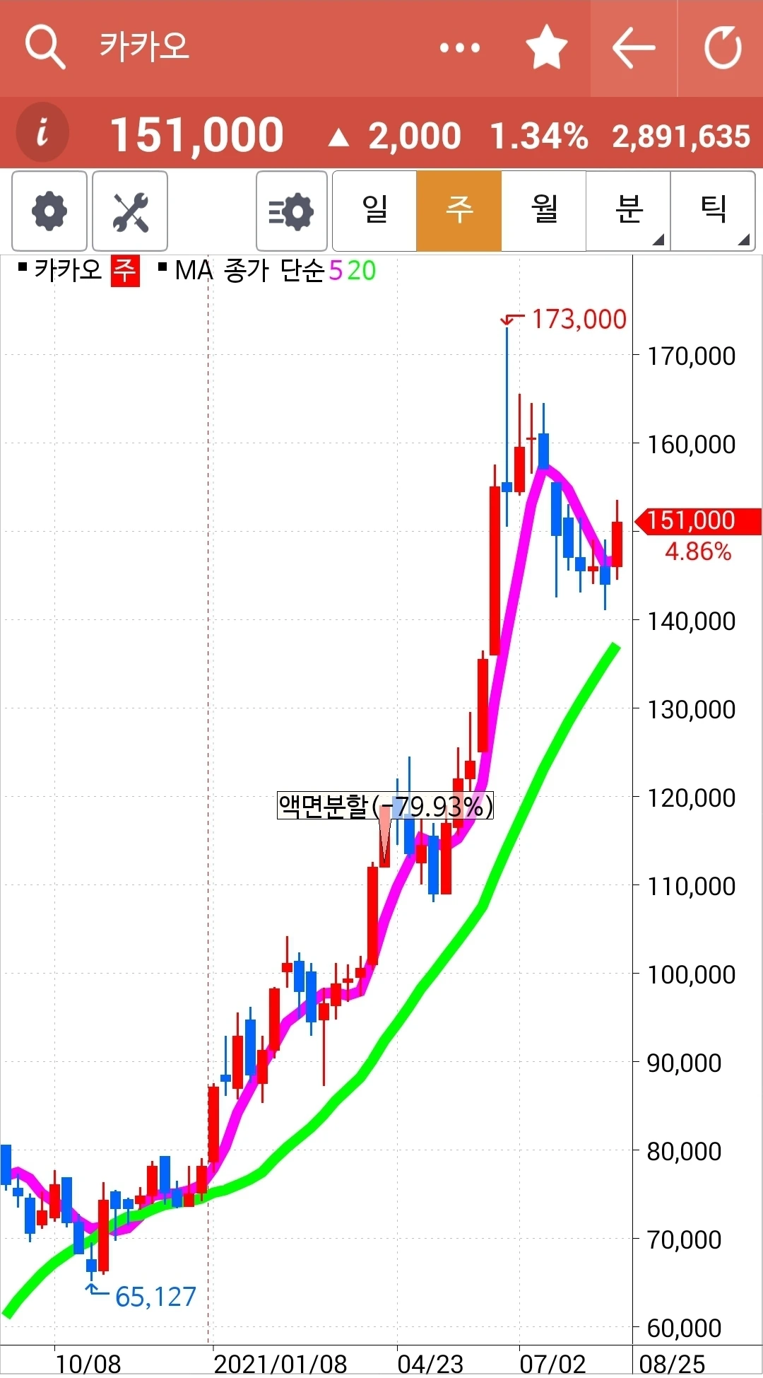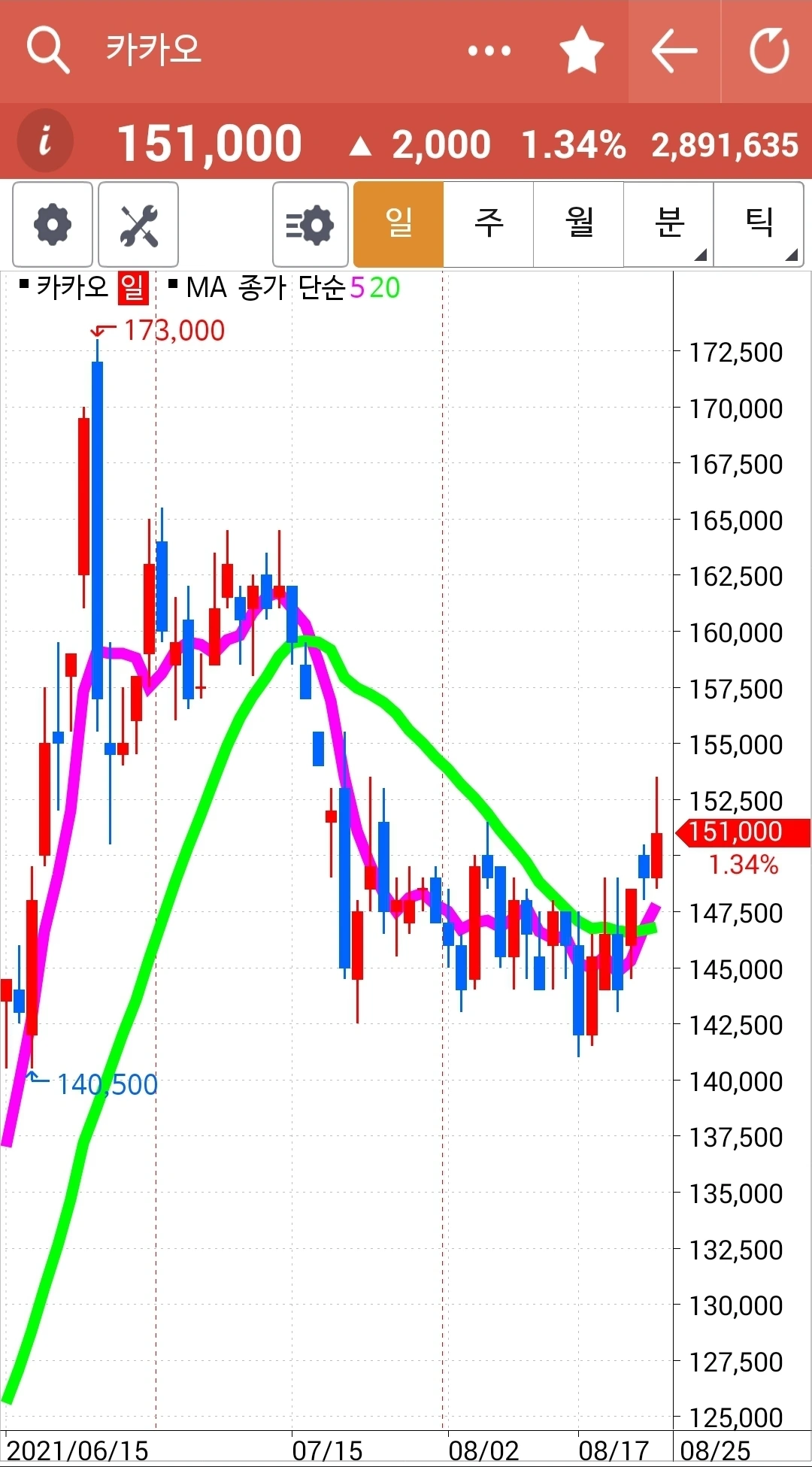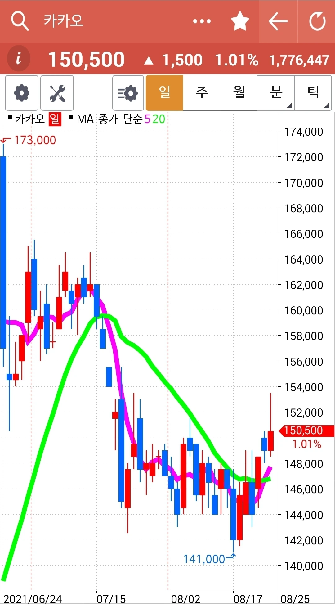 격하게 떨어져서 원칙에 맞지도 않는데 맞대응한 거라면? 그렇다면 수익이 났을 때 재빨리 정리해야 한다. 격한 떨어짐에 대응한 거니까. 그리고 5일선이 20일선 위로 올라오는 걸 찾아봤다. 난 다시 나의 원칙에 맞는 투자를 해야 하니까. 거기 걸려든 게 카카오. 그래!!! 손가락 다다다닥.