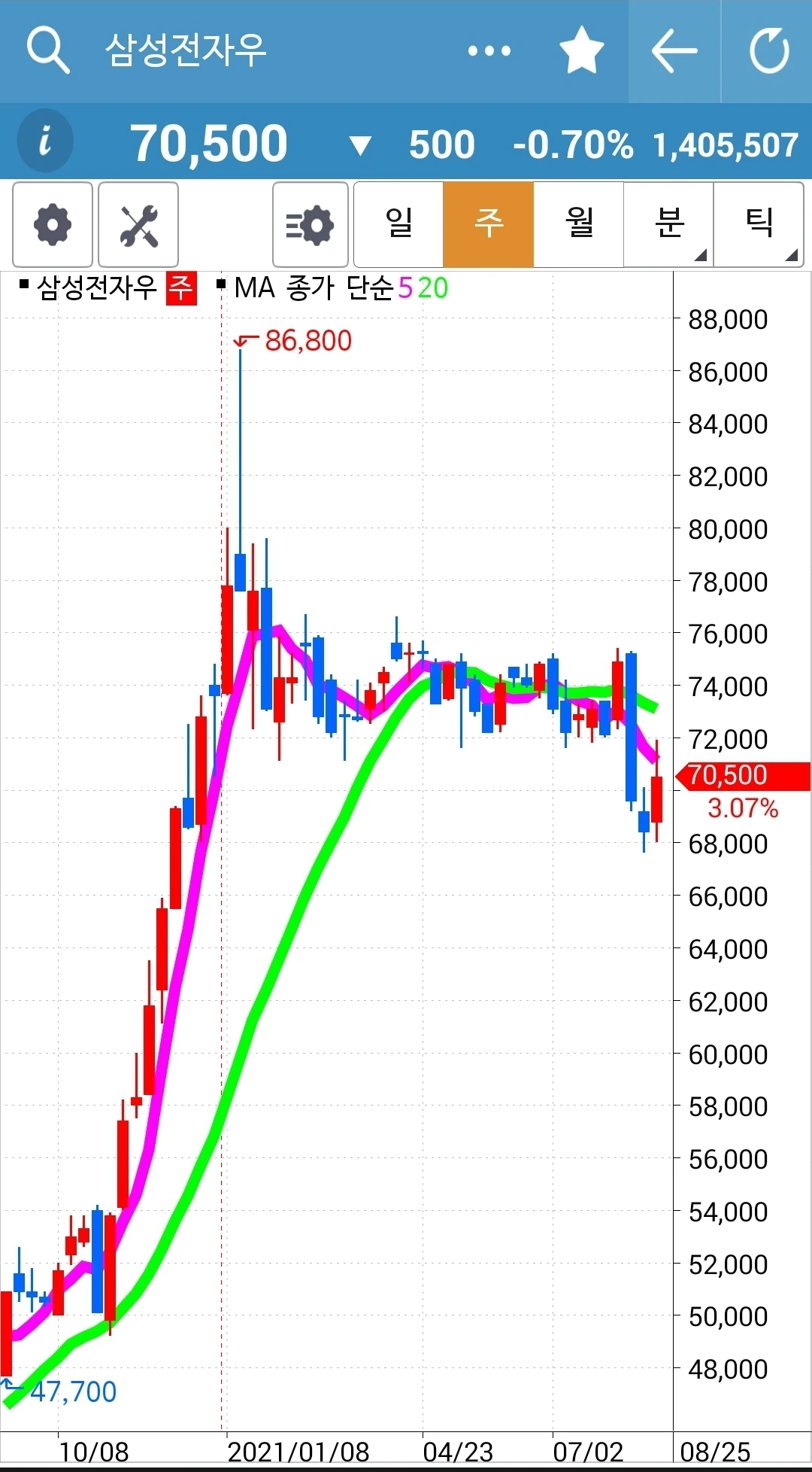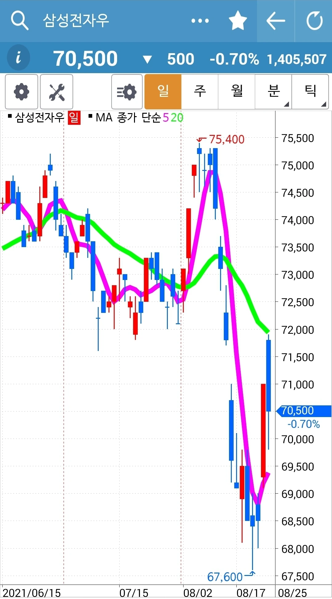 내가 좋아하는 그림. 5일선이 20일선 위로 빠꼼히 고개 내미는 모습. 과감히 바꿔 탔다. 파이팅!