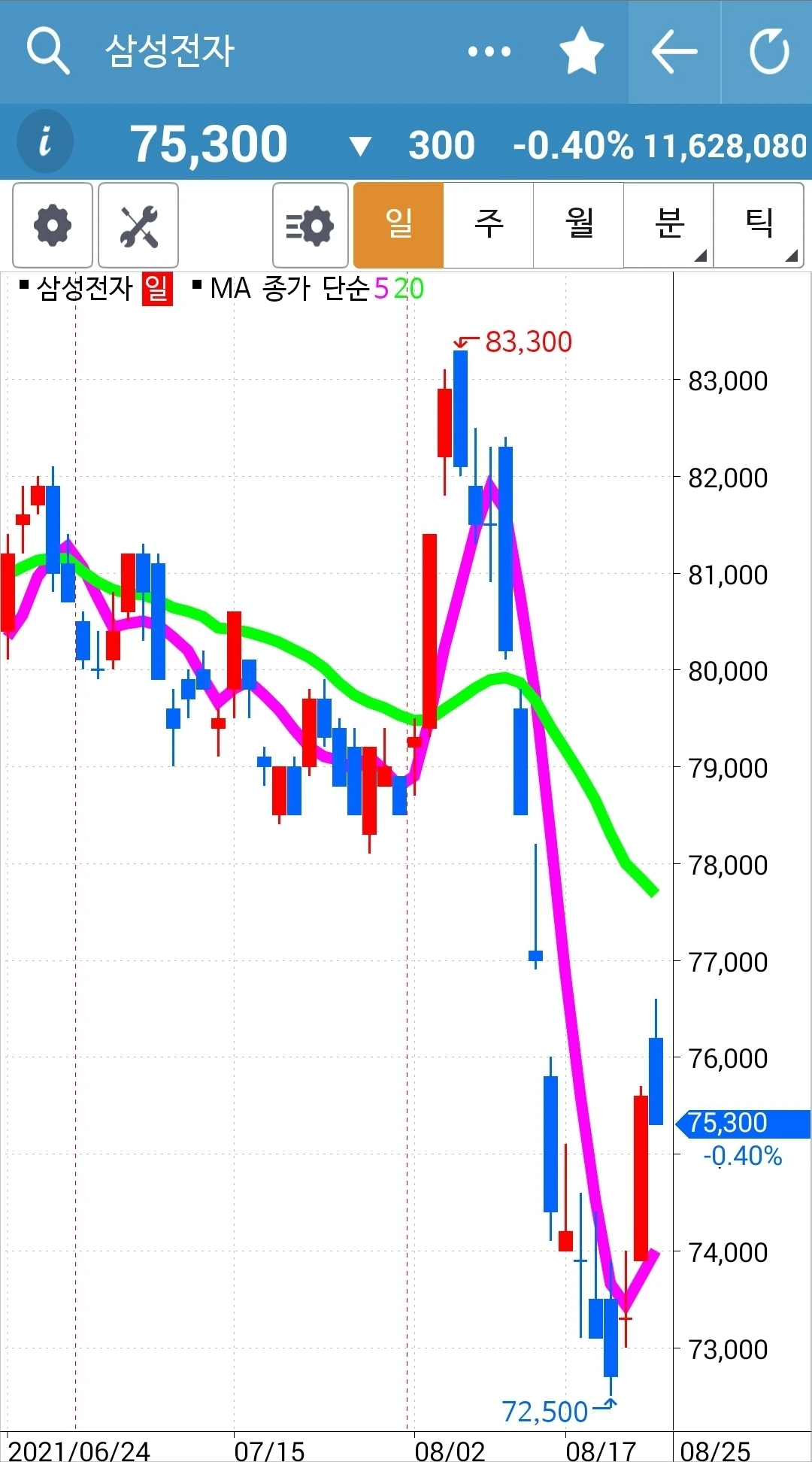 이것 역시 장기전이라는 현물 주식. 한번 5일선이 20일선 위로 올라오고 나면 그땐 다시 나의 원칙을 지키도록 해야지.