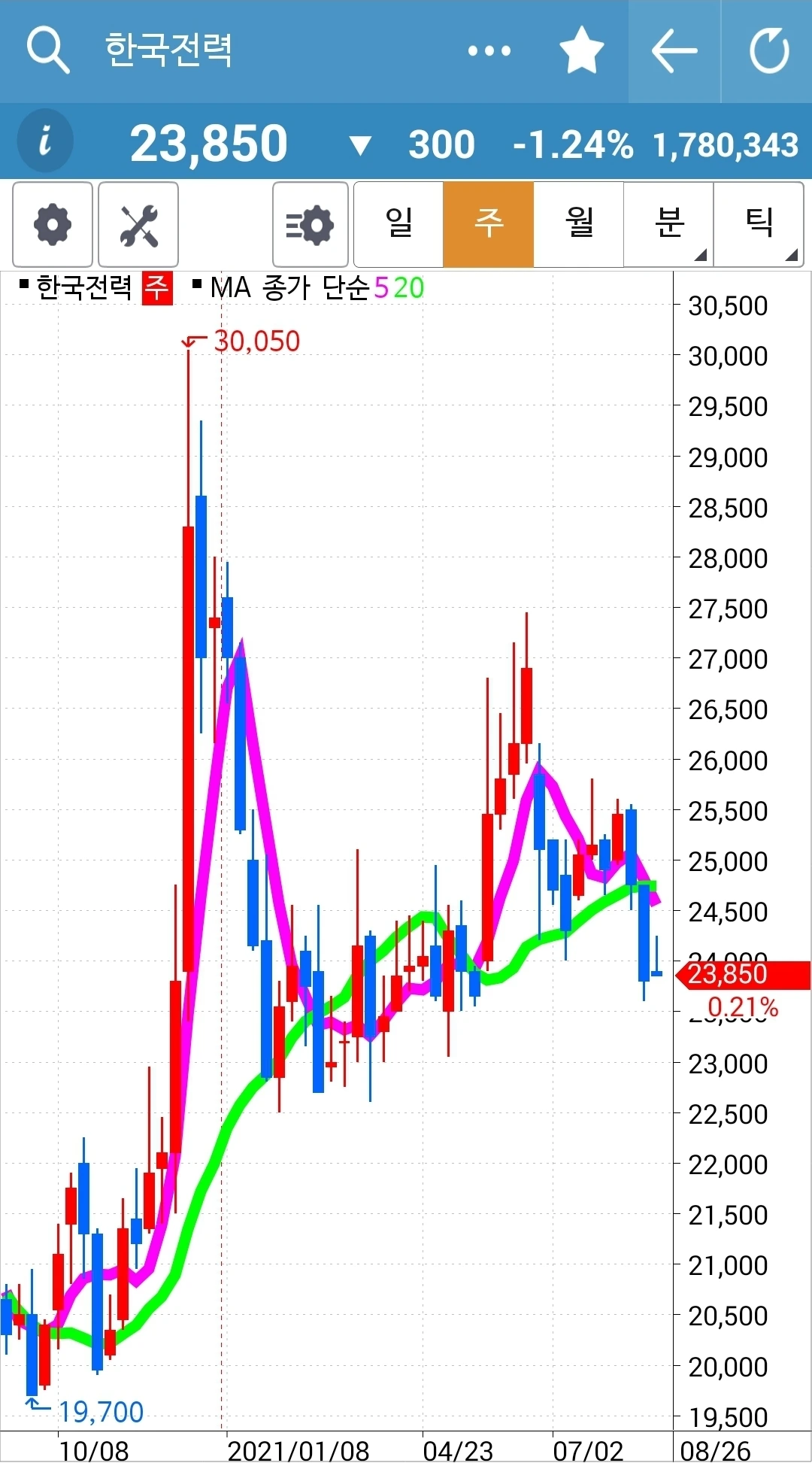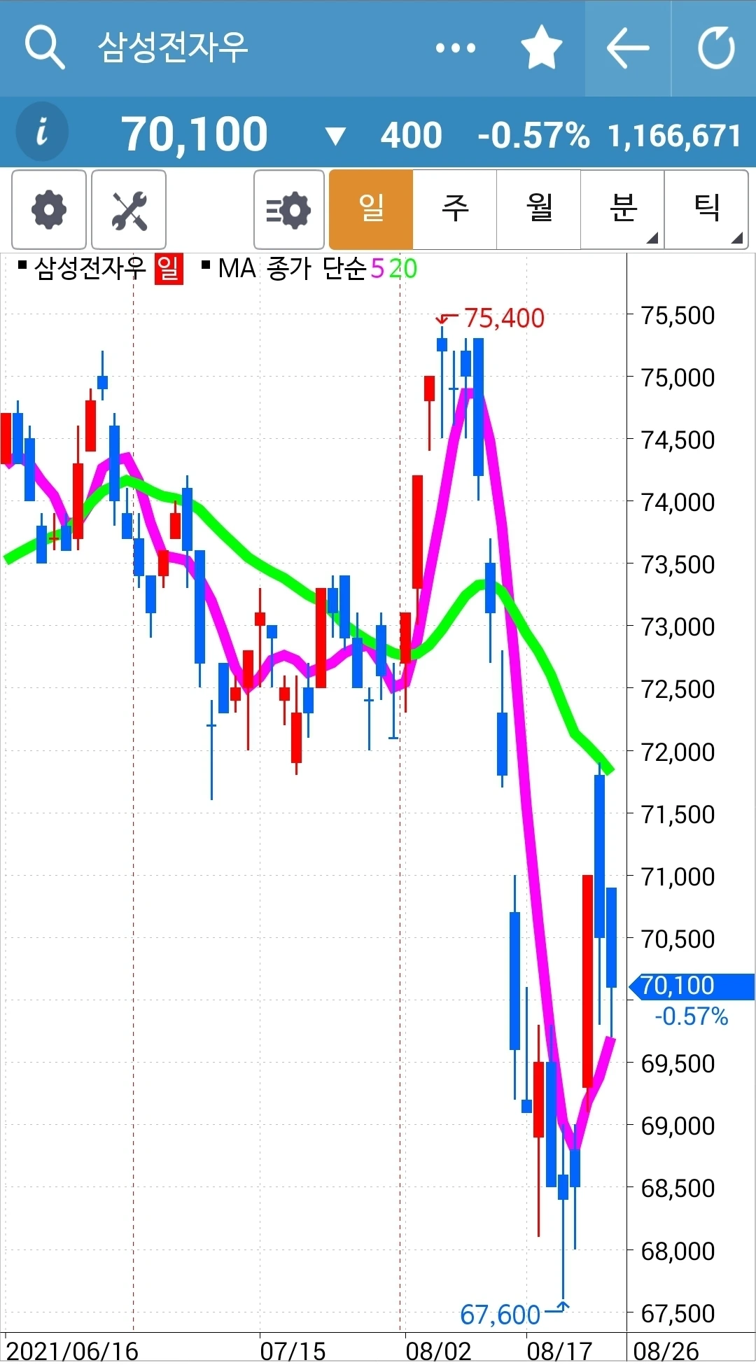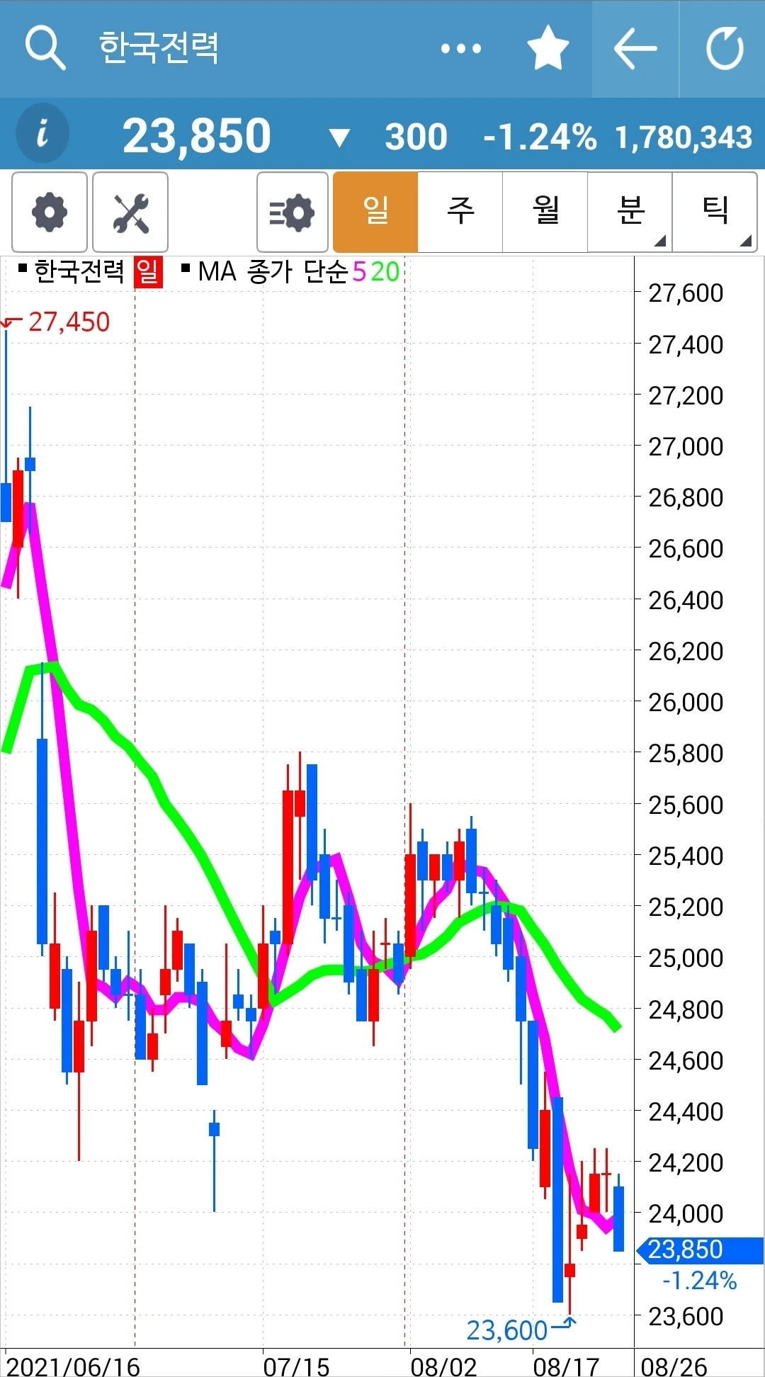 신나게 올라가 20일선을 건드리고는 음봉 연속이다. 어떻게 될까? 현물 주식이니 5일선이 20일선 위로 올라설 때까지 애초 계획대로 일단은 가지고 가기로 한다. 그러나 장기전 계획은 수정되어야 한다.
