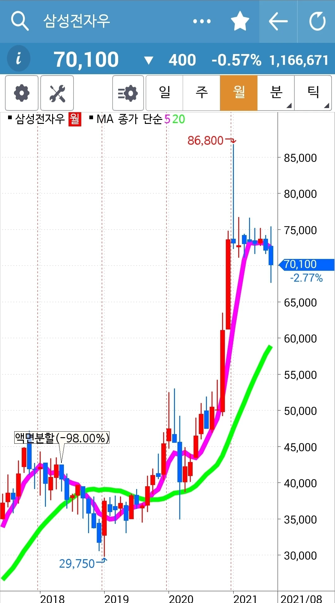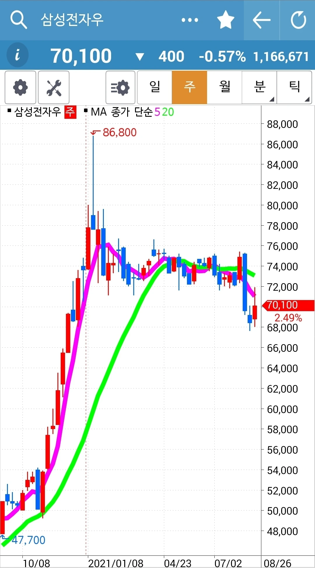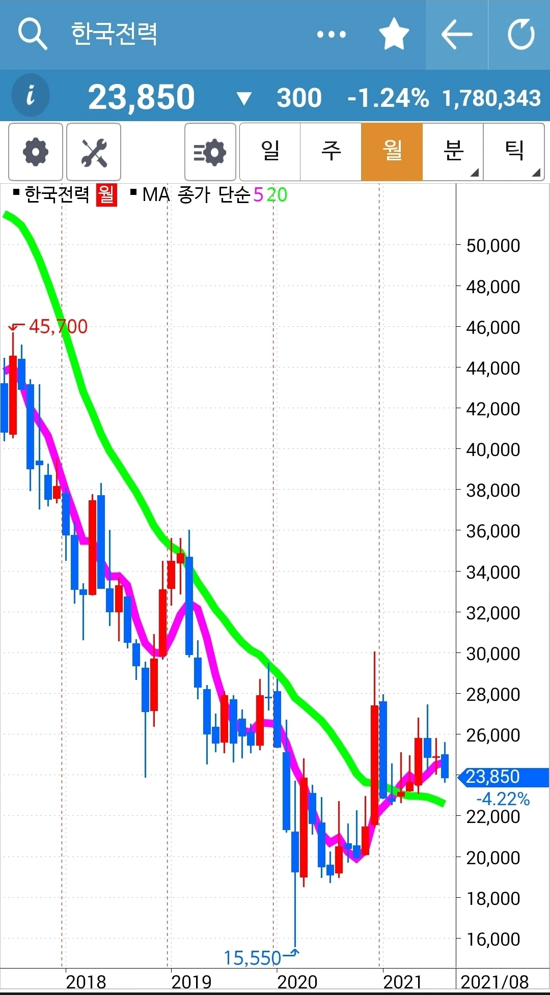 신나게 올라가 20일선을 건드리고는 음봉 연속이다. 어떻게 될까? 현물 주식이니 5일선이 20일선 위로 올라설 때까지 애초 계획대로 일단은 가지고 가기로 한다. 그러나 장기전 계획은 수정되어야 한다.