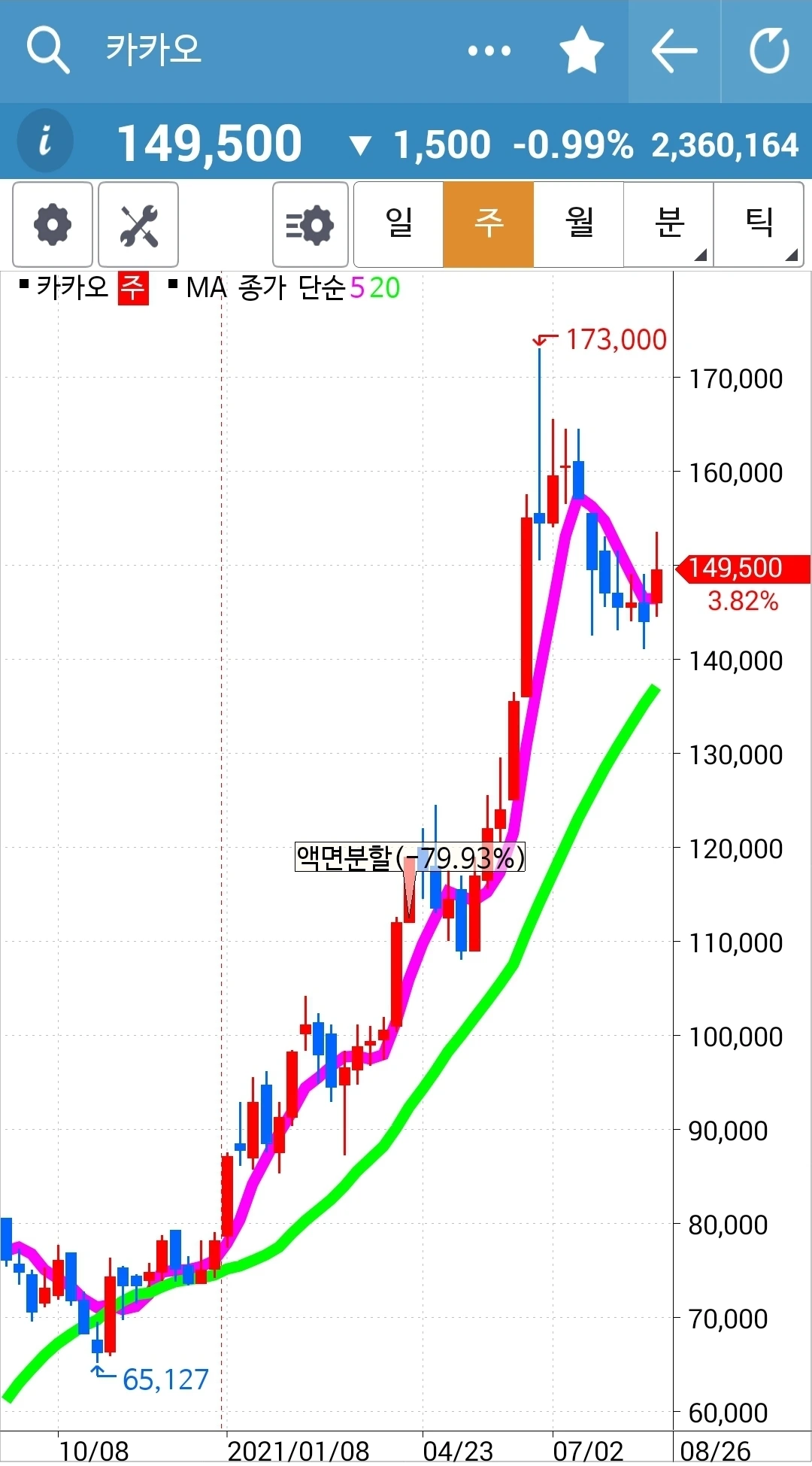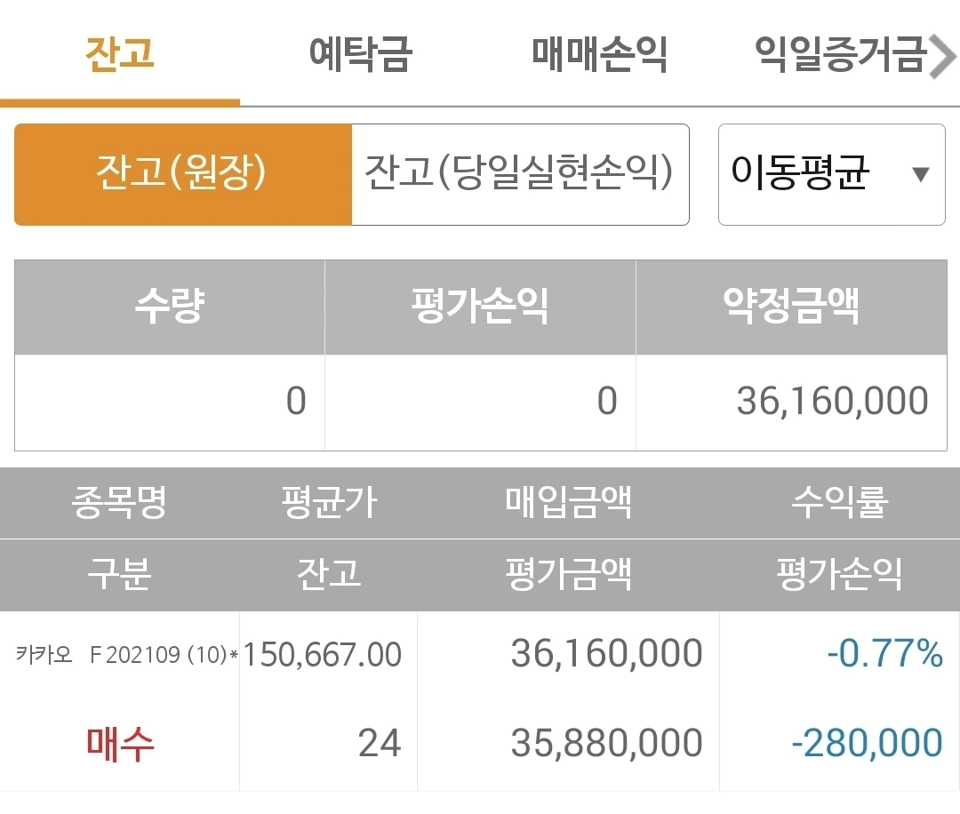 사진 2. 선물 주식. 카카오로 몽땅 바꾸어 탄 현장. 아직 5일선이 위니까 고우 고우.