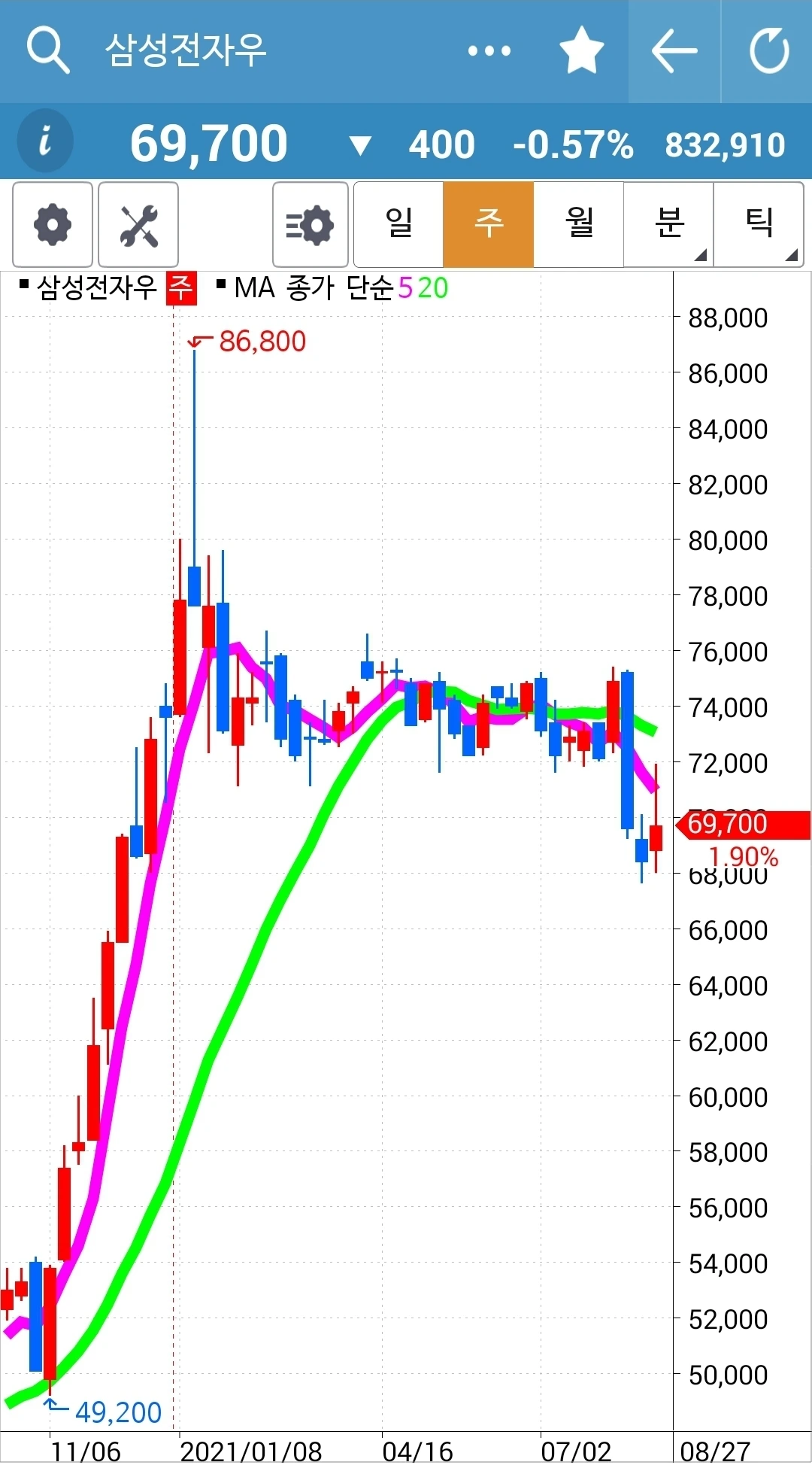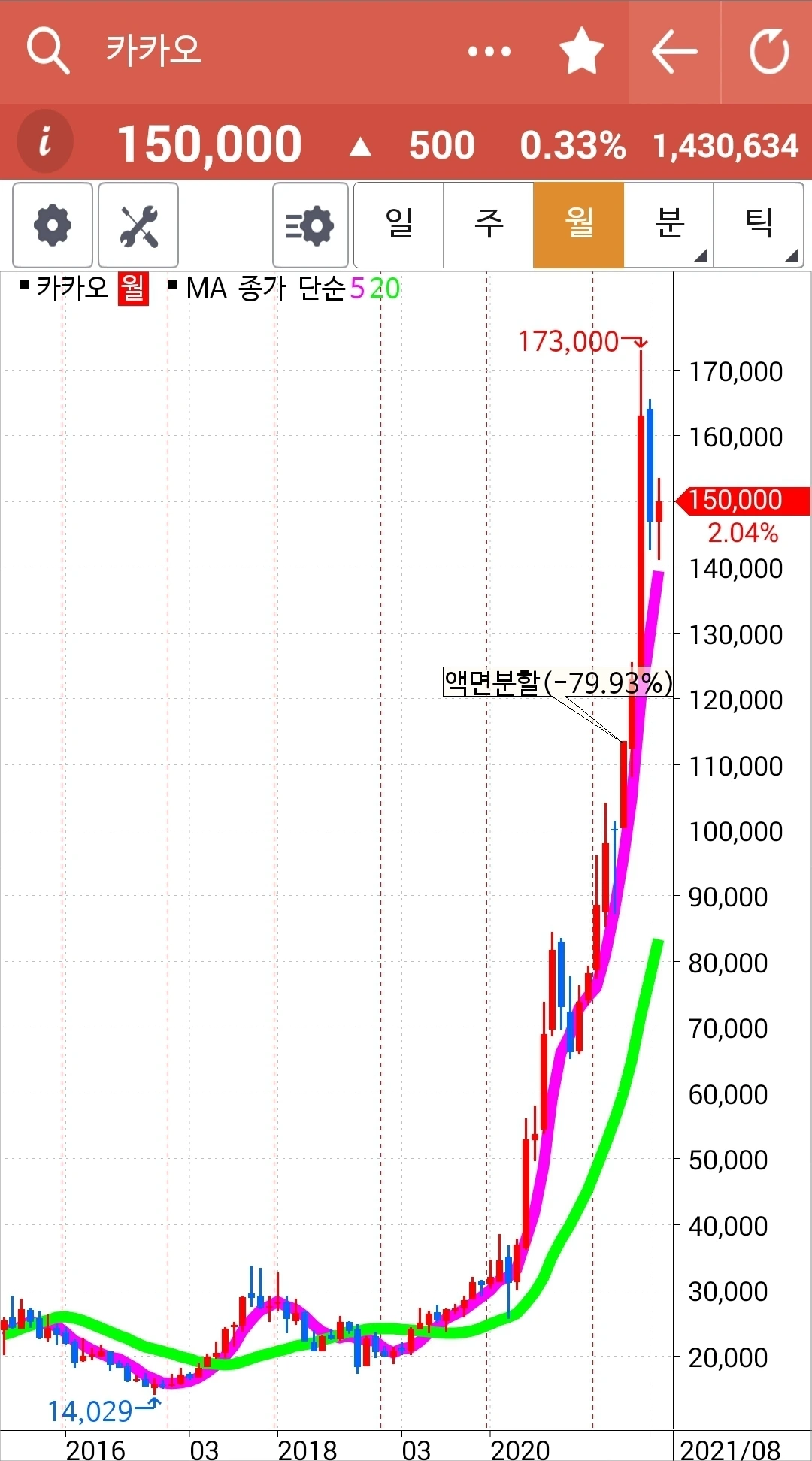 월봉이 너무 과하게 오른 감이 있으나 그런 만큼 주봉에서 5 주선이 20 주선 근처까지 살짝 조정받고 다시 뛰어오르는 형태. 일봉에서 5일선이 20일선 위로 고개를 내밀었으니 내가 가만있을 수 있나. 확 낚아챘다. 5일선이 20일선 아래로 내려올 때까지 고우 고우. 파이팅!