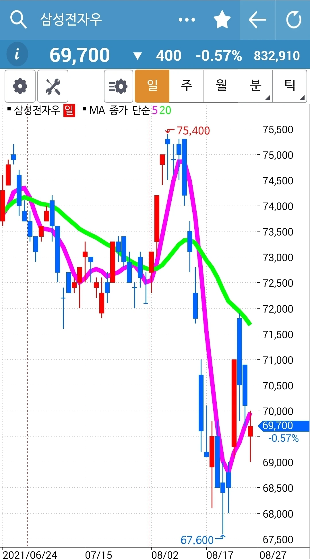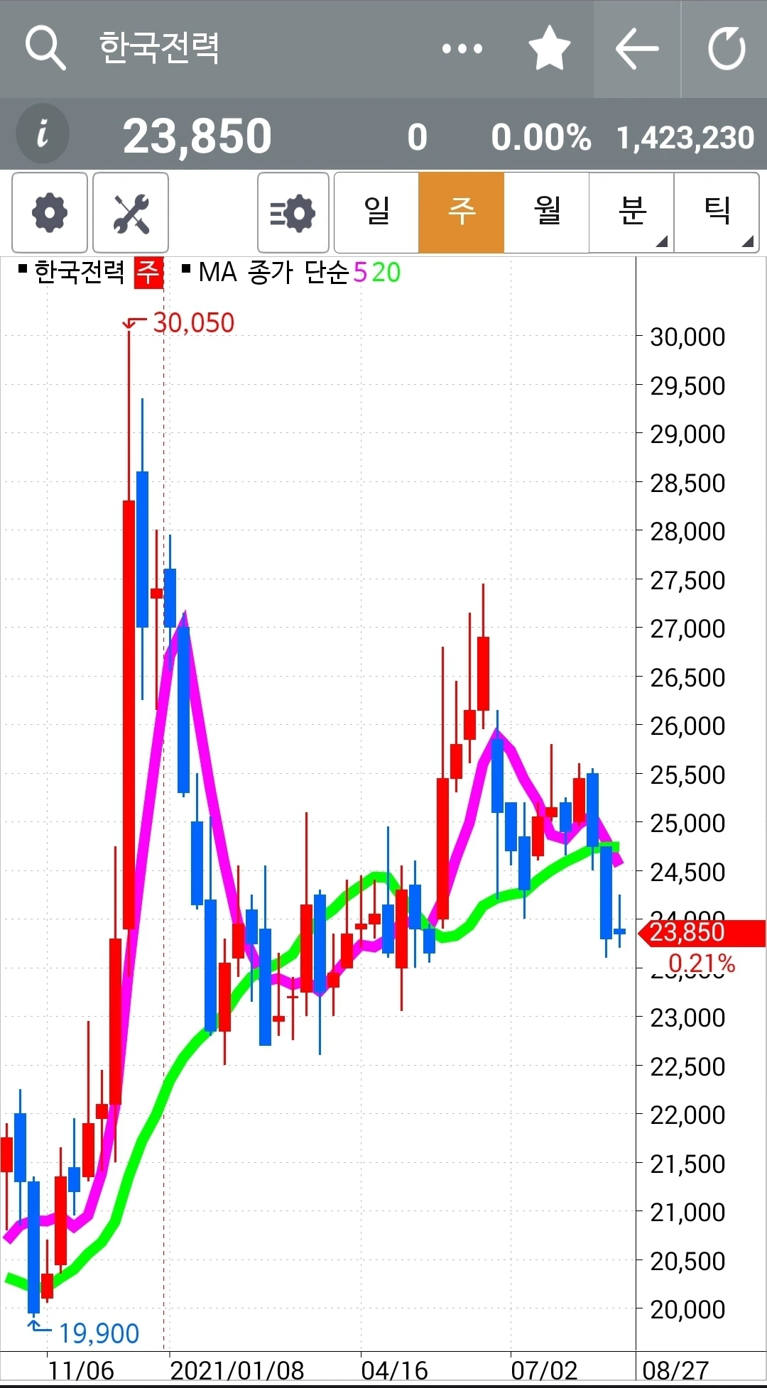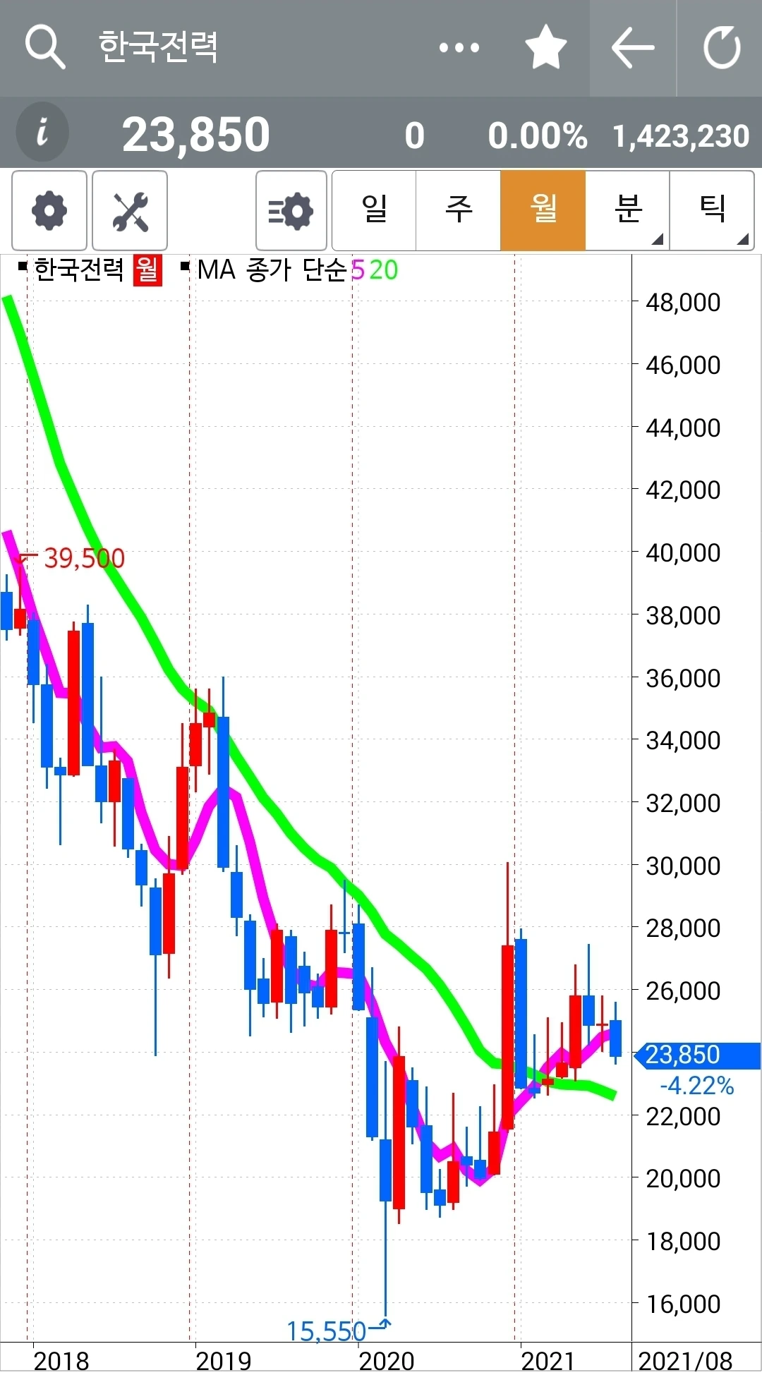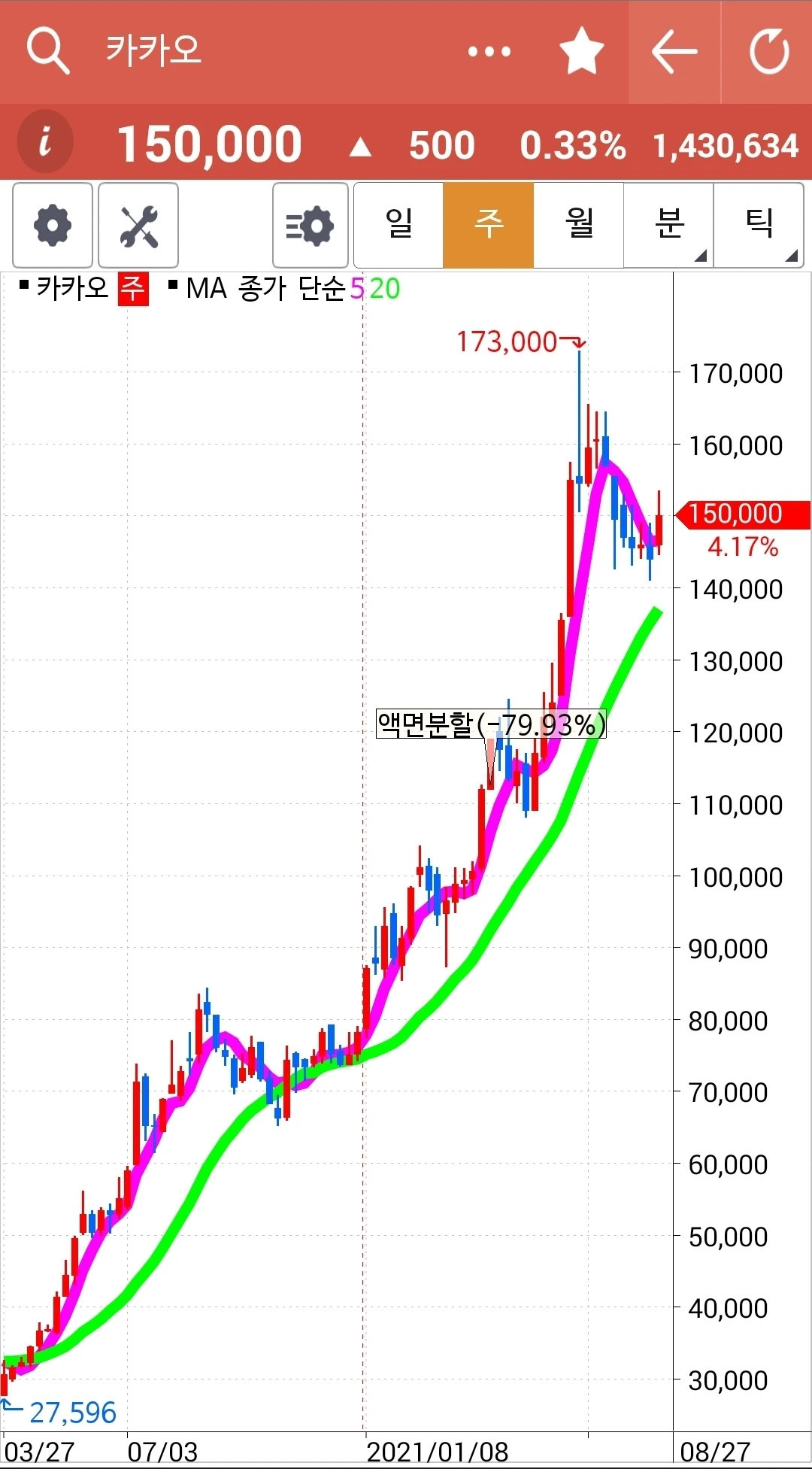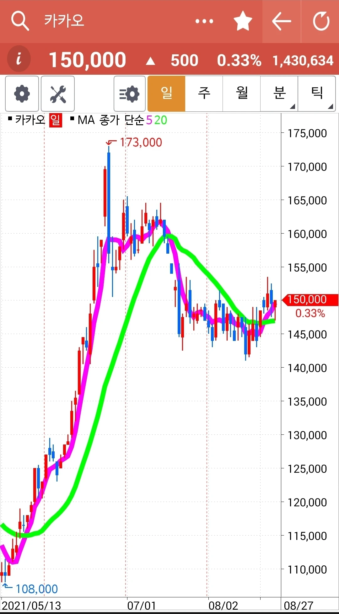 선물주식에선 그 반등을 챙겼지만 이건 현물 주식이므로 그냥 차트 구경만 한다. 그러나 이게 다시 나의 원칙에 맞게 들어오는 날 그때부턴 5일선 20일선 철저히 지켜 원칙대로 하면서 장기 투자하리라. 장기투자건 단기투자건 나의 원칙에 위배되는 건 키우지 않기로 한다. 파이팅!
