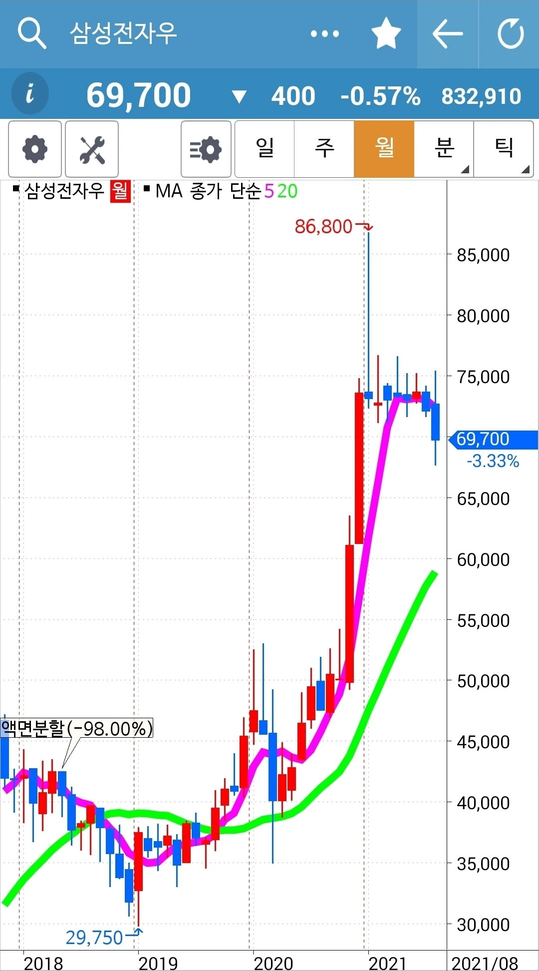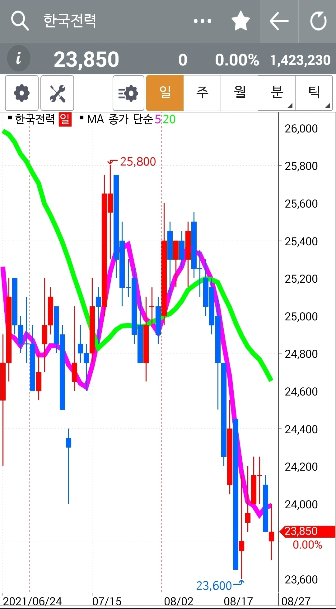 장기전에도 적용시킬 단순한 나의 원칙을 읊어본다. '난 아무것도 몰라요~ 5일선이 20일선 아래로 내려가면 매도할 뿐야요~ '