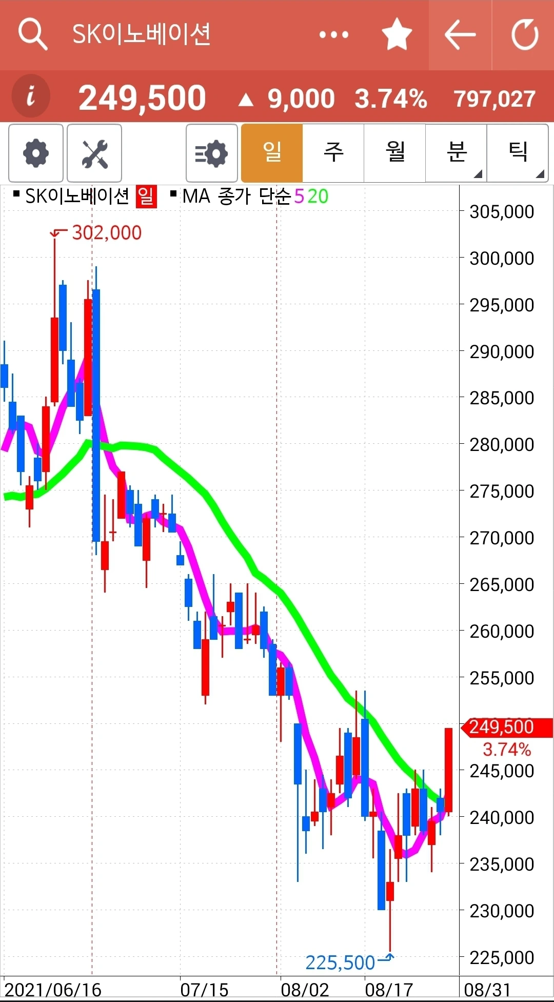 아침 일찍부터 사야지 사야지 했으나 돈이 조금 늦게 입금되어 최고 가격에 샀다. 그리고 또 밀렸으니까. 248,000원부터 사기 시작해 밀리는 대로 사 넣어 최종 가격은 246,833원. 일단 나의 원칙에 맞는 종목에서 시작한다. 나의 원칙이란? 바로 요거. '난 아무것도 몰라요~ 5일선이 20일선 위로 가면 매수할 뿐야요~' 이 원칙 하나만으로 이천으로 매달 백! 만 벌어보리라. 못할 것도 없다.