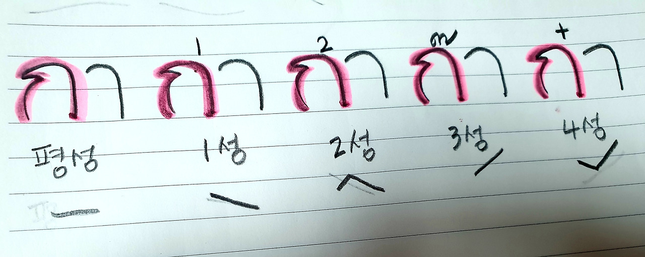 성조는 이렇게 성조 기호를 붙여 만드는 유형성조와 자음 모음 종류 따라 결정되는 무형성조가 있다. 이 복잡한 것은 단어를 하나씩 익혀가며 서서히 알아가야겠다. 일단 고 자음 중자음 저자음이 어떤 것들인지 빨강 초록 파랑으로 적힌 자음 표를 자꾸 보며 외워야지. 그래도 소리를 어떻게 내는가는 알아볼까? 일단 위 글자는 까~ 라고 읽는데 왜냐하면 꺼까이 할 때의 자음 꺼 와 모음 아가 붙어 쌍기역에 아 즉 까가 되기 때문이다. 우리말처럼 그냥 까~ 면 까~ 로 끝나는 것이 아니라 같은 까~ 라도 5종류가 있는 것이다. 성조에 따라서 소리 내는 법이 다르며 그 각각이 다른 단어가 되는 것이다. 즉 높낮이가 다르면 단어도 다른 것이다. 요걸 한번 영어로 표현해보면