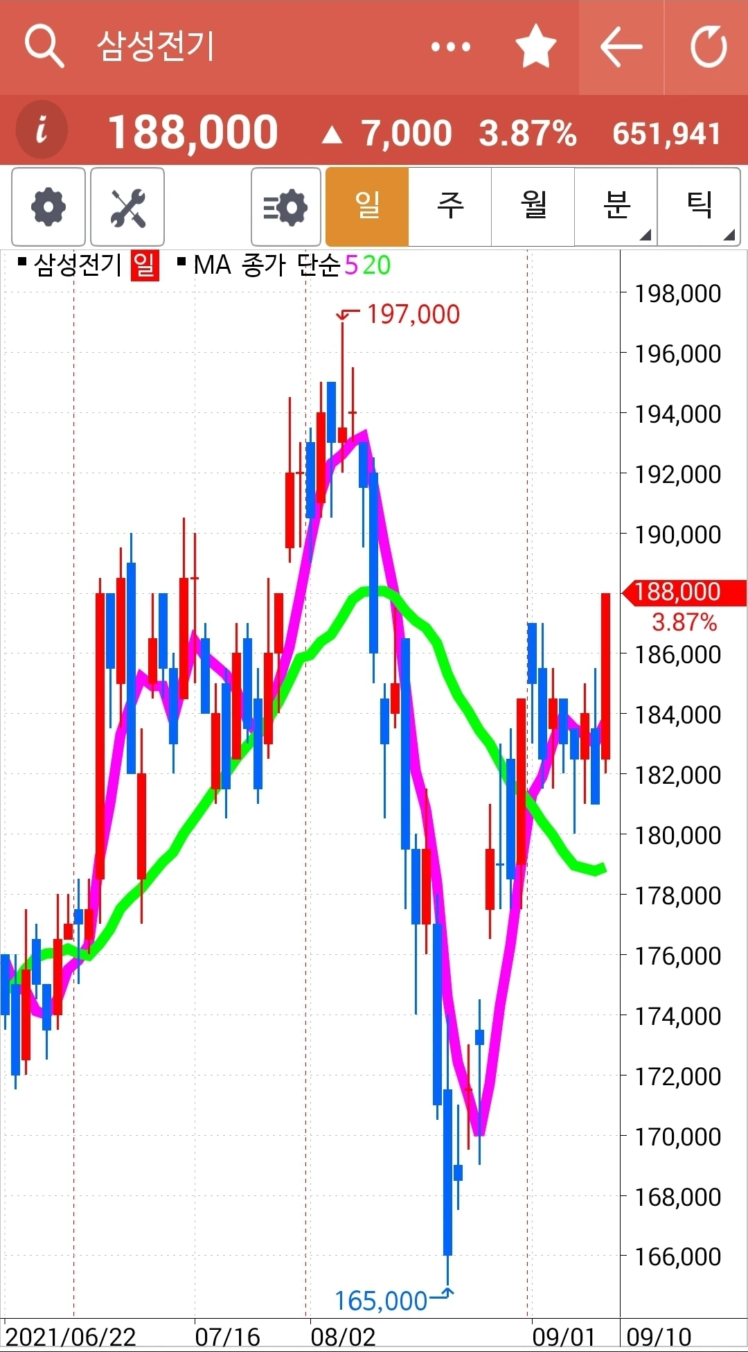 역시 골든 크로스. 즉 5일선이 20일선 위에 있는 상태는 안전하다. 기회만 되면 이렇게 빵! 올라준다. 파이팅! '난 아무것도 몰라요~ 5일선이 20일선 아래로 내려가면 매도할 뿐야요~' 요것만 할 줄 알면 된다. 그리고 난 그건 할 수 있다. 엣 헴.