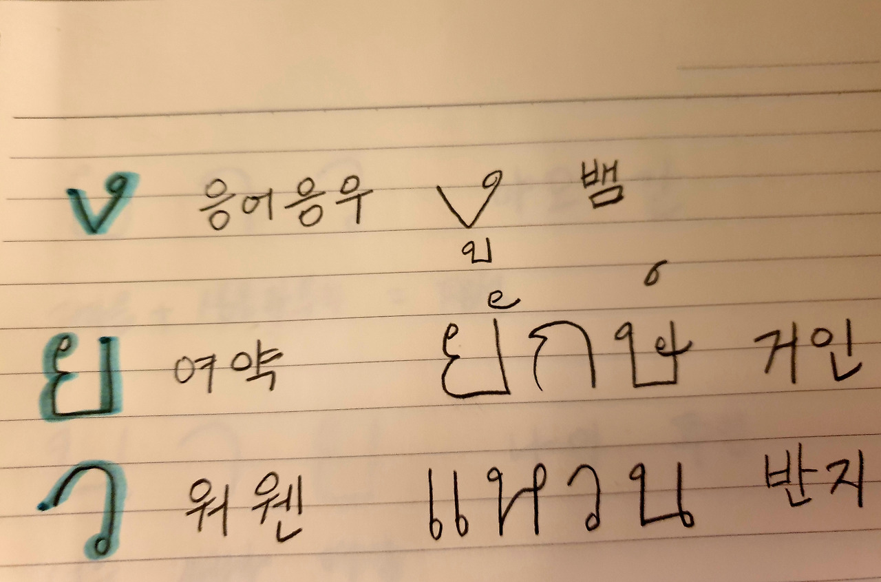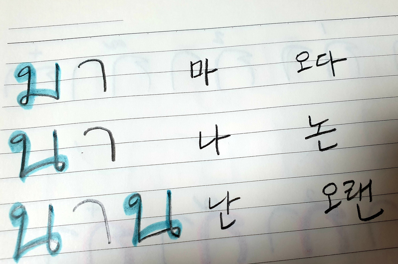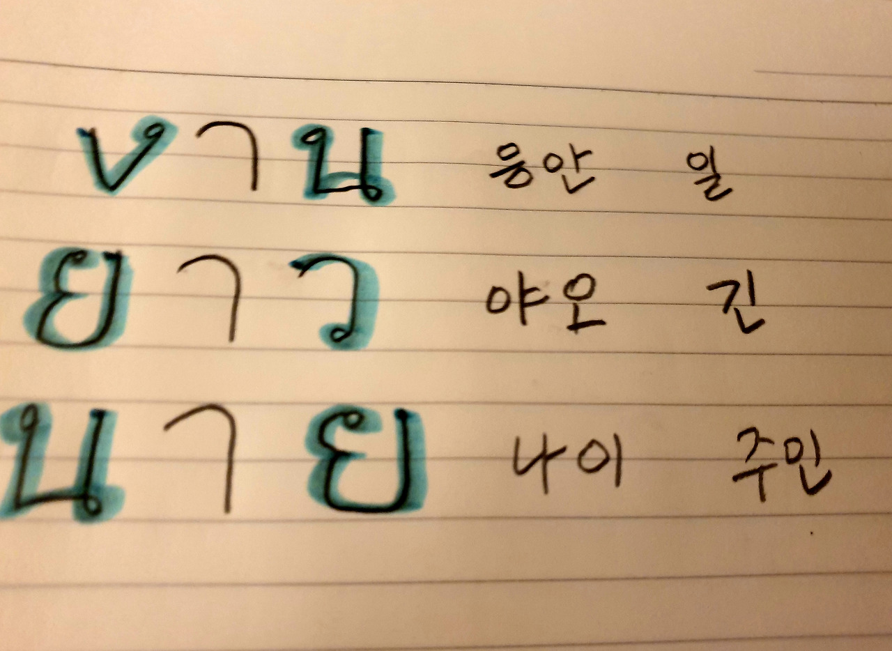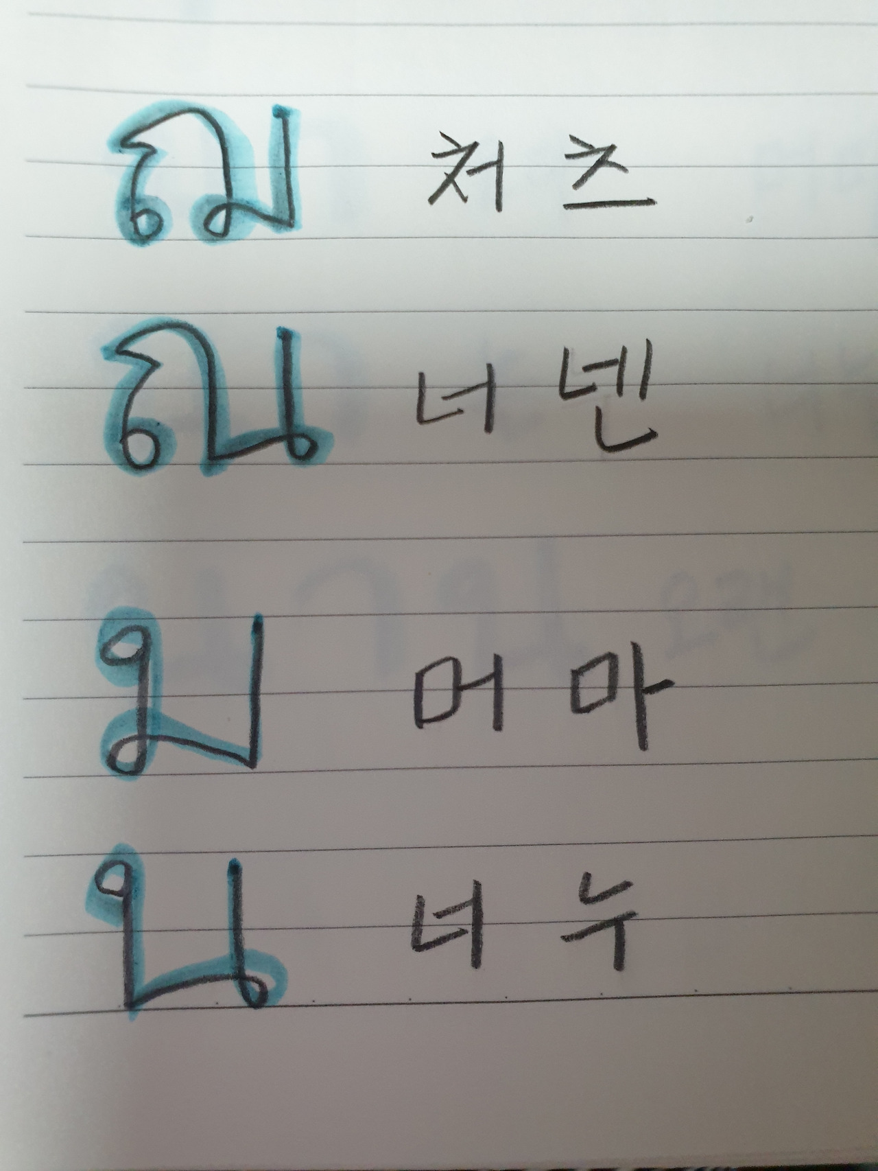 기본 문장쓰면서도 틀리게 쓰다니. 하긴 그림그리는 수준으로 했으니까. 그게 그거 같고 다 같아보였으니까. 이제야 하나하나 외우다보니까 이런 것도 발견하게 되고. 대단하다! 그러니까 지난 번에 공부한 머마와 너누 처럼 밑에 동그라미가 왼쪽에 있느냐 오른쪽에 있느냐에 따라 달라지는 것을. 하하 처츠와 머마는 동그라미가 왼쪽 밑에 너넨과 너누는 동그라미가 오른쪽 밑에!!! 오예! 대단한 걸 깨닫다. 와우!!! 이젠 절대 틀리지 아니하리라.어디 그렇다면 저자음을 다시 한번 외워볼 지어닷.