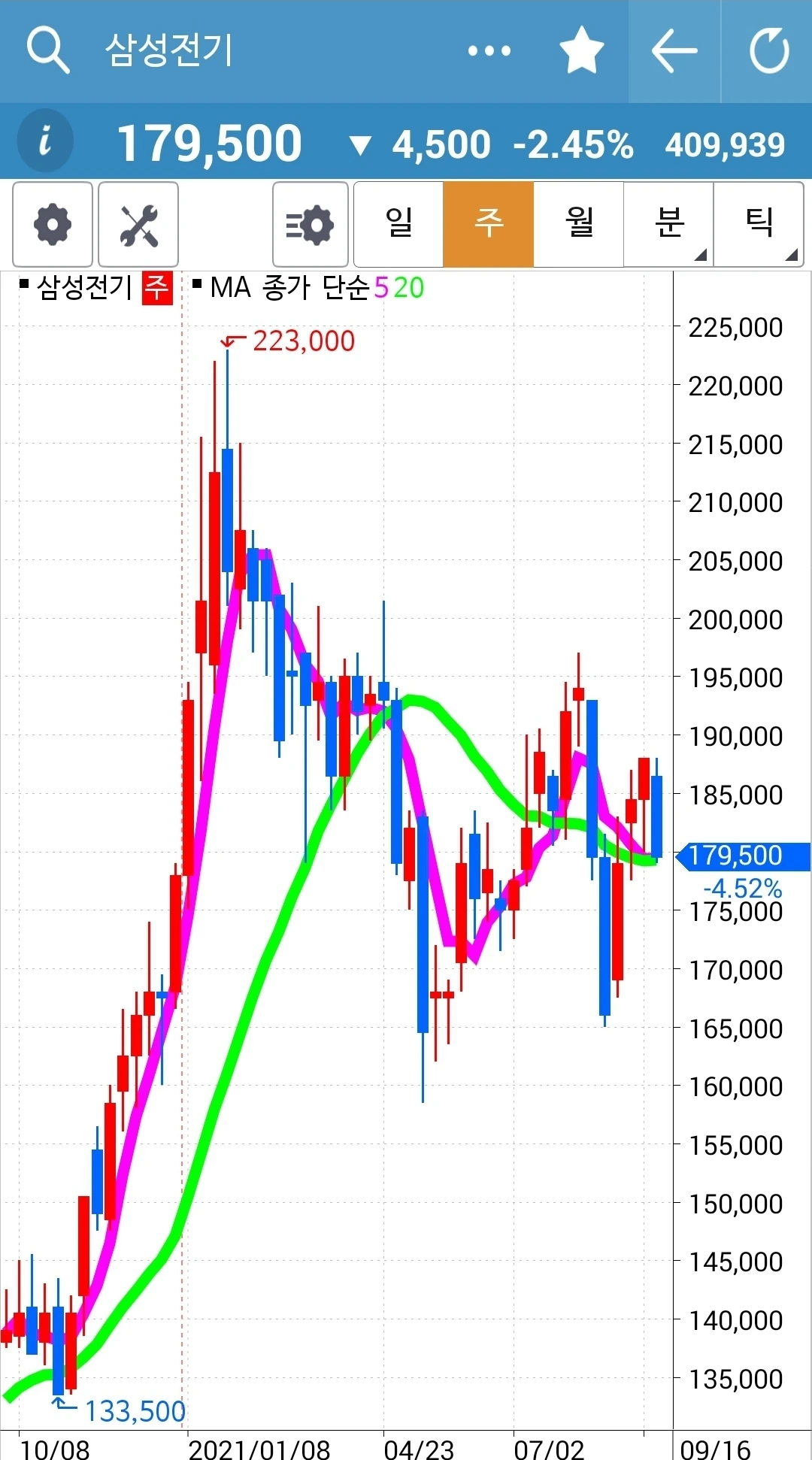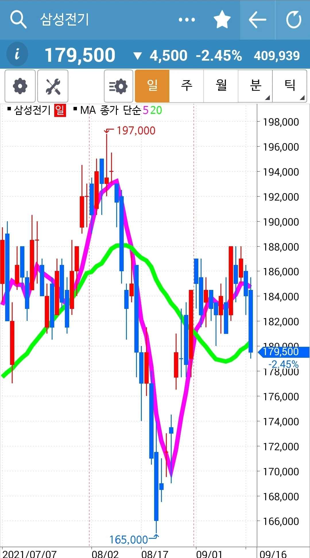 이것 역시 긴 음봉이지만 같은 이유로 건들지 않았다. 목표일은 다가오는데 목표수익은 점점 멀어지고 있다. 남편에게 큰소리 빵빵! 치고 시작했는데 큰일이다. 그래도 하릴없이 요거만 외친다. '난 아무것도 몰라요~ 5일선이 20일선 아래로 가면 매도할 뿐야요~' 파이팅!