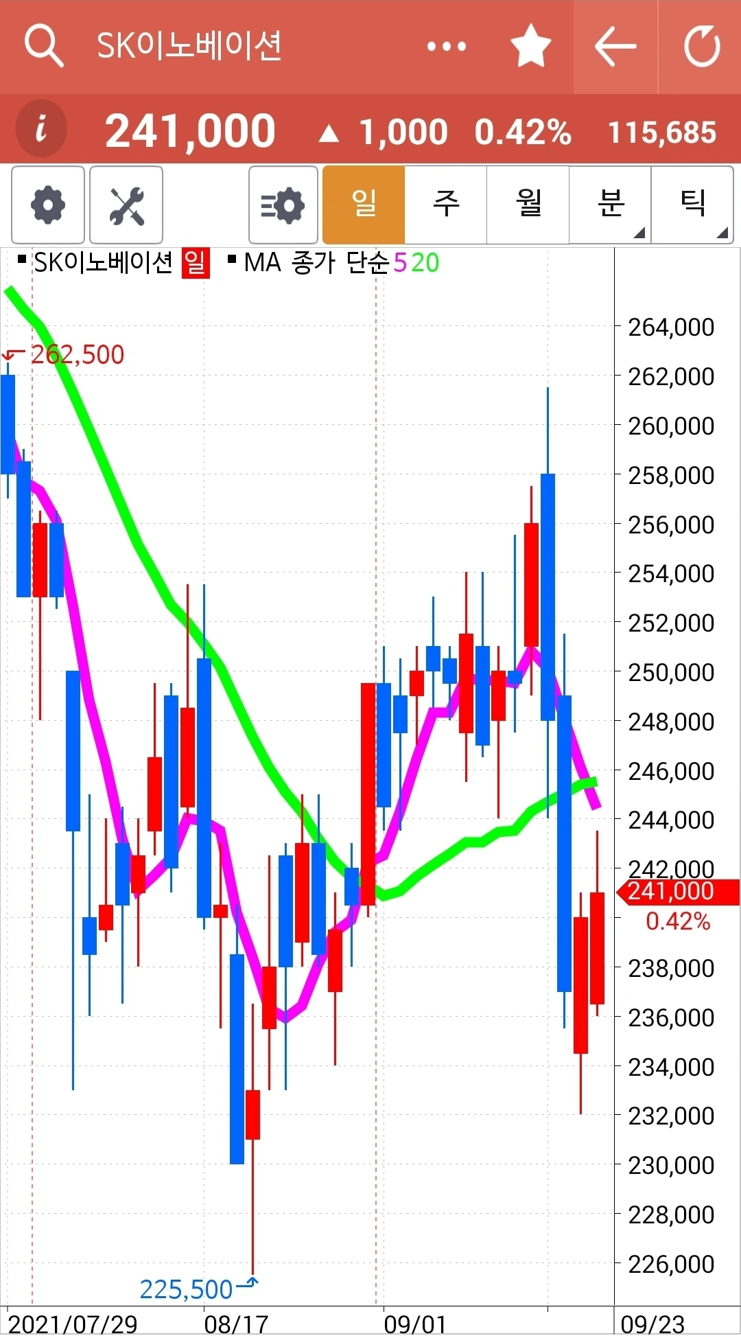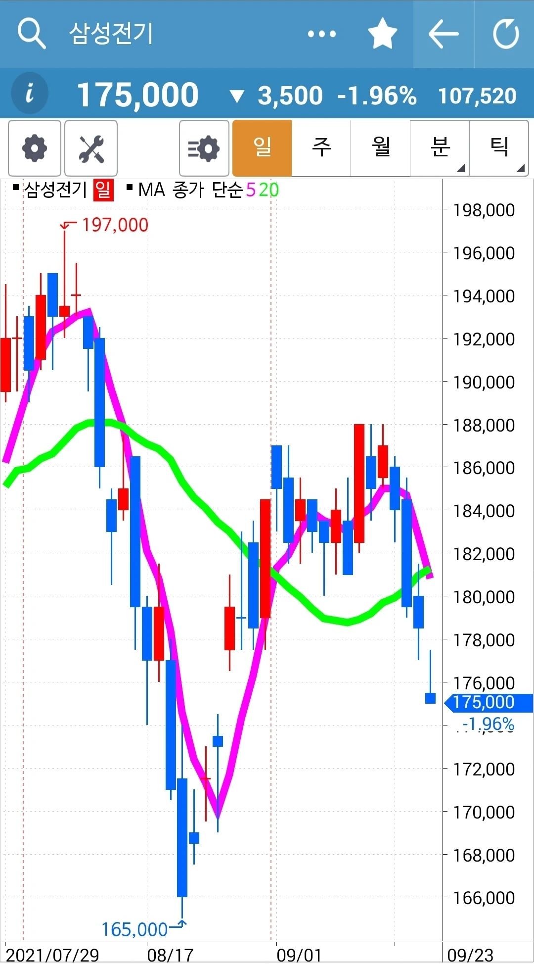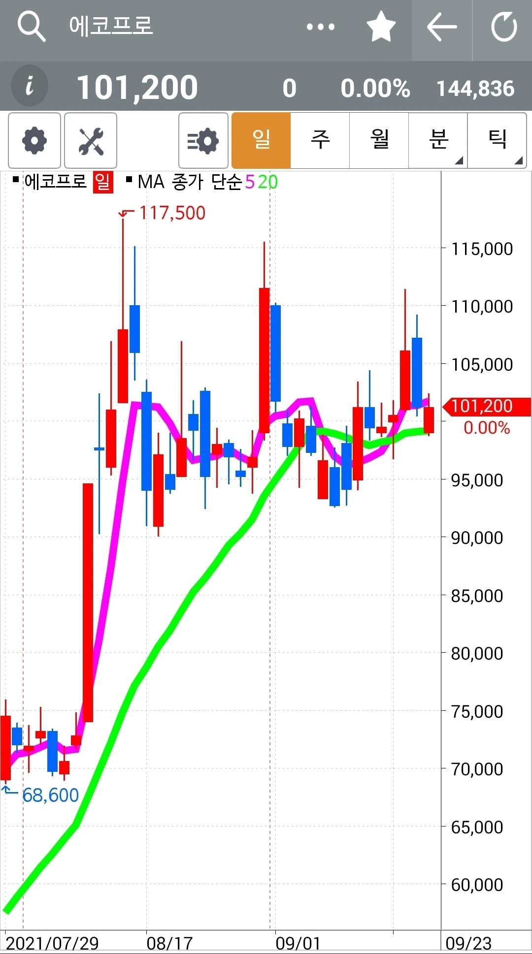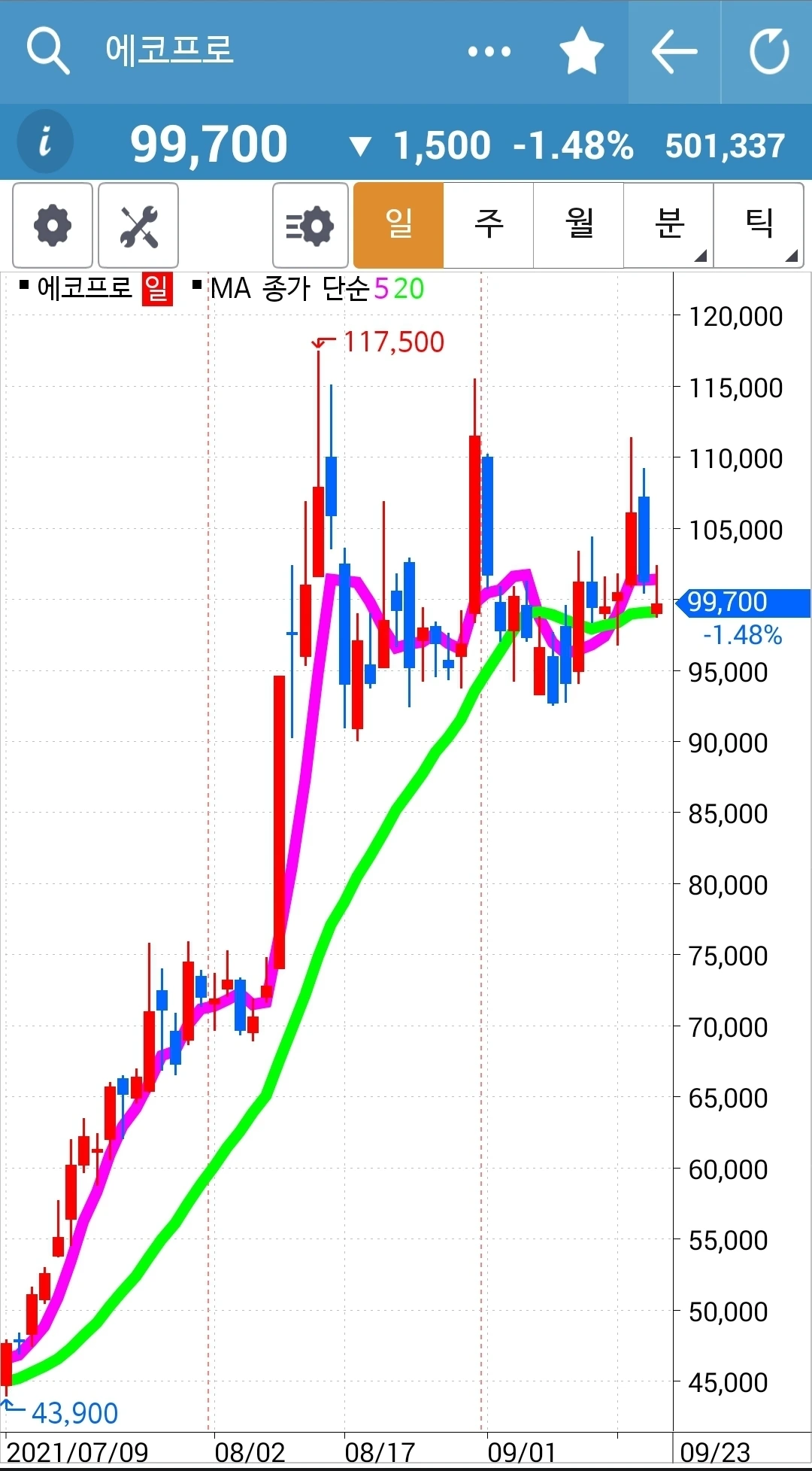 그렇다고 오메 기죽어! 온갖 불행의 기운이 몰려오도록 그렇게 축 쳐져있을 텐가! 노노노! 그건 내가 아니다. 중학교 때부터 '운명아 비켜라 내가 나간다!'라는 같잖은 소리를 외쳐대던 나 아니던가. 그래 기죽을 거 하나 없다. 와이? 난 원칙을 어기지는 않았으니까. 비록 코딱지만큼이지만 5일선은 20일선 아래로 내려갔고 그래서 정리했고 5일선이 20일선 위에 있는 것들을 샀으니까. 그래 내 잘못은 없어. 선택이 나빴다치자. 그러면 또 어떠랴. 5일선이 20일선 아래로 내려가면 그때 정리하면 된다. 그러나 하루 중 언제 매매해야 할지는 정해야 할까? 어제 만약 종가에 정리한다라는 원칙이 있었다면 매우 손실을 줄였을 것 같으니까 말이다. 그런 원칙을 세웠던 것도 같고 아닌 것도 같고 그렇다. 왜냐하면 그런 원칙을 세웠었는데 언젠가 장중에 5일선이 20일선 아래로 내려가도 종가까지 고지식하게 기다렸더니 어마어마하게 빠져 고통스러웠던 적이 있어 그런 원칙은 필요 없다고 했던 것도 같기 때문이다. 그런 경우도 많으니 종가매매를 원칙으로 정할 순 없다. 그래! 나의 원칙은 단 하나! '난 아무것도 몰라요~ 5일선이 20일선 아래로 내려가면 매도할 뿐야요~' 복잡하면 안 돼! 요거 딱 하나는 지킬 수 있다. 파이팅!