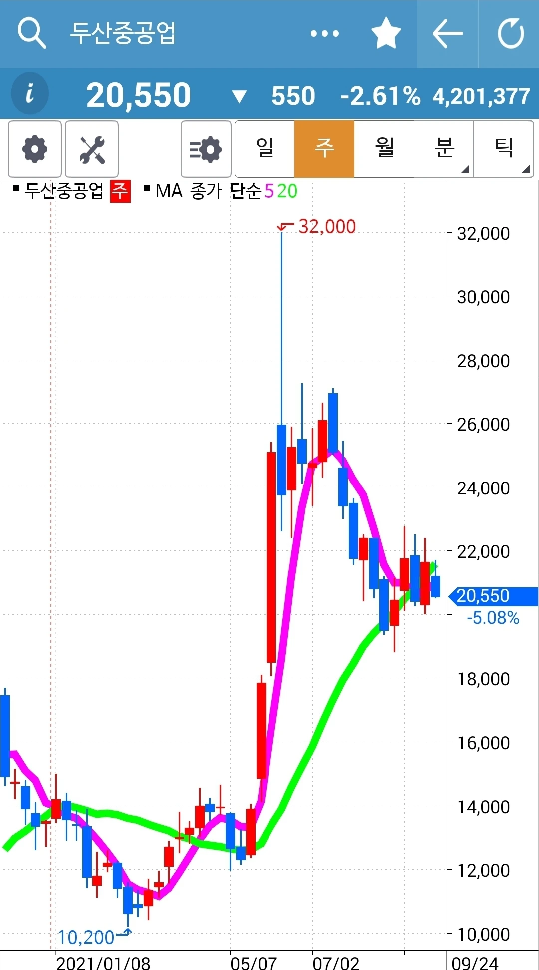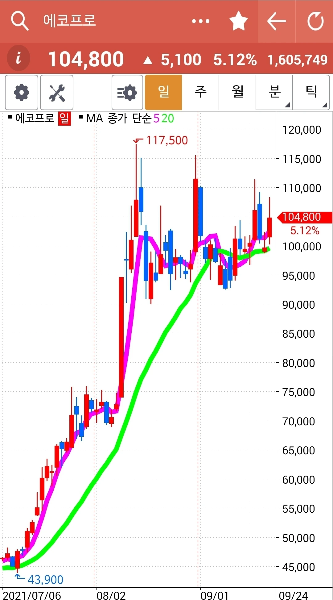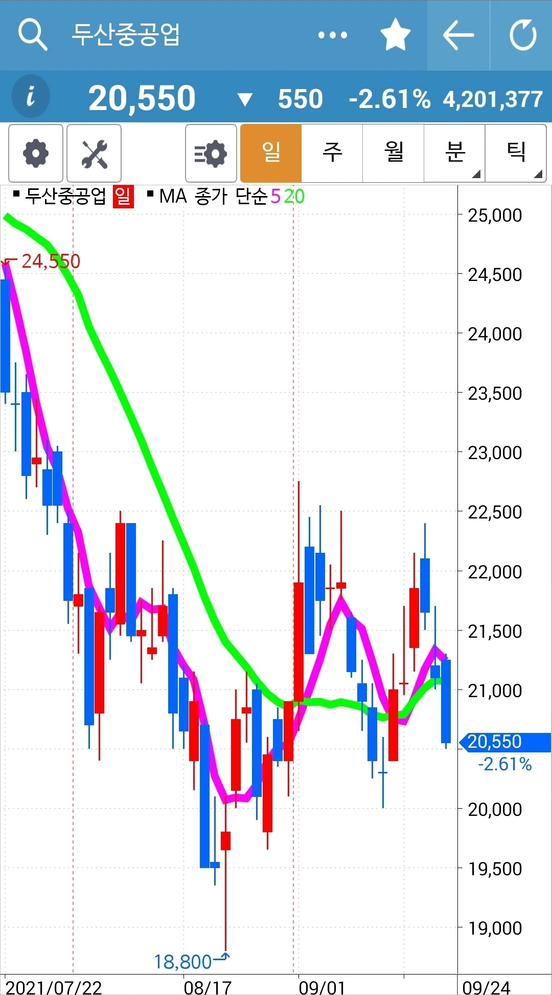 5일선이 위로 쭉 뻗으며 잘 나갈 것만 같던 그림이 이렇게 고꾸라지기도 하는구나. 아직 5일선이 20일선 밑으로 내려온 게 아니기 때문에 아무 행동 안 했다. 그러나 조만간 내려올 것 같다. 그때 정리하면 된다. 엉엉. 어쩌자고 요런 걸 골랐을꼬. 에고.
