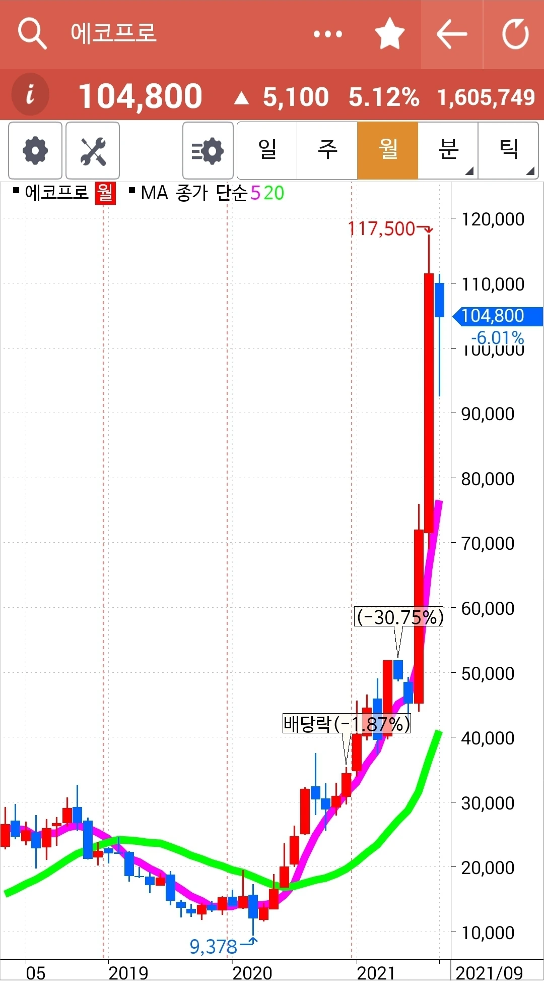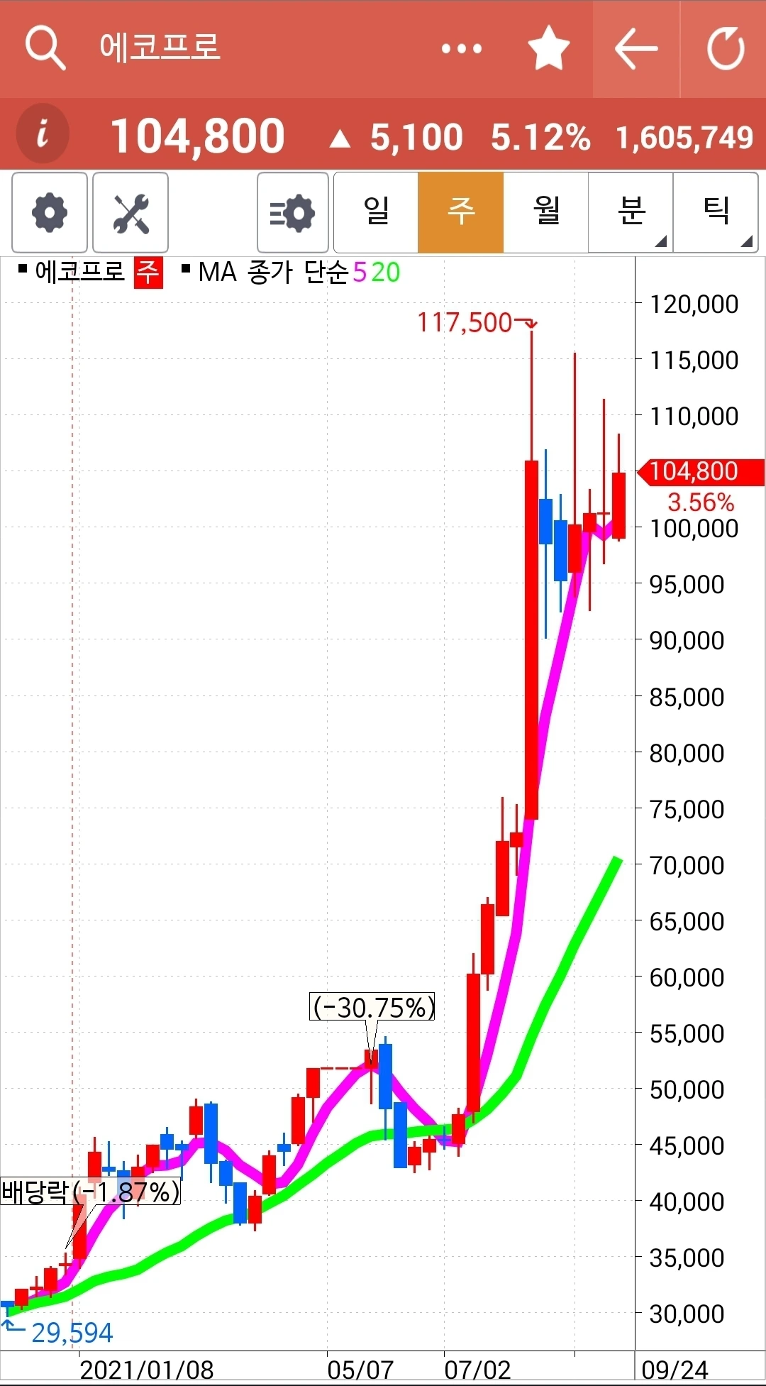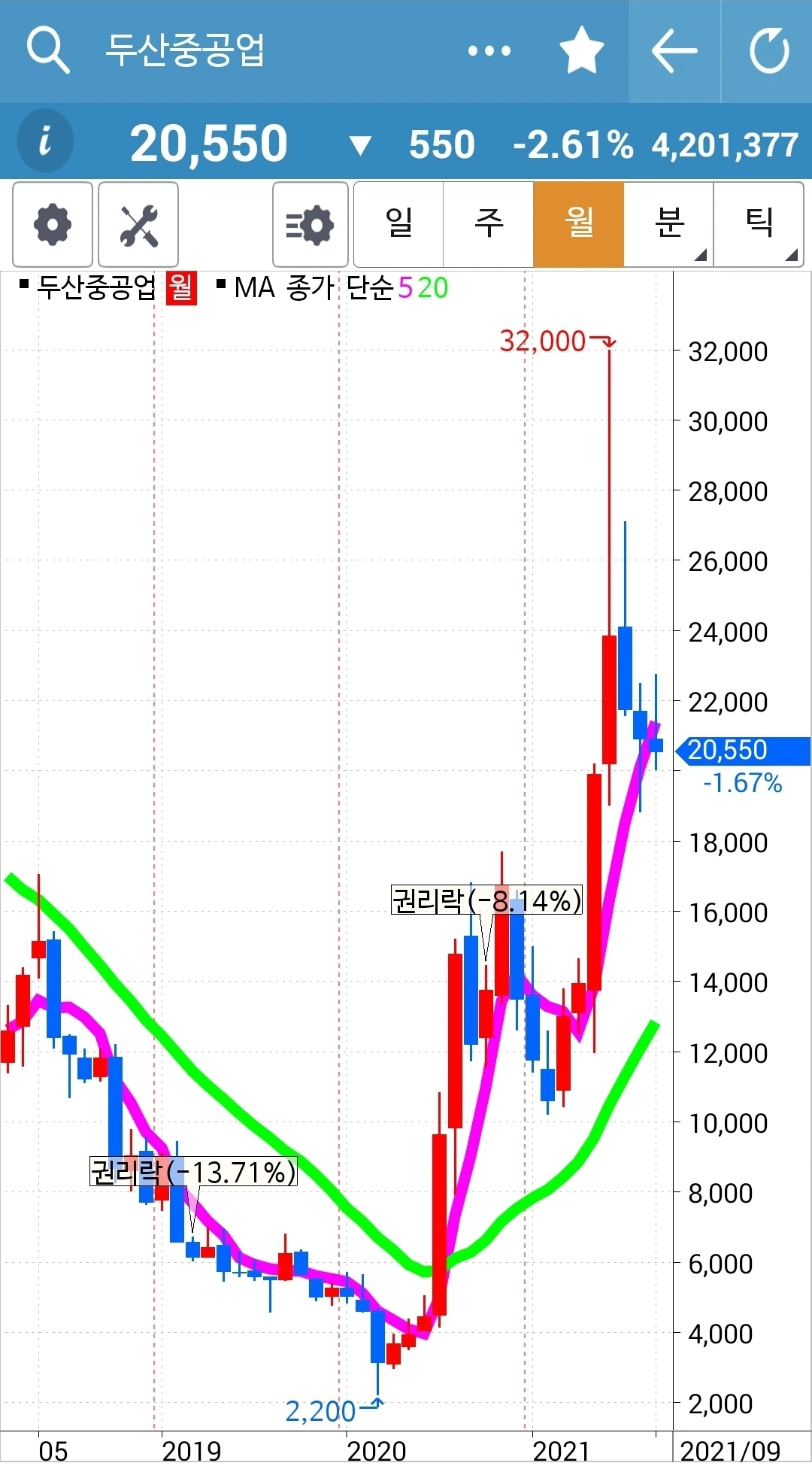5일선이 위로 쭉 뻗으며 잘 나갈 것만 같던 그림이 이렇게 고꾸라지기도 하는구나. 아직 5일선이 20일선 밑으로 내려온 게 아니기 때문에 아무 행동 안 했다. 그러나 조만간 내려올 것 같다. 그때 정리하면 된다. 엉엉. 어쩌자고 요런 걸 골랐을꼬. 에고.