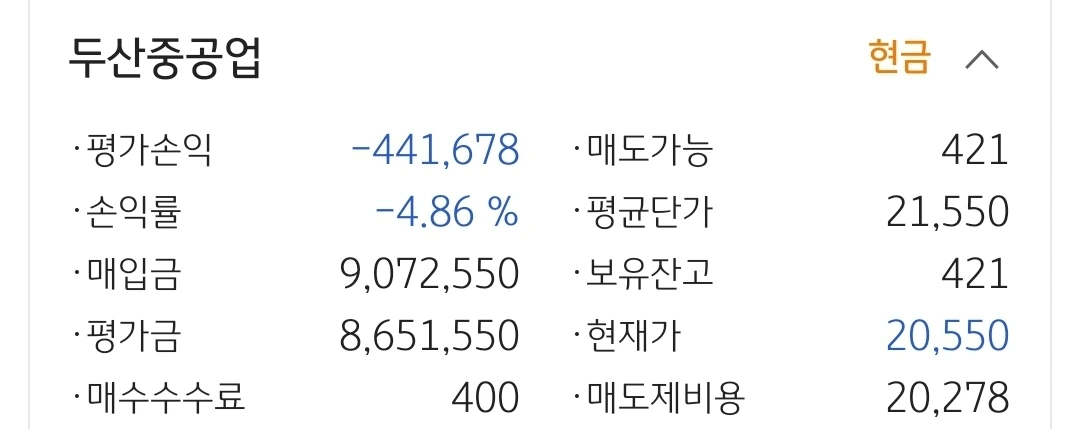 사진 2. 두산중공업. 44만 원 손실 중.