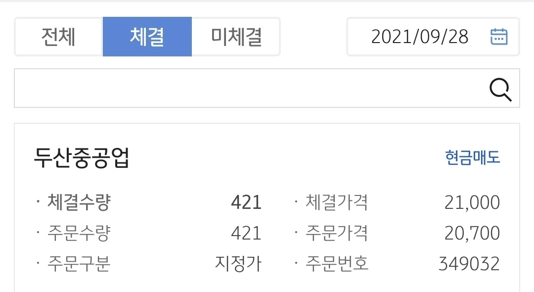 사진 2. 매도 내역. 20,700원 무조건 팔리는 값에 넣었고 21,000원에 팔렸다.