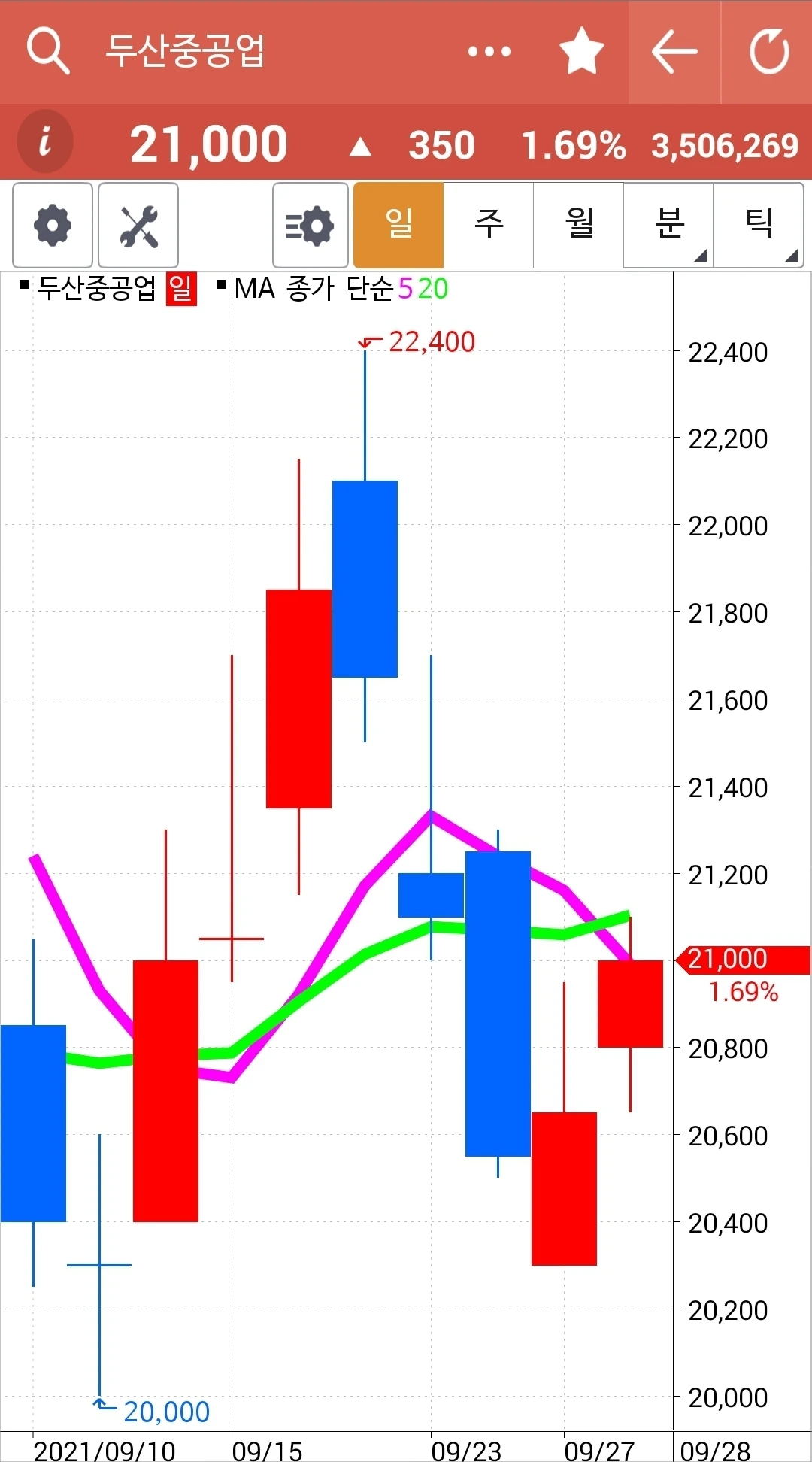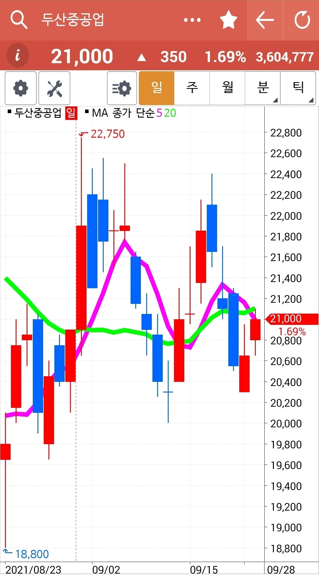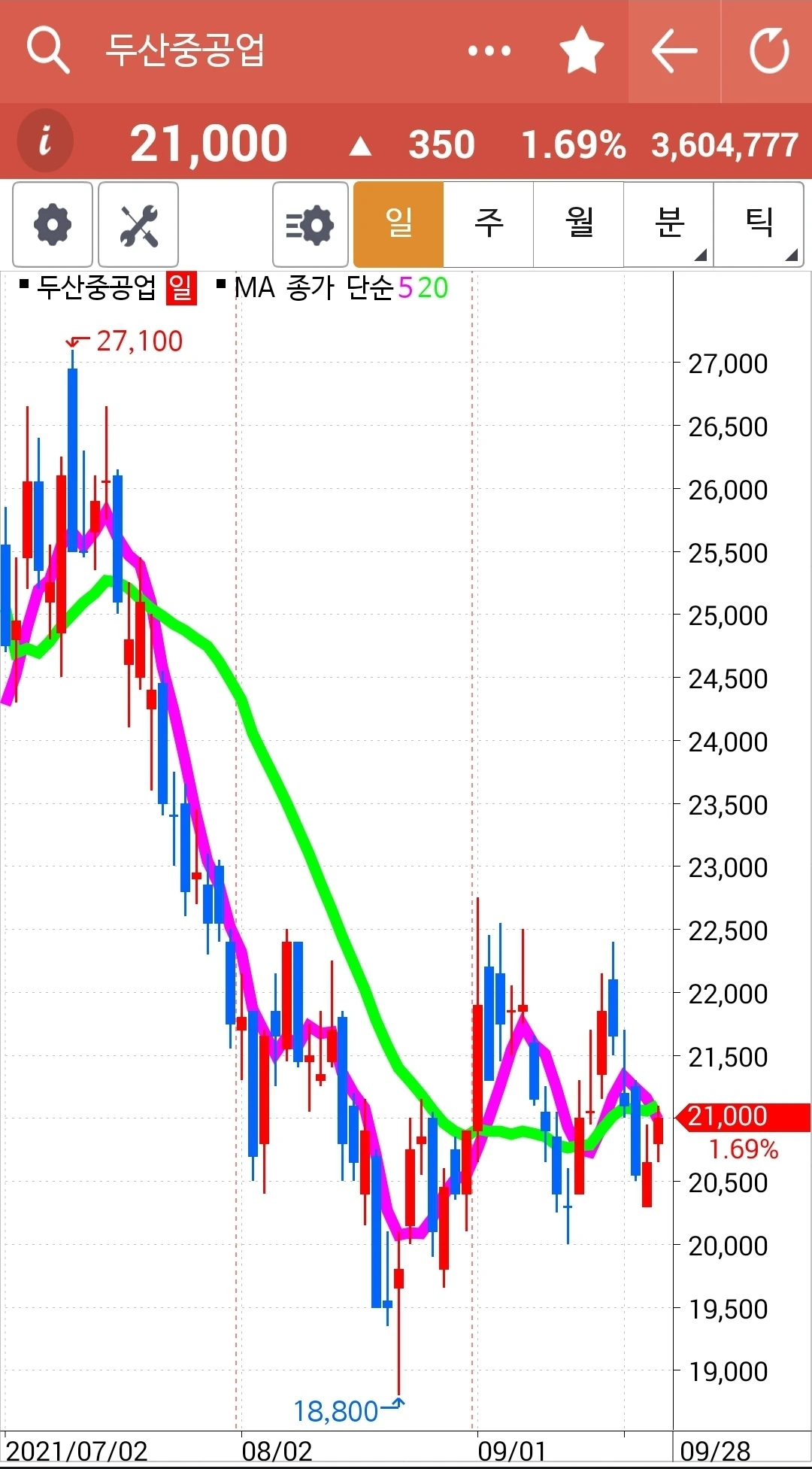 긴 음봉이지만 아직 5일선이 20일선 위에 있어 매도하지 않았다.