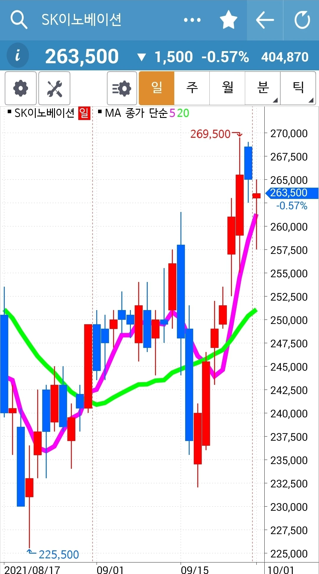 빨간 5일선이 연두 20일선 아래로 내려왔다. 그래서 매도했다. '난 아무것도 몰라요~ 5일선이 20일선 아래로 내려가면 매도할 뿐야요~'