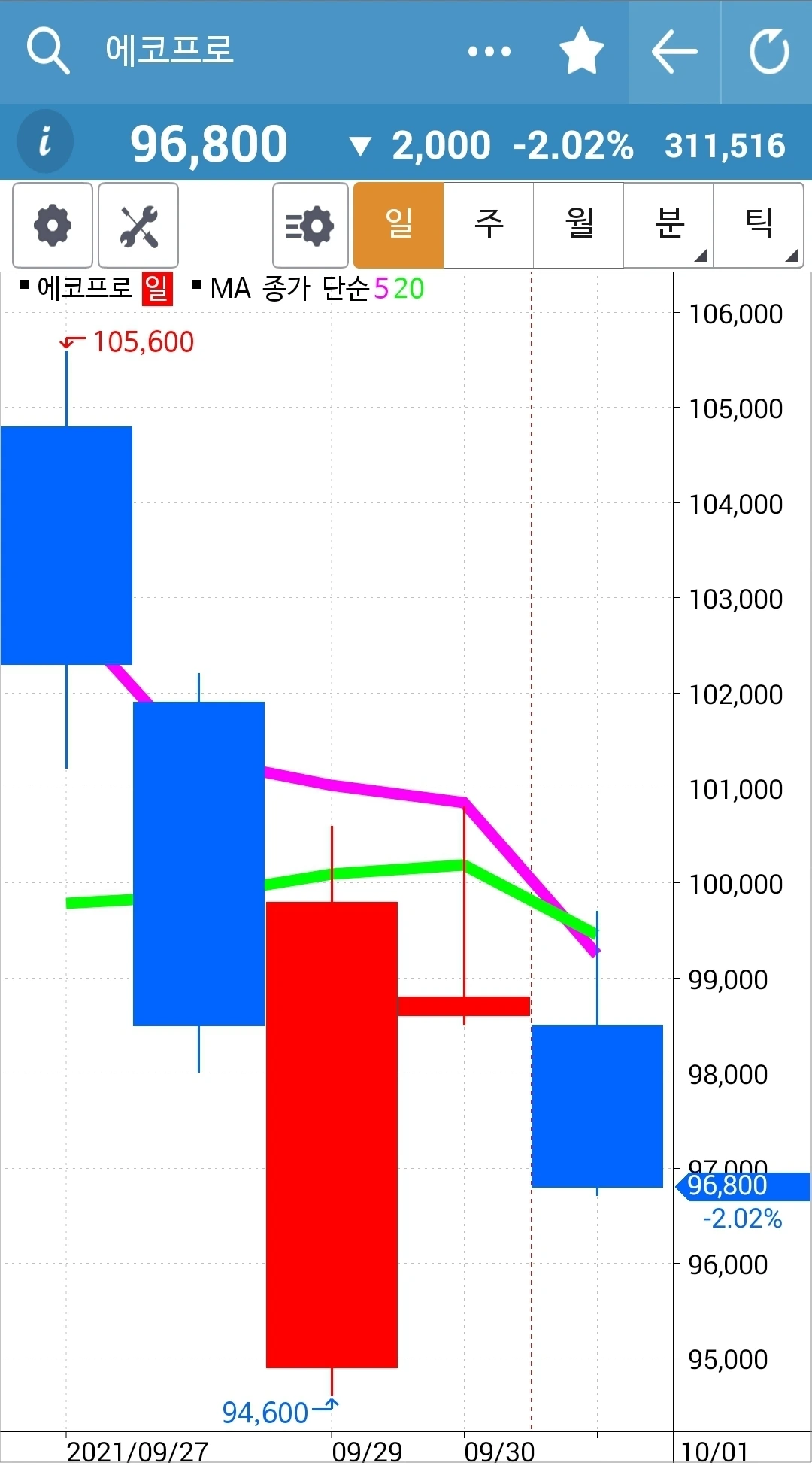 사진 2. 에코프로. 5일선이 20일선 아래로 내려가 몽땅 매도한 장면이다.