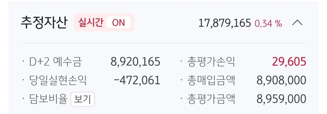 사진 1. 추정자산. 1787만 원. 원금에서 213만 원 손실 중이다.