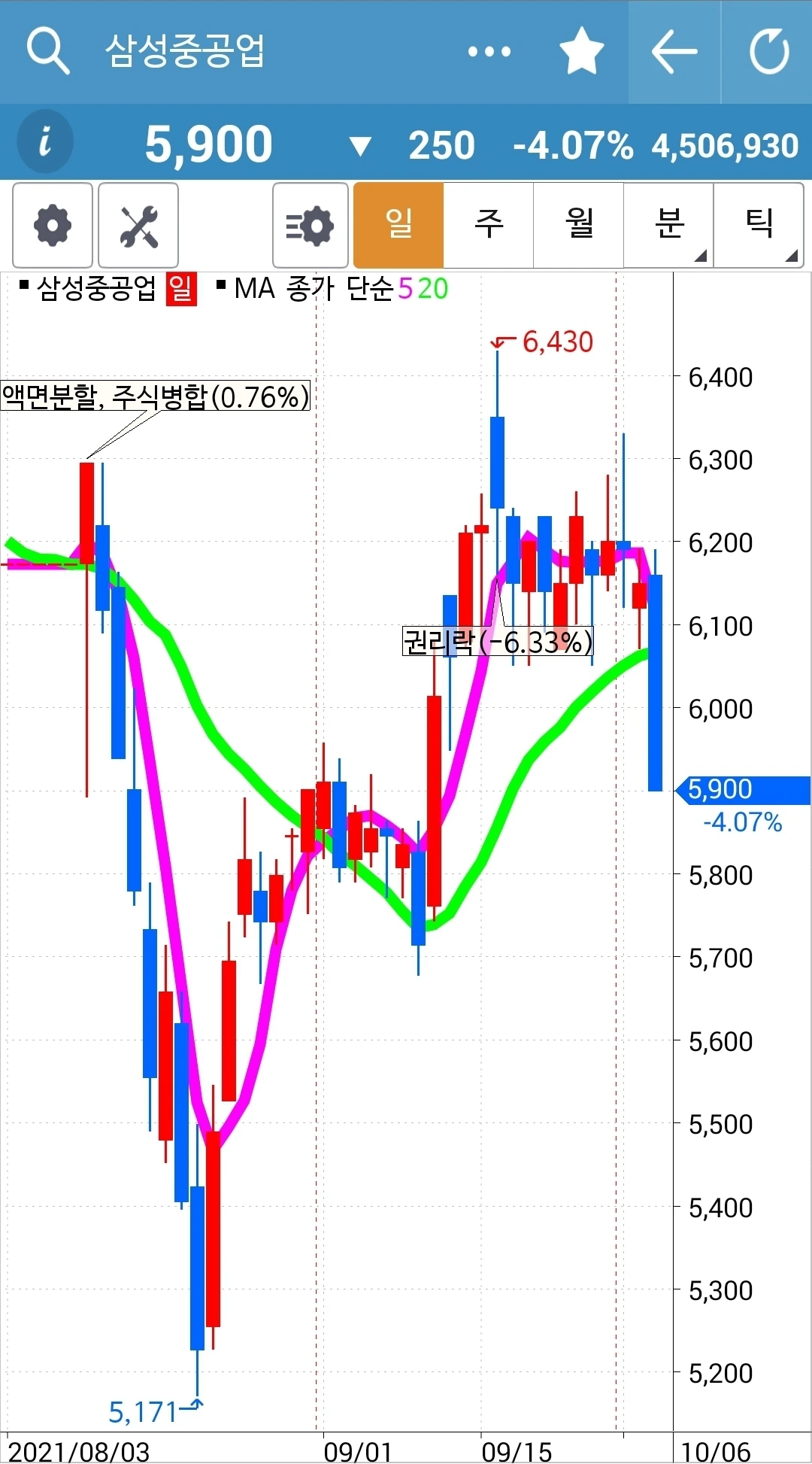 더 큰 음봉이 나왔다. 어떻게 될까. 5일선이 20일선 아래로 내려가면 나오리라. 기죽지 말자. 파이팅!