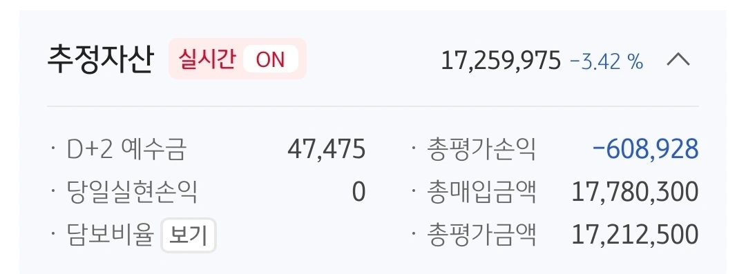 사진 1. 추정자산. 1725만 원. 275만 원 손실 중이다.