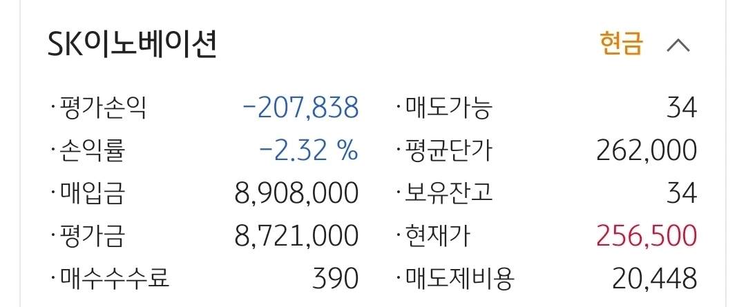 사진 2. SK이노베이션. 20만 원 손실 중.