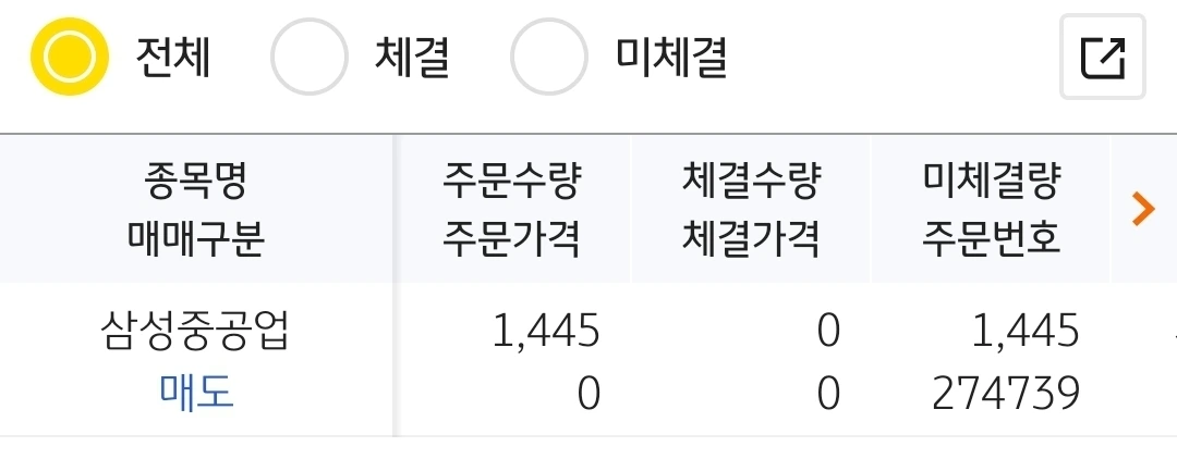 사진 2. 주문내역. 몽땅 매도를 했으나 몽땅 미체결인 상황.