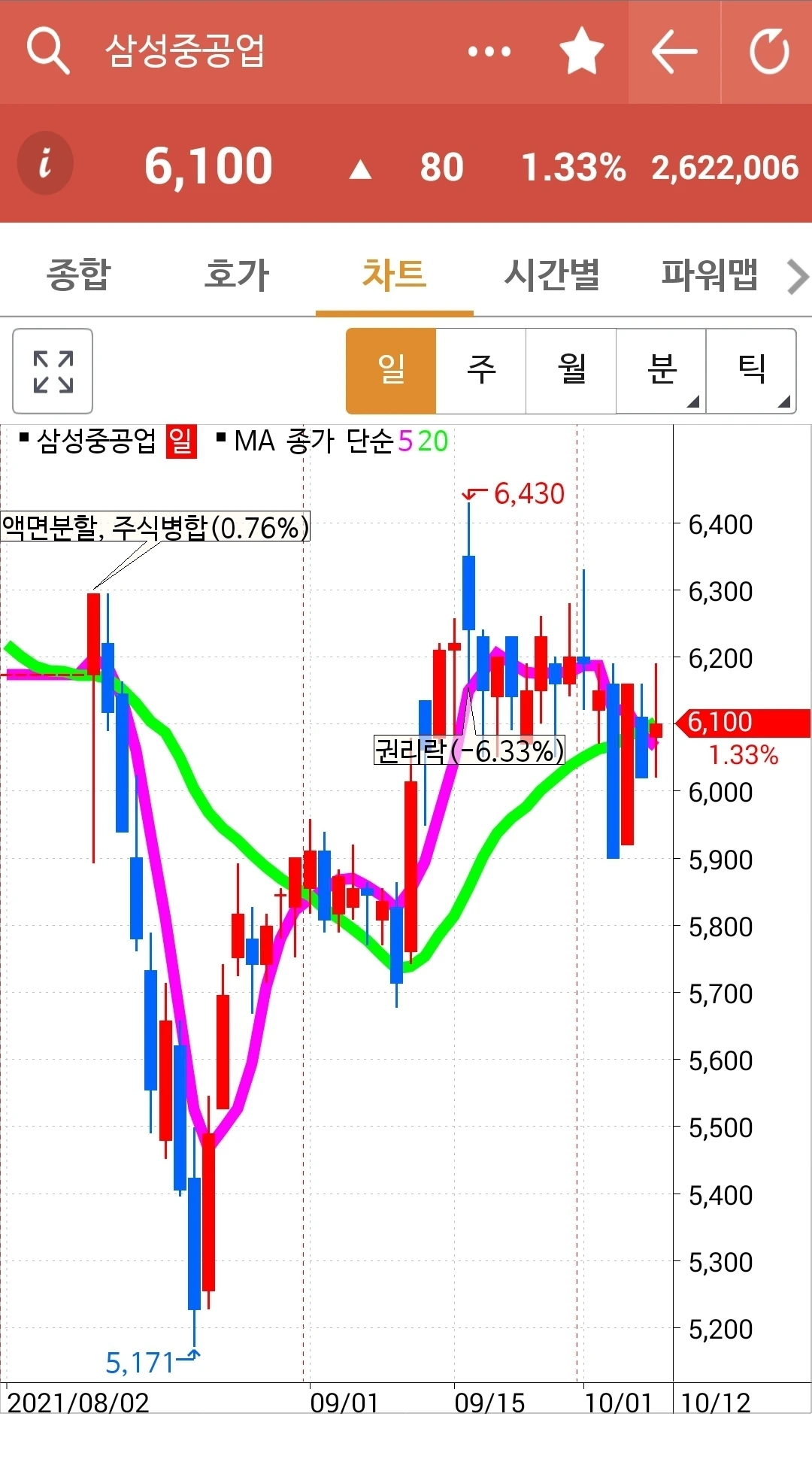 그 바쁜 중에 잠깐 장을 보았는데 이미 3시 45분이었고 장외 단일가가 실행 중이었다. 그래서 부랴부랴 주문을 넣고 나중에 보니 하나도 체결이 안되었다. 사실 그냥 차트를 보면 확실히 내려갔는지 잘 안 보인다. 무척 크게 확대를 해야 겨우 보인다. 그래서 합리화한다. 그래. 잘 안 보일 땐 하루 더! 오늘은 확실히 내려간 게 보일 테니 오늘 정리하면 된다. 파이팅!