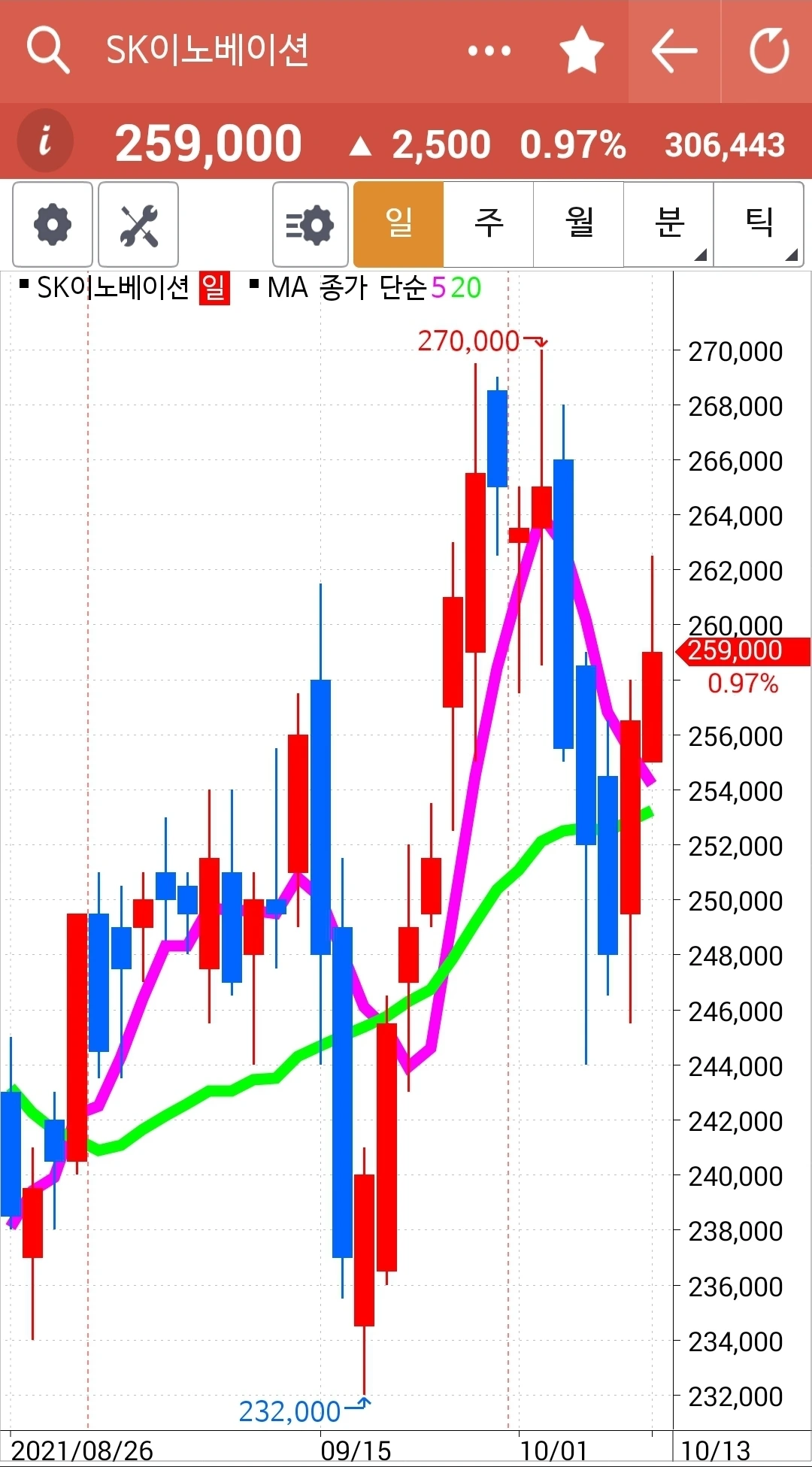 오늘도 예쁘게 양봉을 그려주며 잘 올라갔다. 5일선이 20일선 위에 있으니 내가 할 일은 없다. 난 요거만 할 줄 알면 되니까. '난 아무것도 몰라요~ 5일선이 20일선 아래로 내려가면 매도할 뿐야요~' 하하 파이팅!