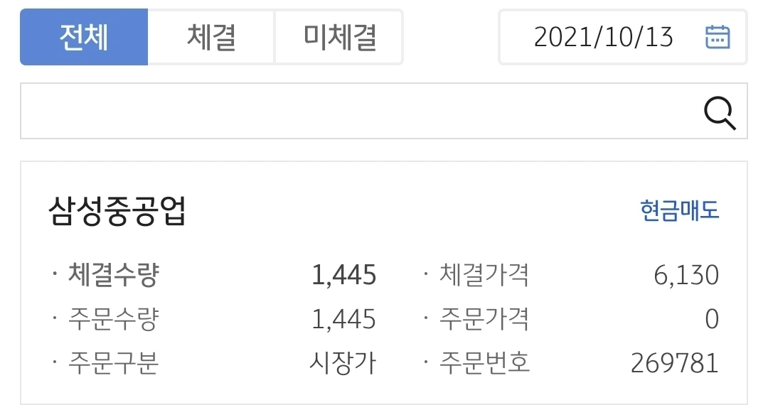 사진 3. 삼성중공업. 종가 단일가에 시장가로 내놓아 몽땅 체결된 모습.